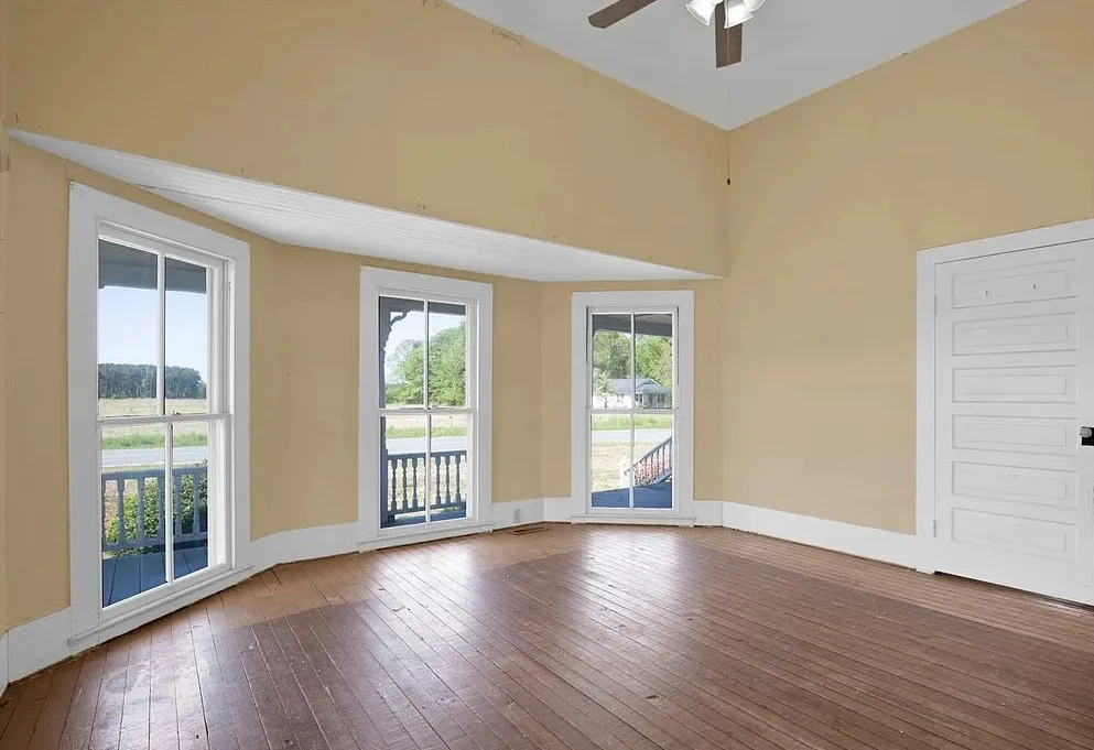 Now that is some porch! Pretty setting for this house! The home was built in 1913. It is located on one acre in Autryville, North Carolina. The house features a large wrap around porch, tall ceilings, wood floors, floor to ceiling windows, double doors, baseboards, solid wood doors with original hardware and updated bathrooms. The kitchen could use some work. There are a couple of outbuildings on the property. Three bedrooms, two bathrooms and 2,670 square feet. $240,000