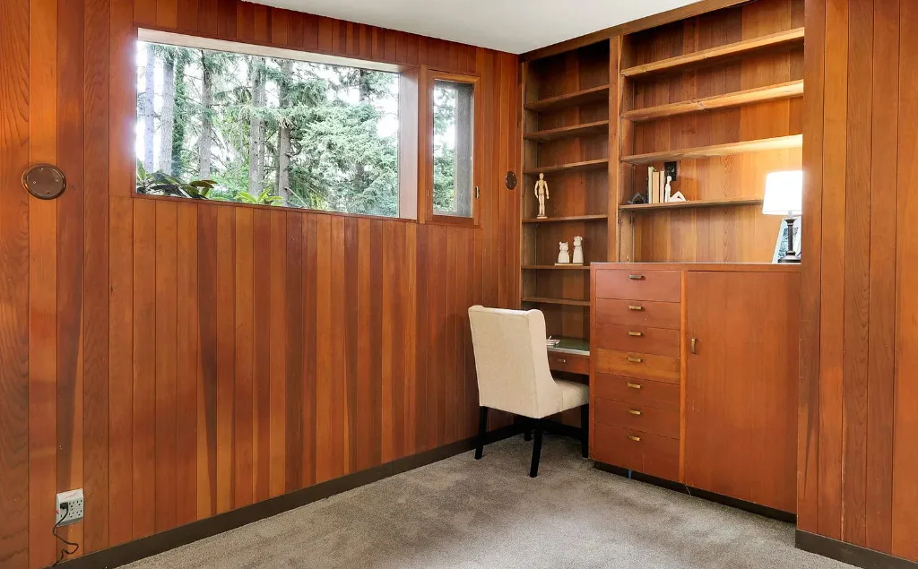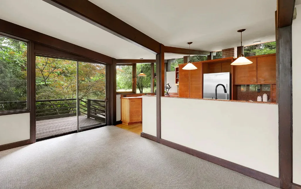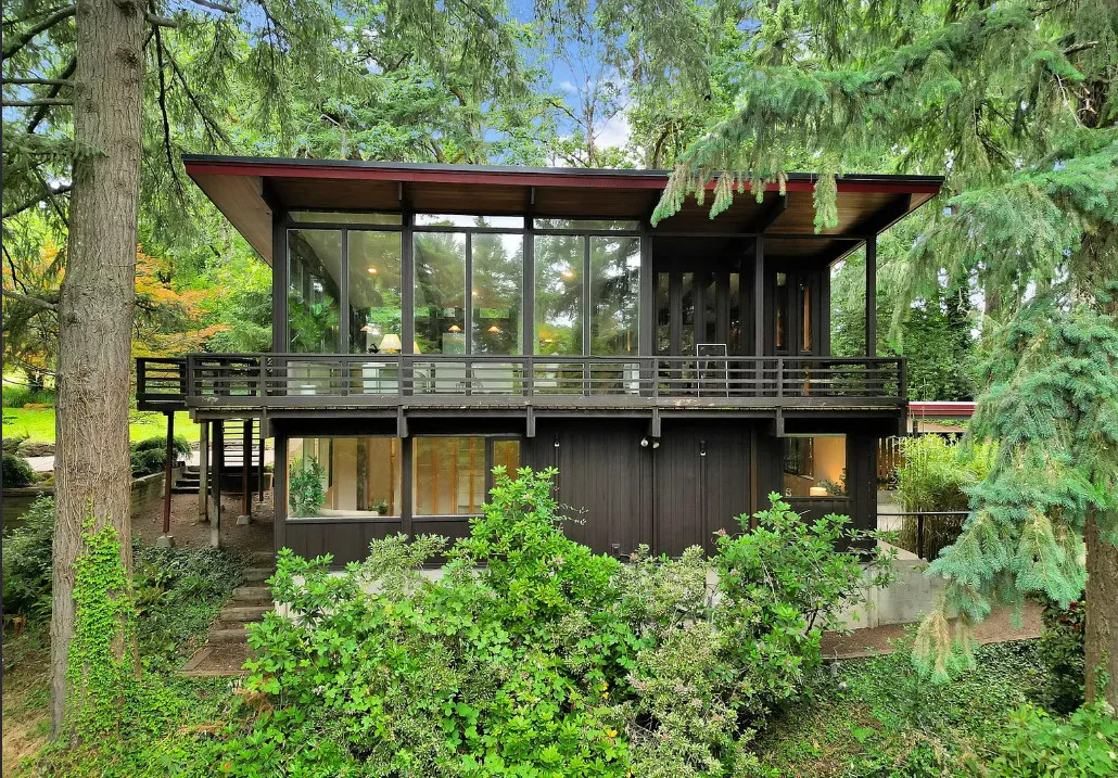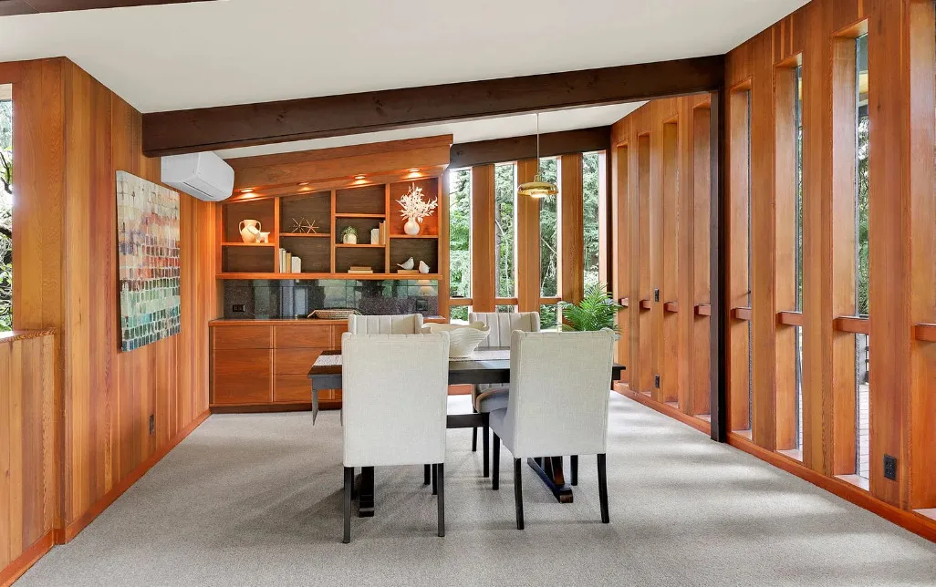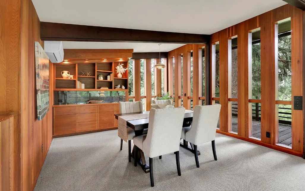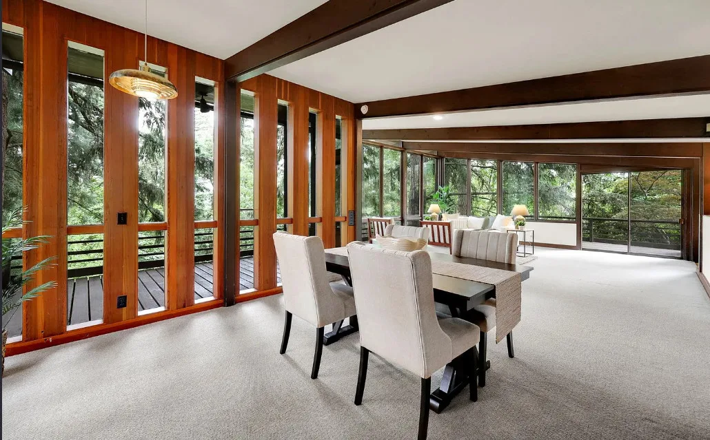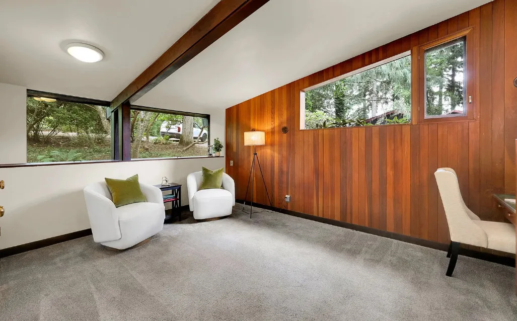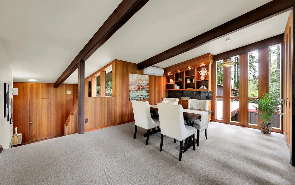 Love the windows in this mid-century modern! Would always sit there gazing out. The house was built in 1954. It is located on .66 acre in Eugene, Oregon. The house features a wrap around deck, walls of windows, exposed beams, updated kitchen, built-ins and wood floors. Four bedrooms, two bathrooms and 2,240 square feet. $795,000
