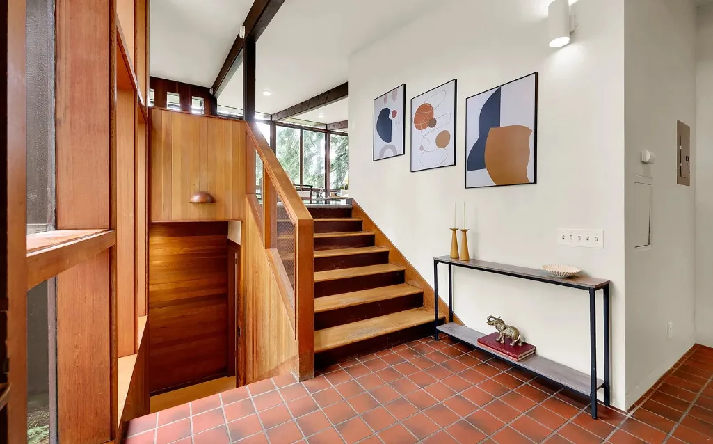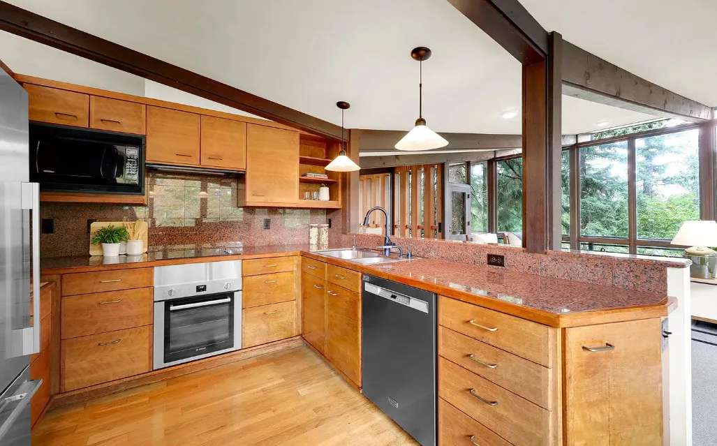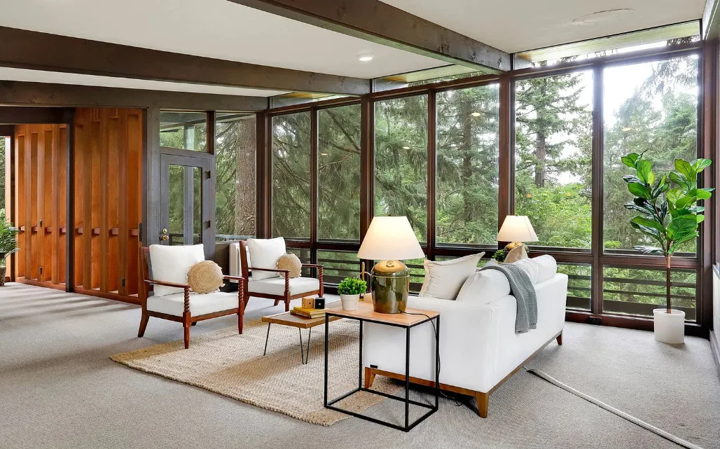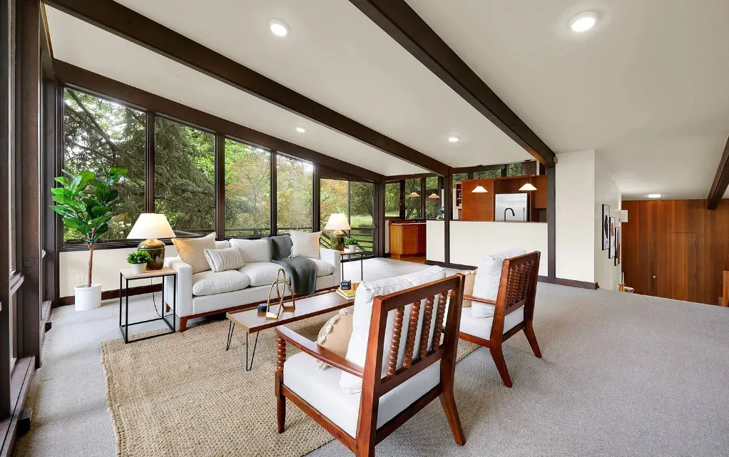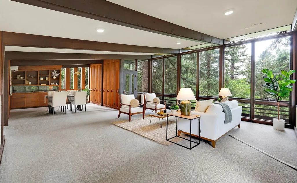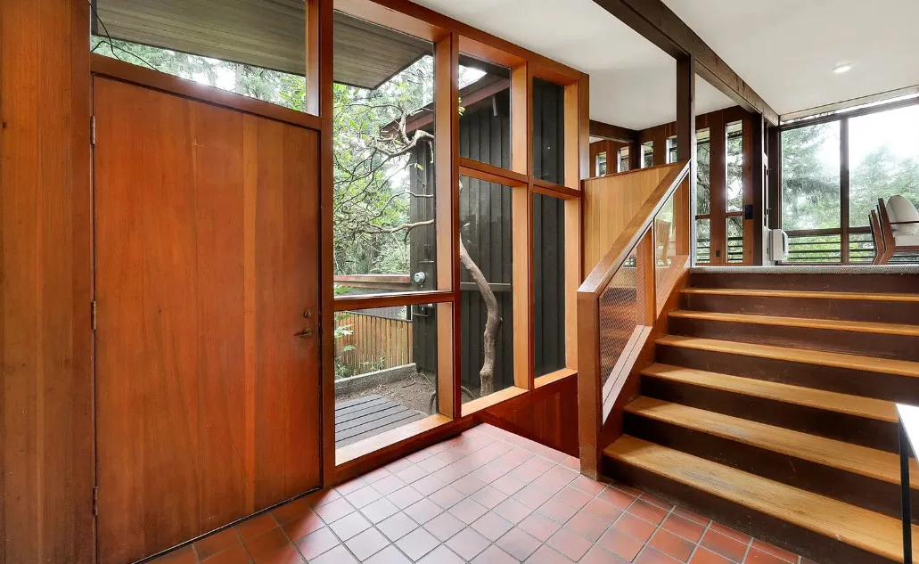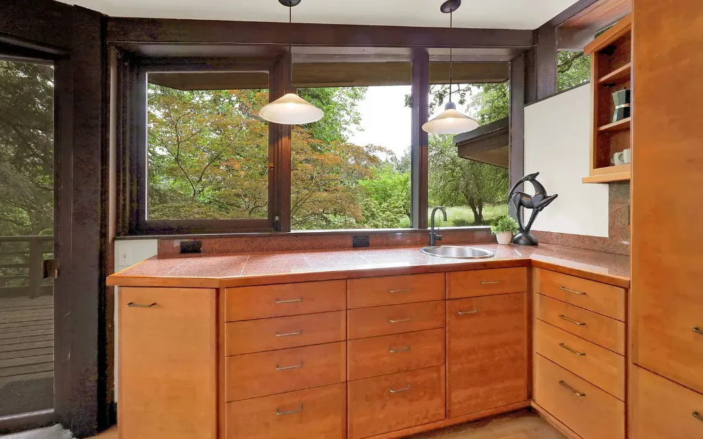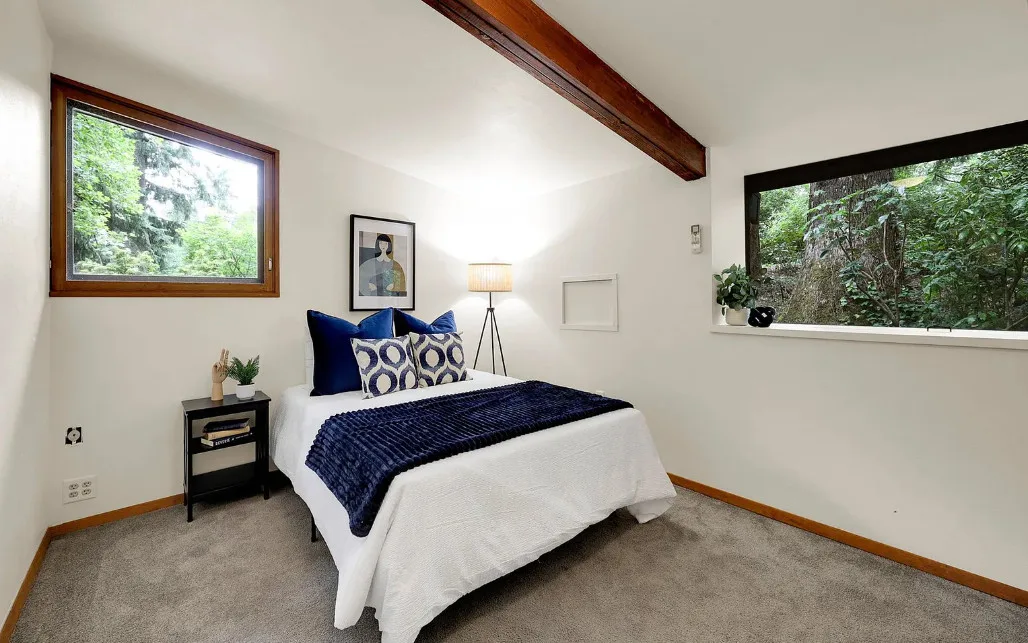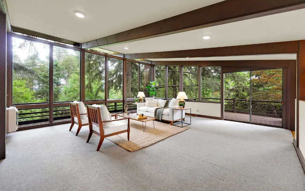 Love the windows in this mid-century modern! Would always sit there gazing out. The house was built in 1954. It is located on .66 acre in Eugene, Oregon. The house features a wrap around deck, walls of windows, exposed beams, updated kitchen, built-ins and wood floors. Four bedrooms, two bathrooms and 2,240 square feet. $795,000