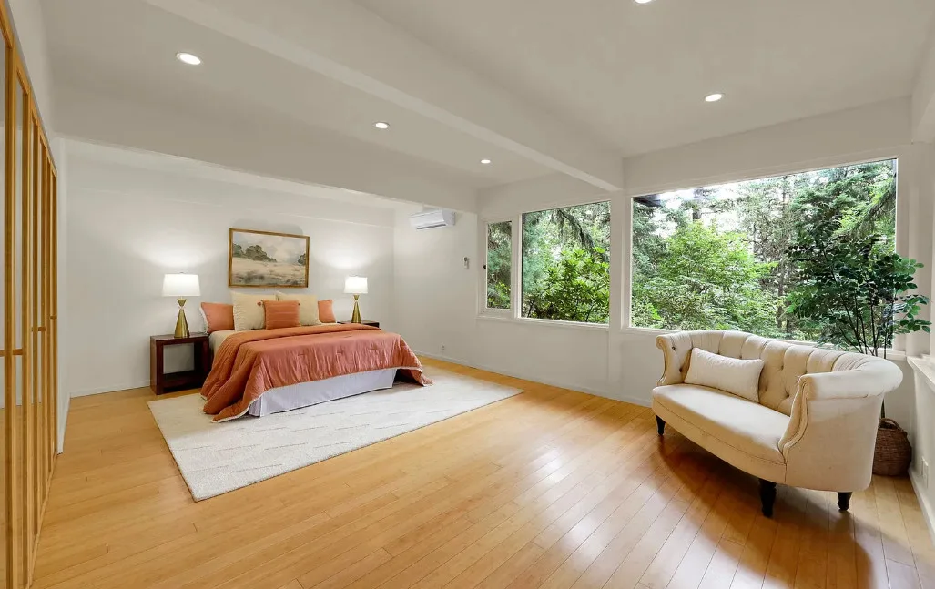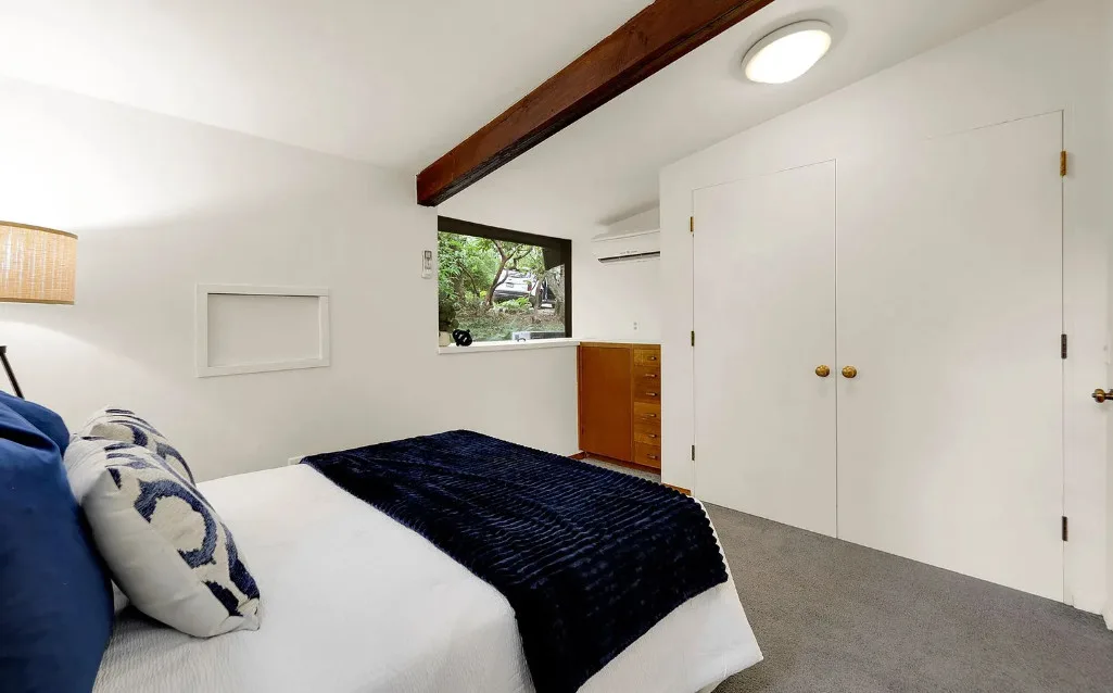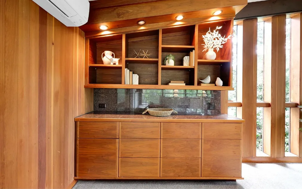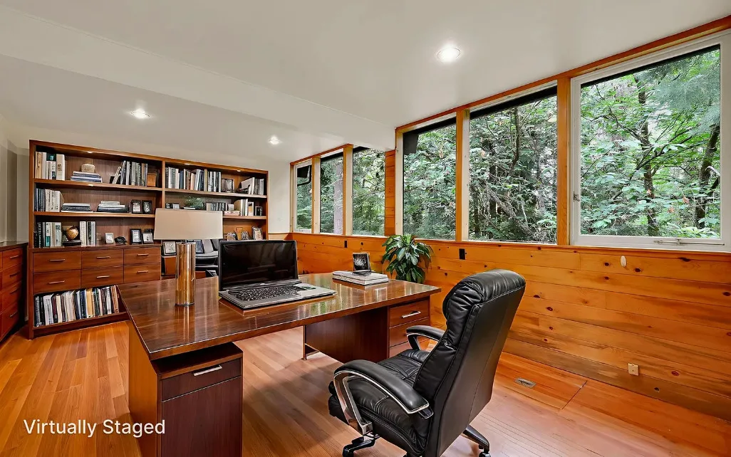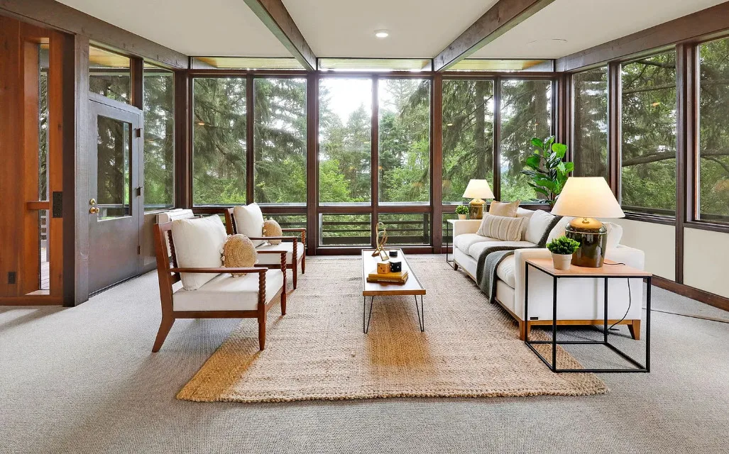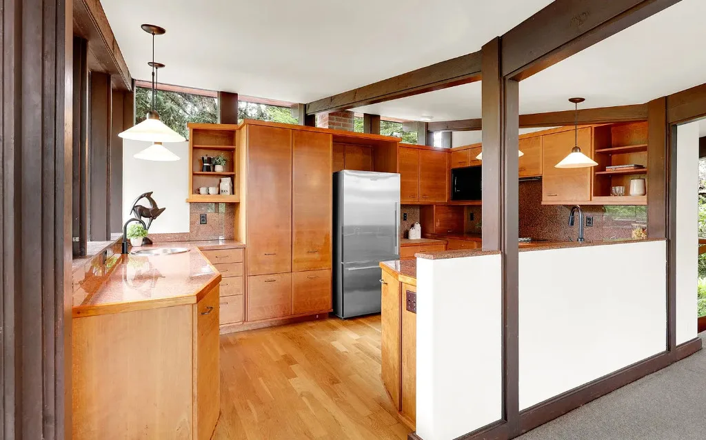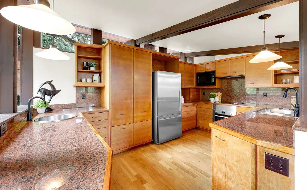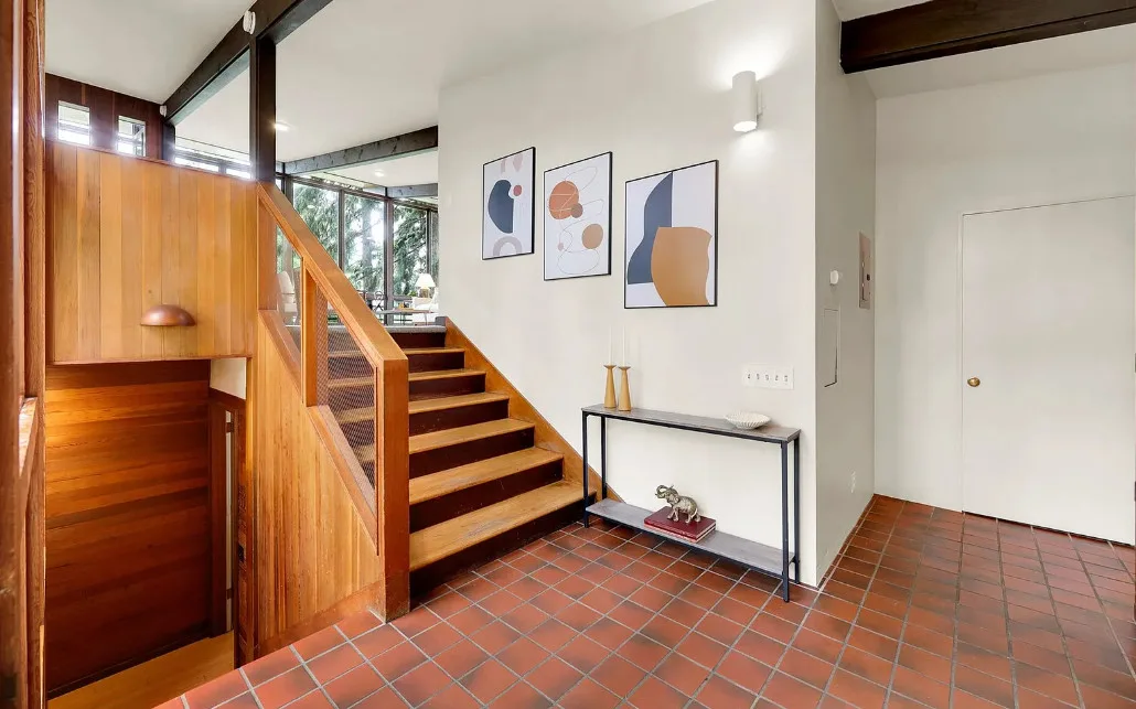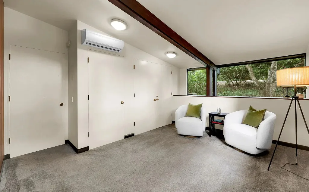 Love the windows in this mid-century modern! Would always sit there gazing out. The house was built in 1954. It is located on .66 acre in Eugene, Oregon. The house features a wrap around deck, walls of windows, exposed beams, updated kitchen, built-ins and wood floors. Four bedrooms, two bathrooms and 2,240 square feet. $795,000
