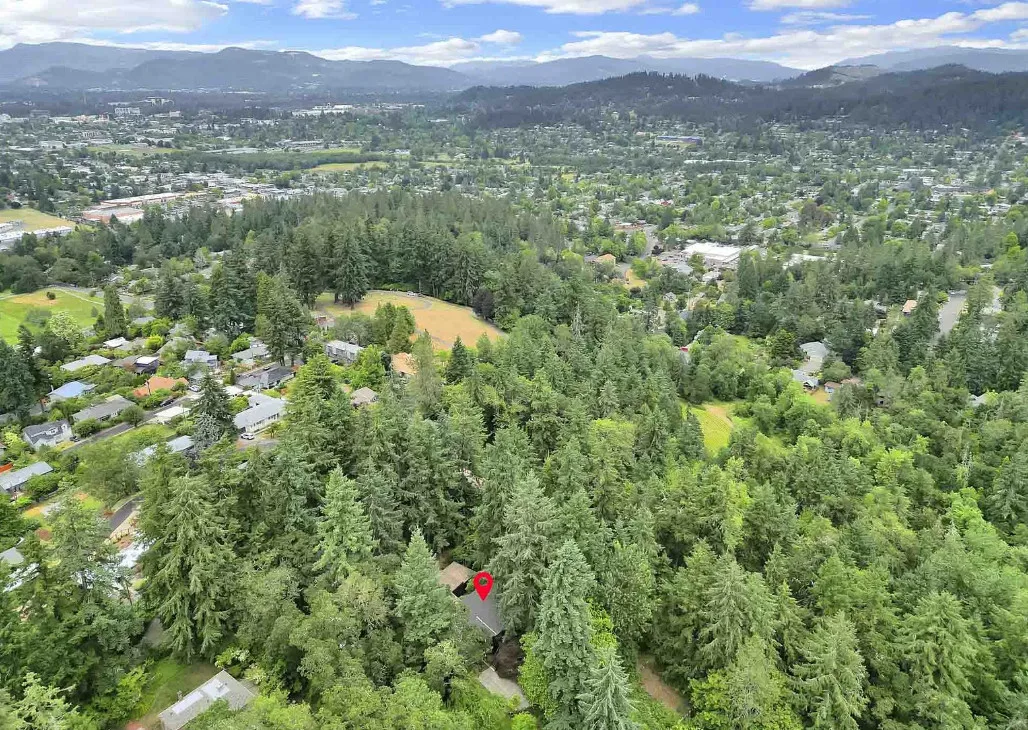 Discover the perfect blend of mid-century modern design and natural beauty in this spacious, one-of-a-kind home tucked into a private, forested setting right in town. Surrounded by mature trees and lush greenery, the home offers a peaceful sense of seclusion while still being conveniently close to parks, shopping, eateries and South Eugene schools. Open, light-filled layout featuring dramatic beamed ceilings, walls of windows offering tranquil views trees and nature. The open-concept kitchen is perfect for both everyday living and entertaining, complete with stainless steel appliances, cooktop, built-in oven, plenty of counter space that easily flows into the living and dining areas. Lovely expansive primary suite with oversized windows bring in natural light and peaceful treed views, ensuite bath with beautiful tile, soaking tub, separate shower. Step outside to an expansive patio, perfect for relaxing or hosting guests among the trees. The home offers four bedrooms and two full baths, with a combination of tile and wall-to-wall carpeting, as well as charming built-in features that showcase its mid-century character. A detached private office/studio provides flexible space for creative work, guests, or a quiet retreat, while the carport and separate shop add even more functionality. This is truly a rare property.