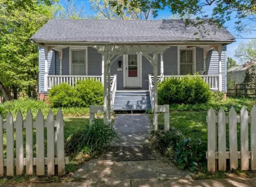 This house has such a pretty setting! Nice outbuildings! The house was built in the late 1800’s. It is located on 21 acres in Sutherlin, Virginia. The house features a picket fence, a large back deck, a covered patio, nice staircase, some wood floors, baseboards, bead board, crown moulding and wainscoting. There are multiple outbuildings on the property. There is also a small pond and a small stream. Three bedrooms, two bathrooms and 2,696 square feet. $400,000 New price: $395,000