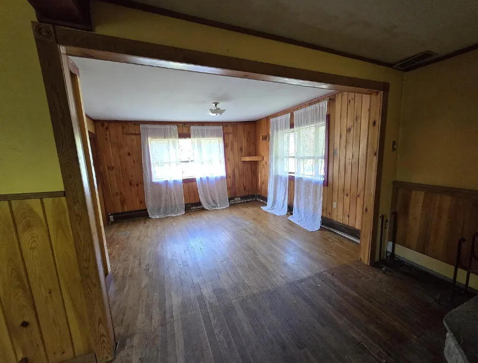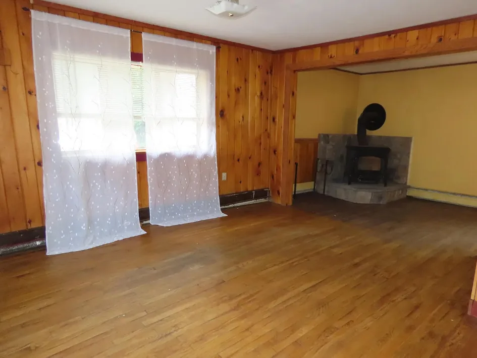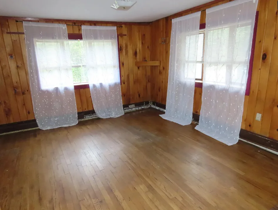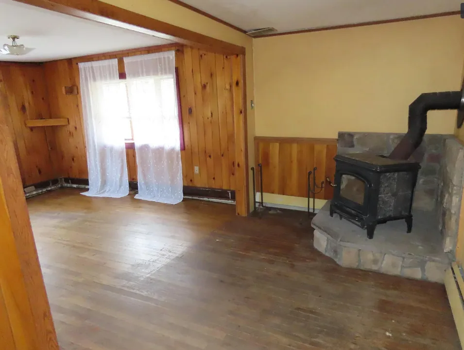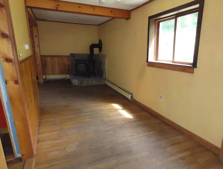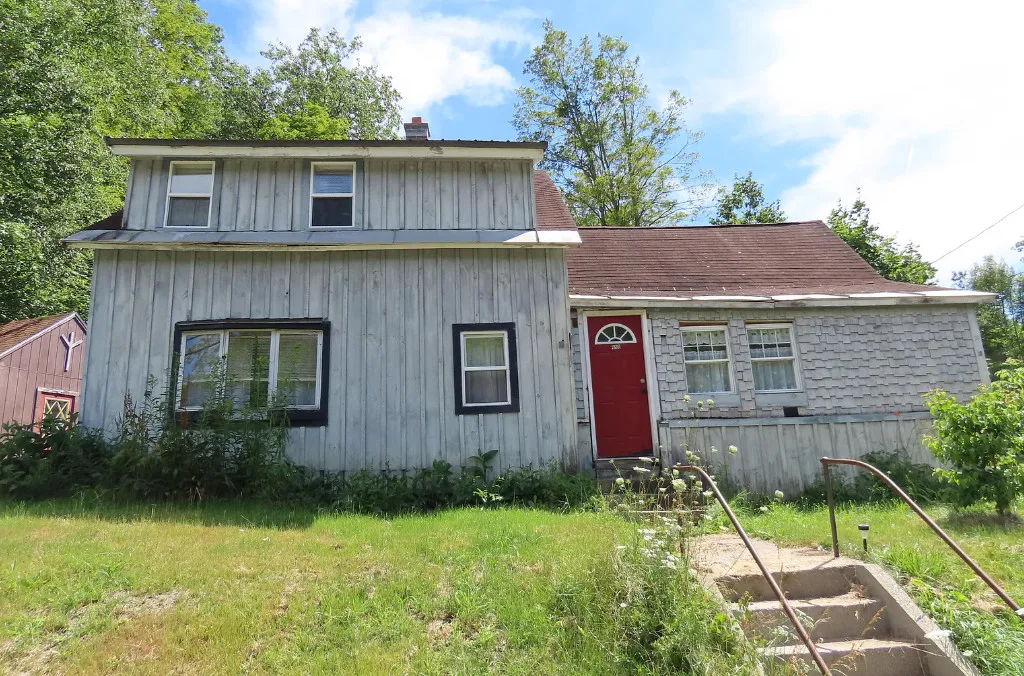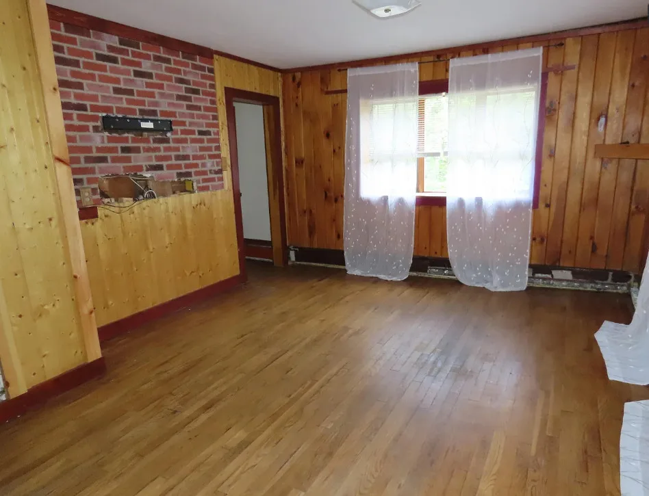 Nice acreage for this fixer upper in Massachusetts! The house was built in 1940. It is located on 8.8 acres in Clarksburg, Massachusetts. The house definitely needs work. It features exposed beams, knotty pine, some wood flooring, wainscoting and baseboards. There is a detached storage building on the property. Three bedrooms, one bathroom and 1,517 square feet. $145,000