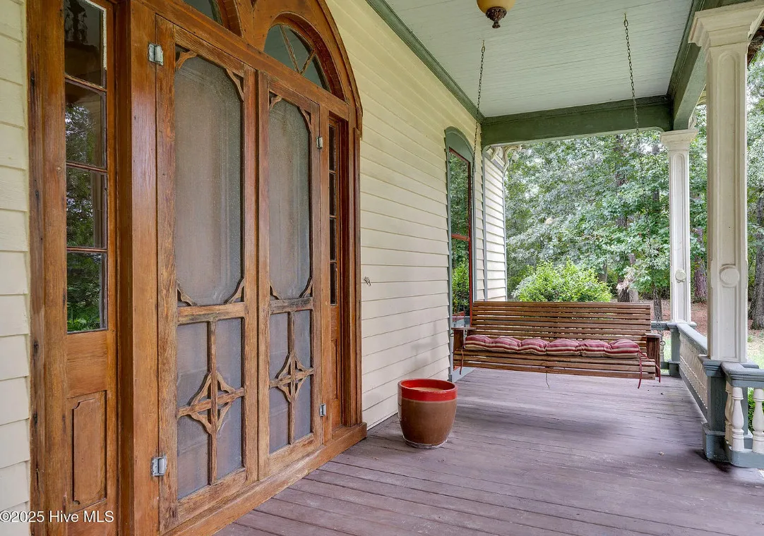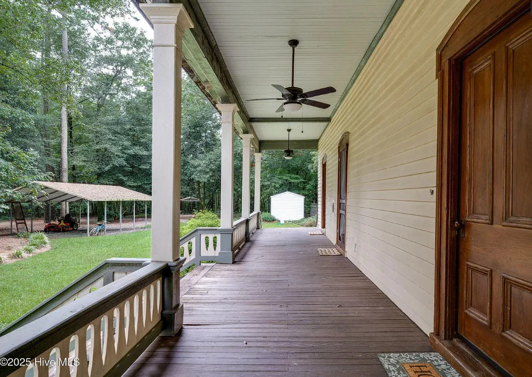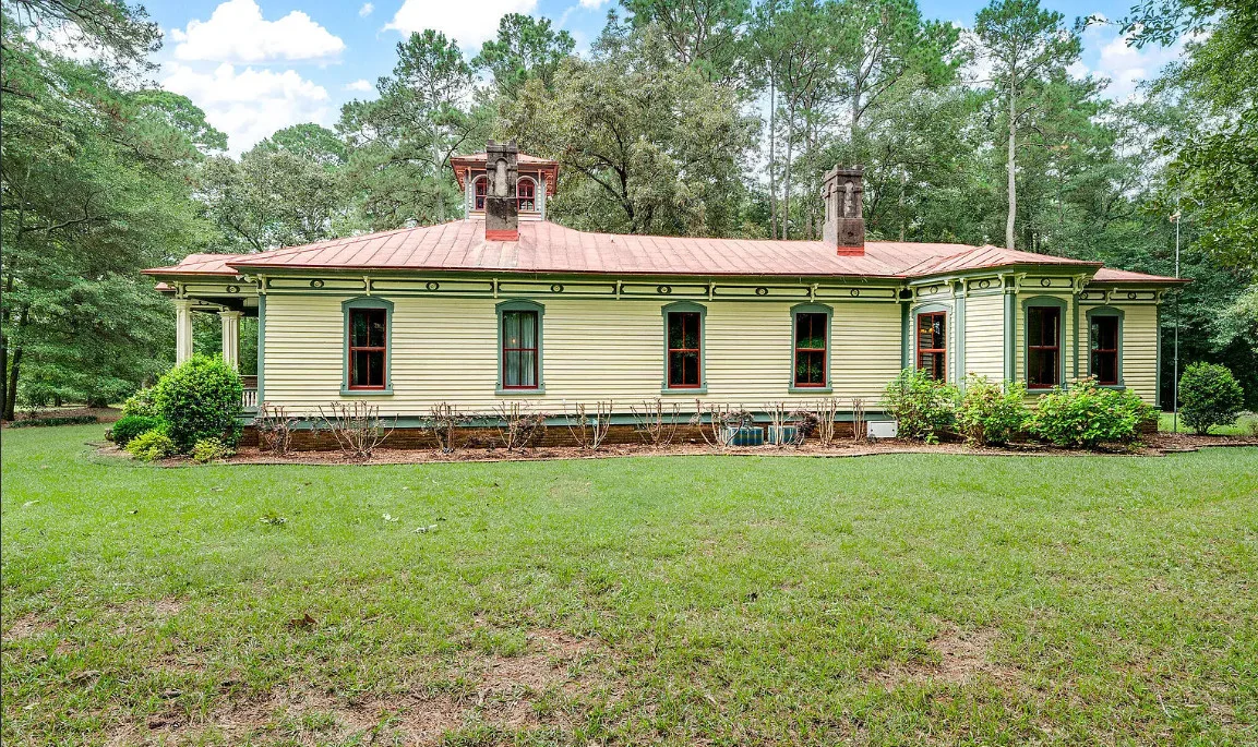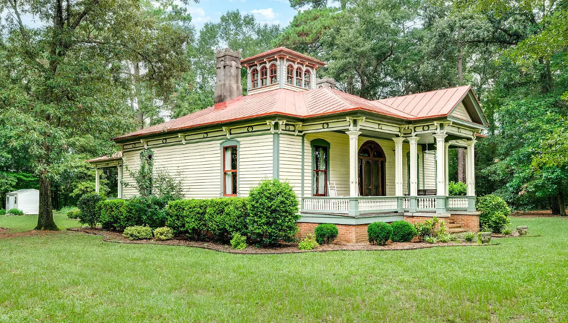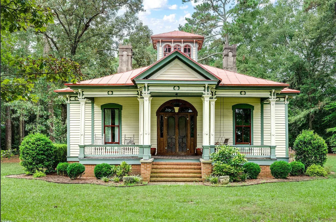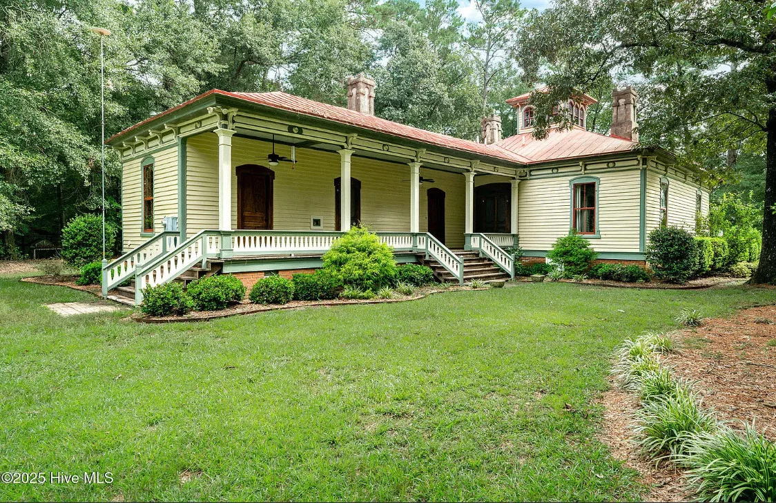 This house has so much character! Has an interesting history too. It was originally built as a stage coach station. It was later used as a train station in the town of Warsaw, North Carolina. It was eventually moved to it’s current location. The house was built in 1848. It is located on 7.82 acres in Clinton, North Carolina. The house features a covered front porch, beautiful double front doors, wood floors, wainscoting, transom windows, wide baseboards, crown moulding, spacious kitchen and a claw foot tub. There is a large covered side porch, a carport and a detached storage shed. Three bedrooms, two bathrooms and 2,152 square feet. $500,000