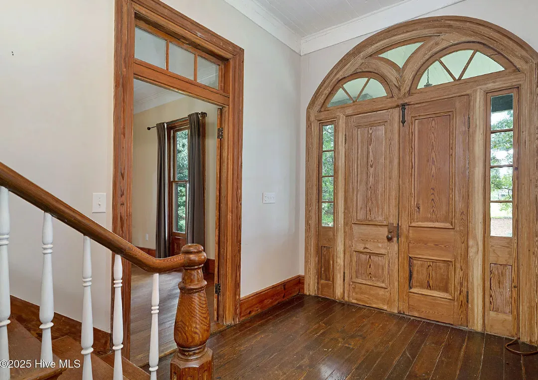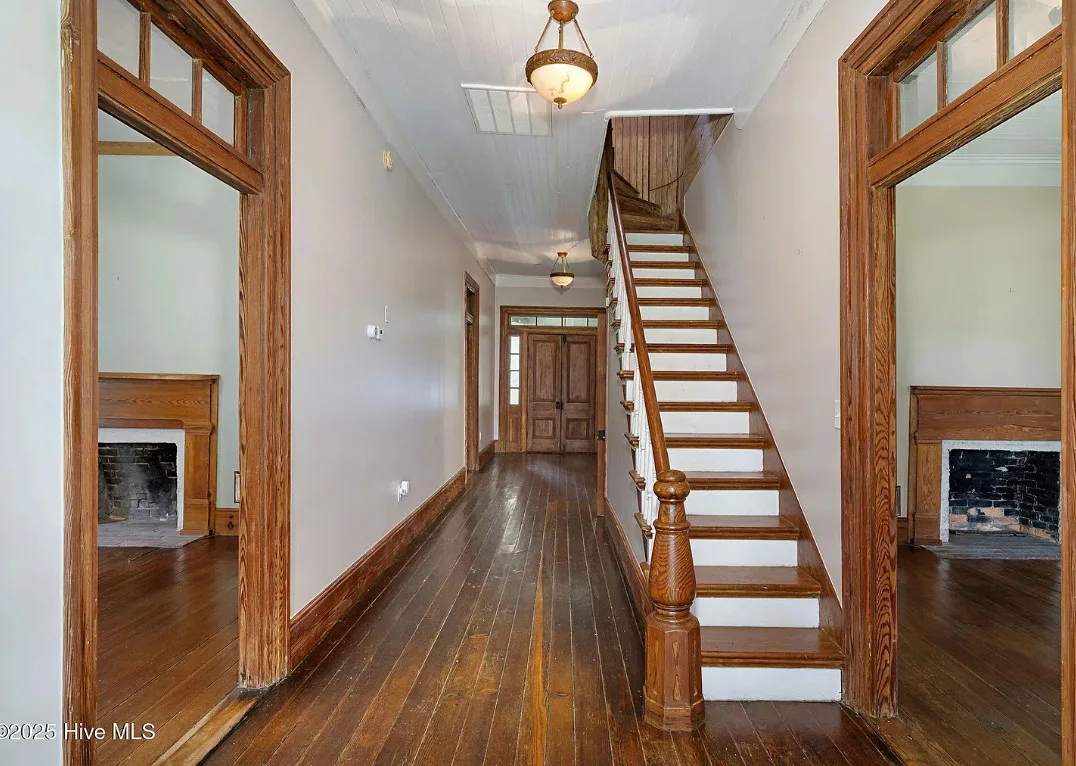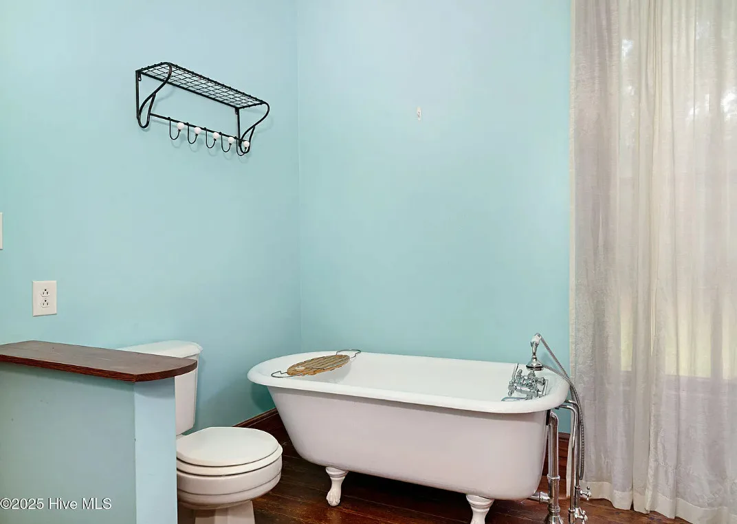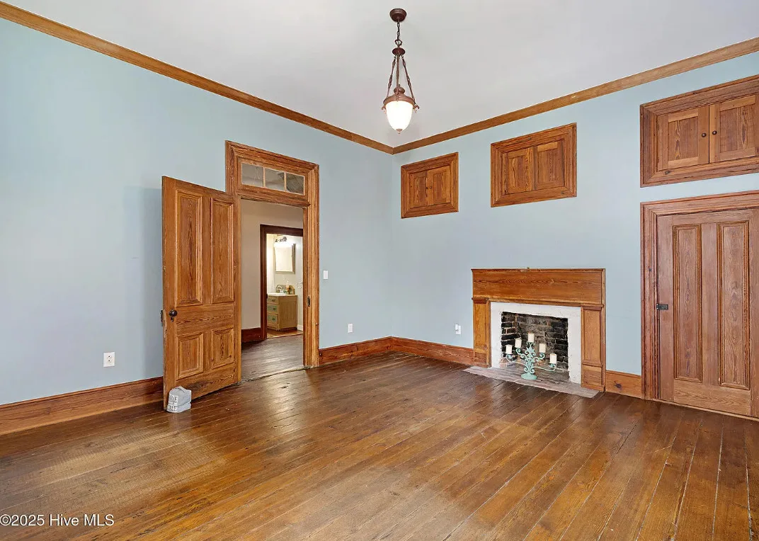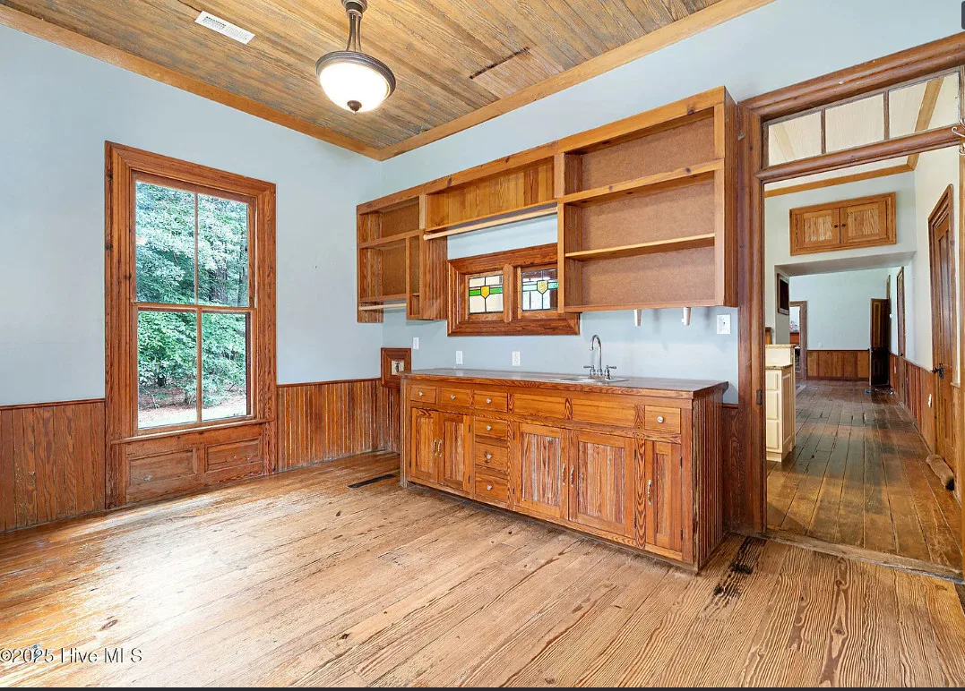 This house has so much character! Has an interesting history too. It was originally built as a stage coach station. It was later used as a train station in the town of Warsaw, North Carolina. It was eventually moved to it’s current location. The house was built in 1848. It is located on 7.82 acres in Clinton, North Carolina. The house features a covered front porch, beautiful double front doors, wood floors, wainscoting, transom windows, wide baseboards, crown moulding, spacious kitchen and a claw foot tub. There is a large covered side porch, a carport and a detached storage shed. Three bedrooms, two bathrooms and 2,152 square feet. $500,000