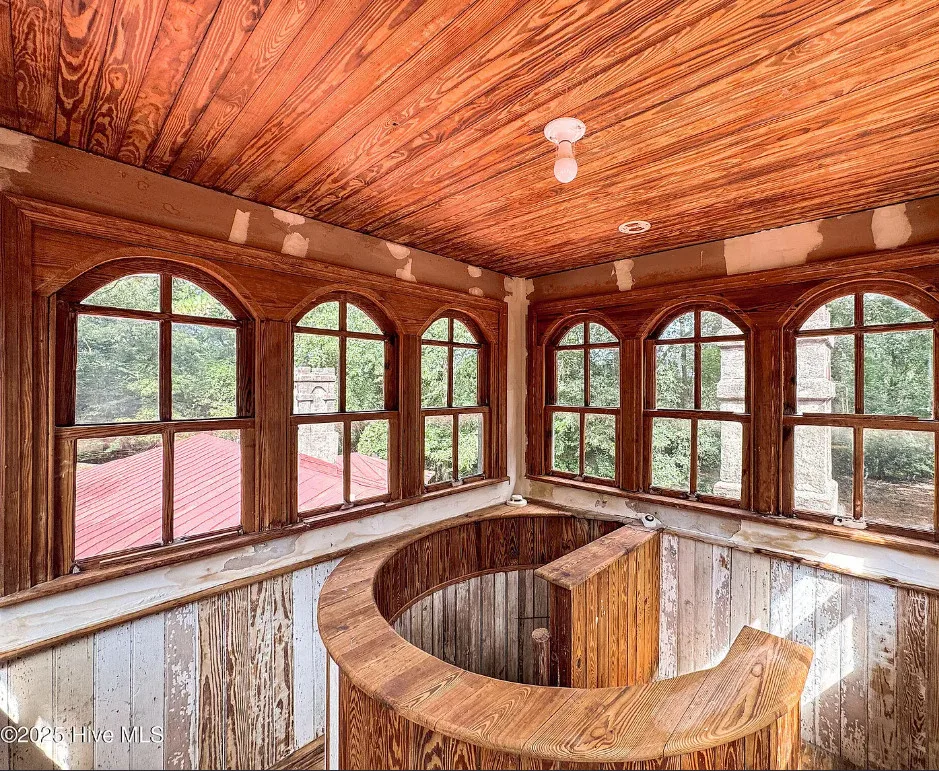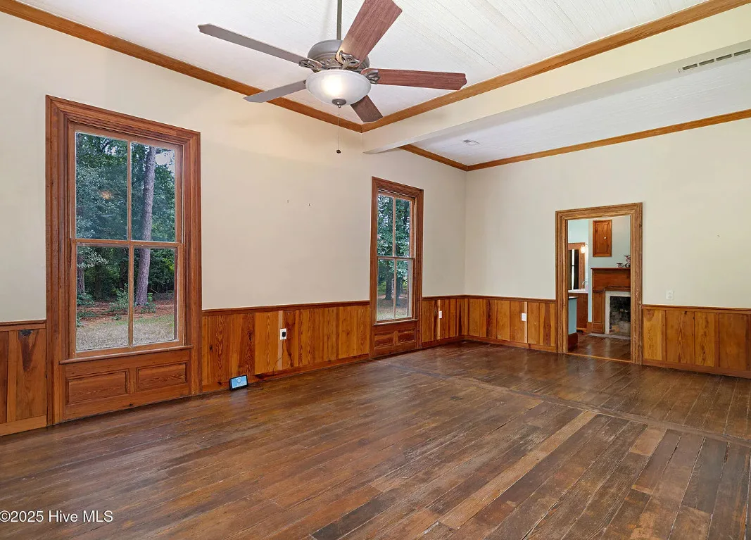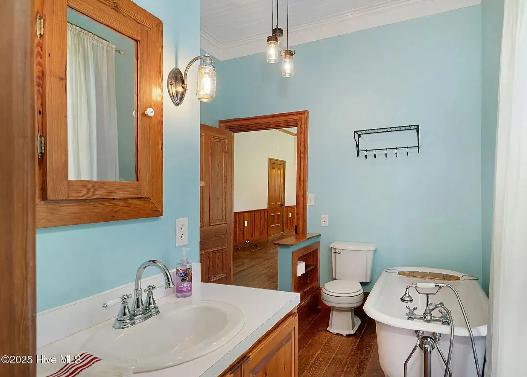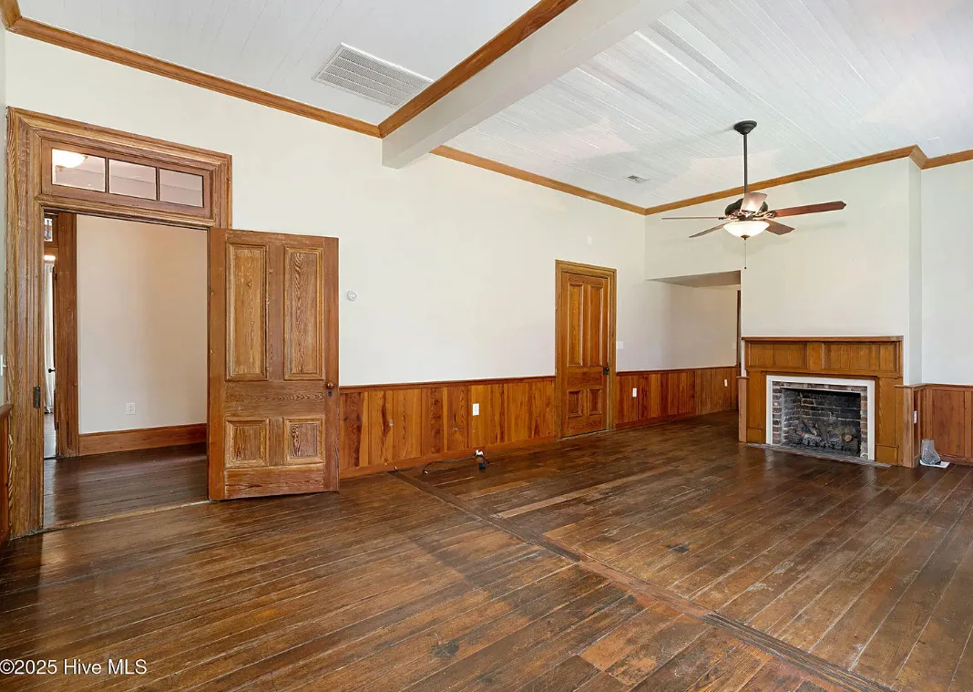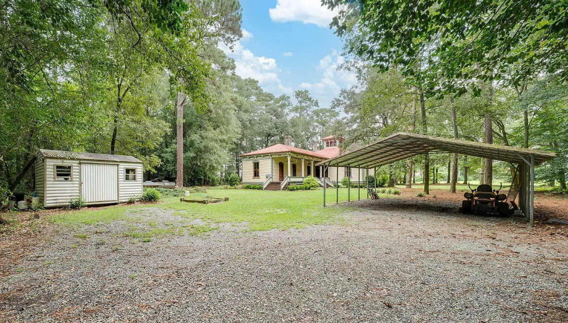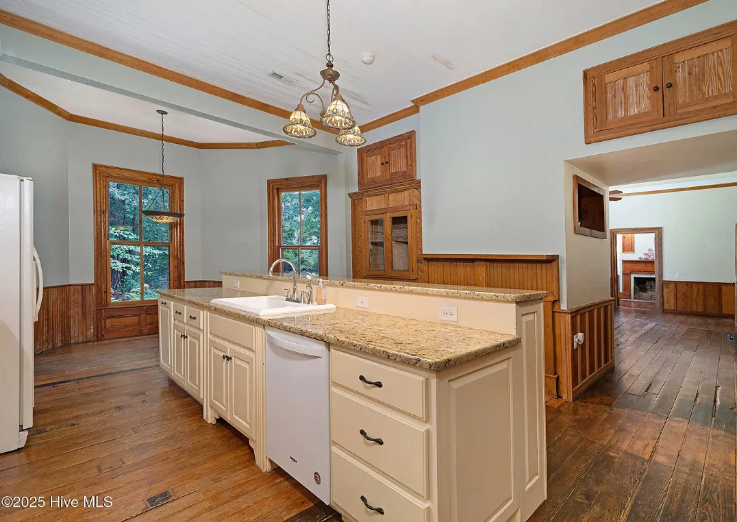 This house has so much character! Has an interesting history too. It was originally built as a stage coach station. It was later used as a train station in the town of Warsaw, North Carolina. It was eventually moved to it’s current location. The house was built in 1848. It is located on 7.82 acres in Clinton, North Carolina. The house features a covered front porch, beautiful double front doors, wood floors, wainscoting, transom windows, wide baseboards, crown moulding, spacious kitchen and a claw foot tub. There is a large covered side porch, a carport and a detached storage shed. Three bedrooms, two bathrooms and 2,152 square feet. $500,000