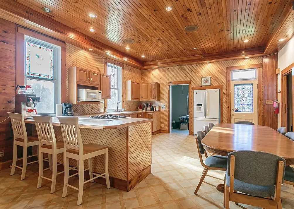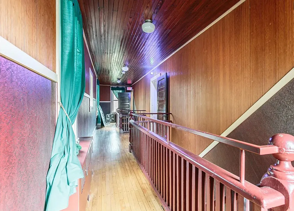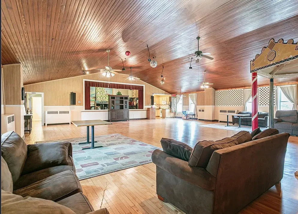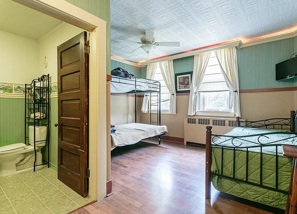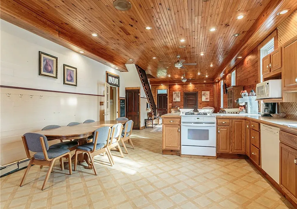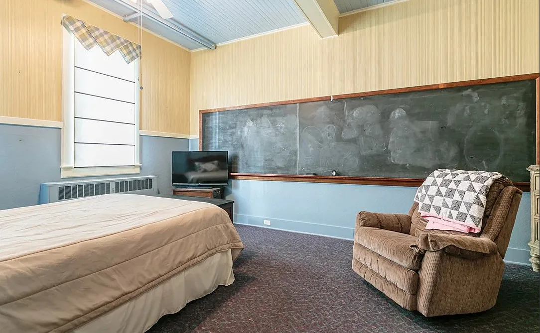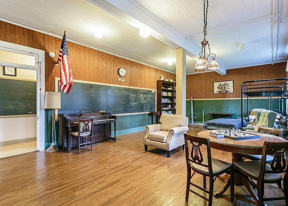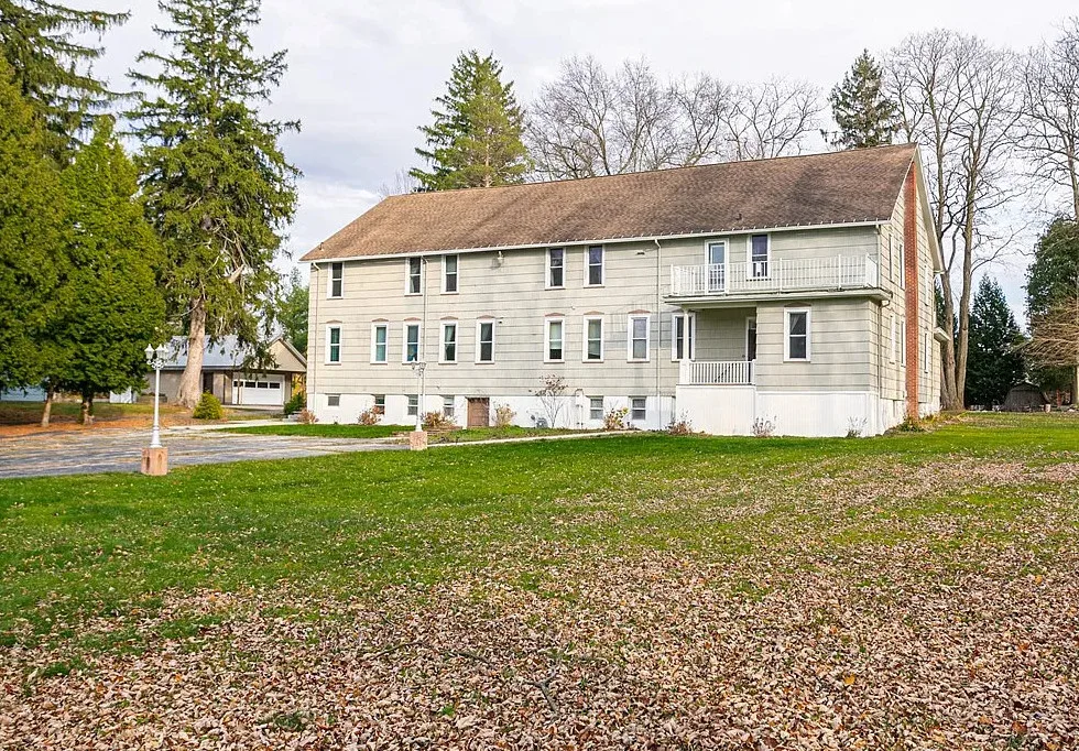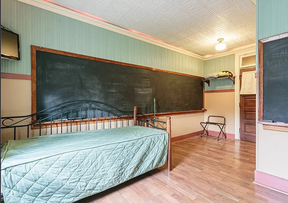 This is a former school. I like that the original chalkboards are still inside! The school was built in 1907. It is located on .9 acre in Albion, New York. This is a big building with almost 7,000 square feet and three staircases. The converted school features a spacious kitchen with bead board, original chalk boards, knotty pine and a large sunroom. There is a pond in the backyard. Nine bedrooms, six bathrooms and 6,912 square feet. $399,000
