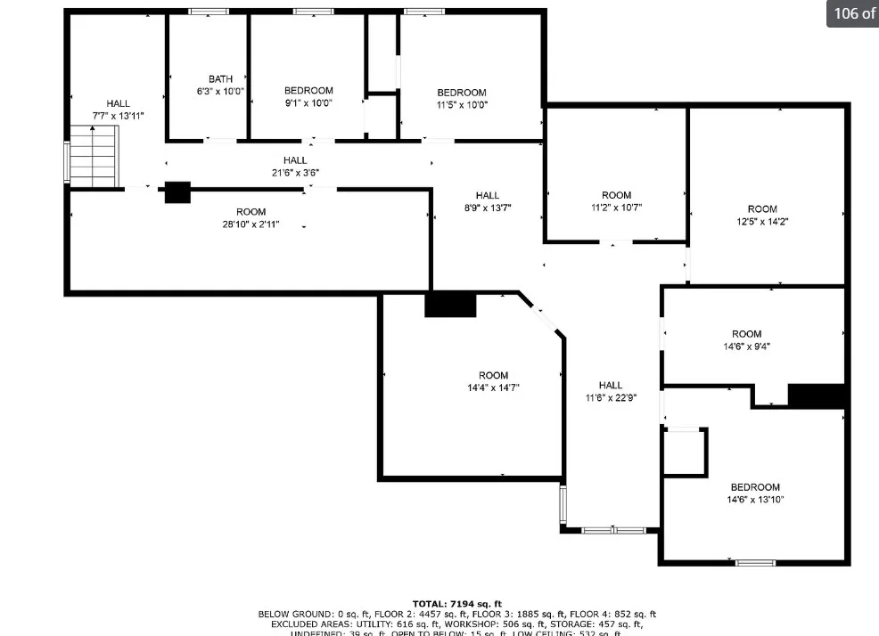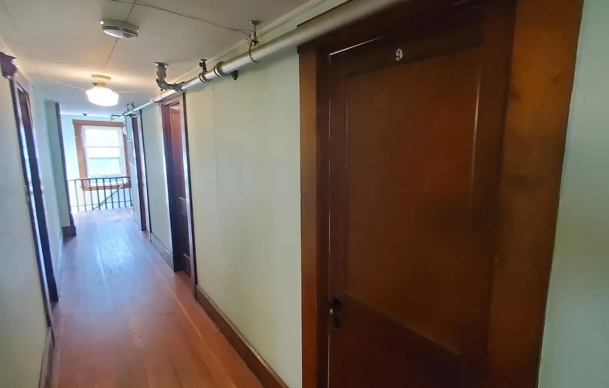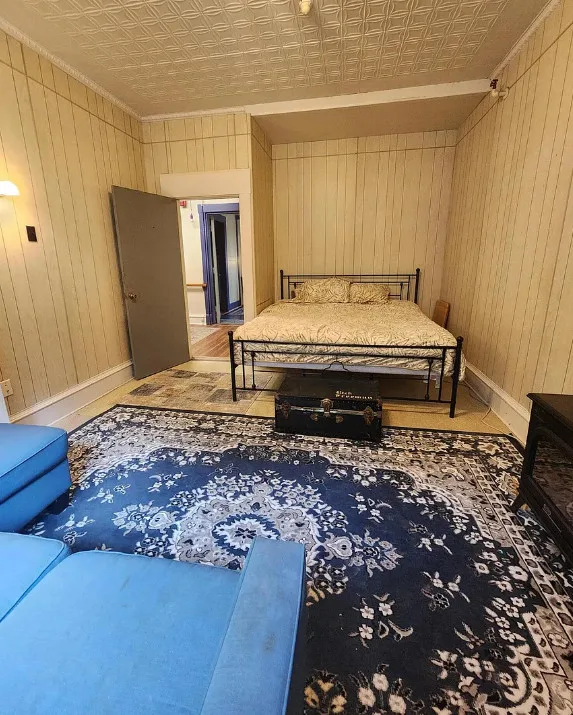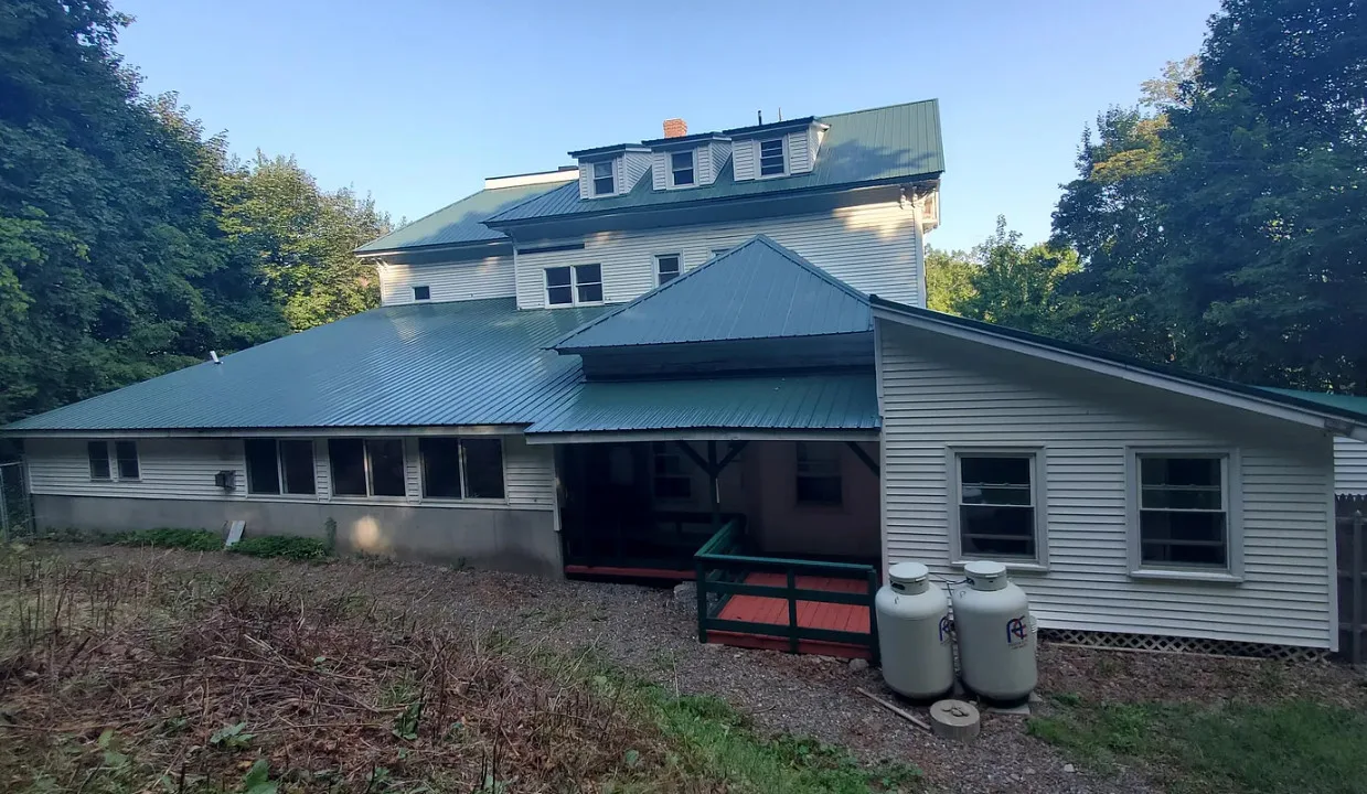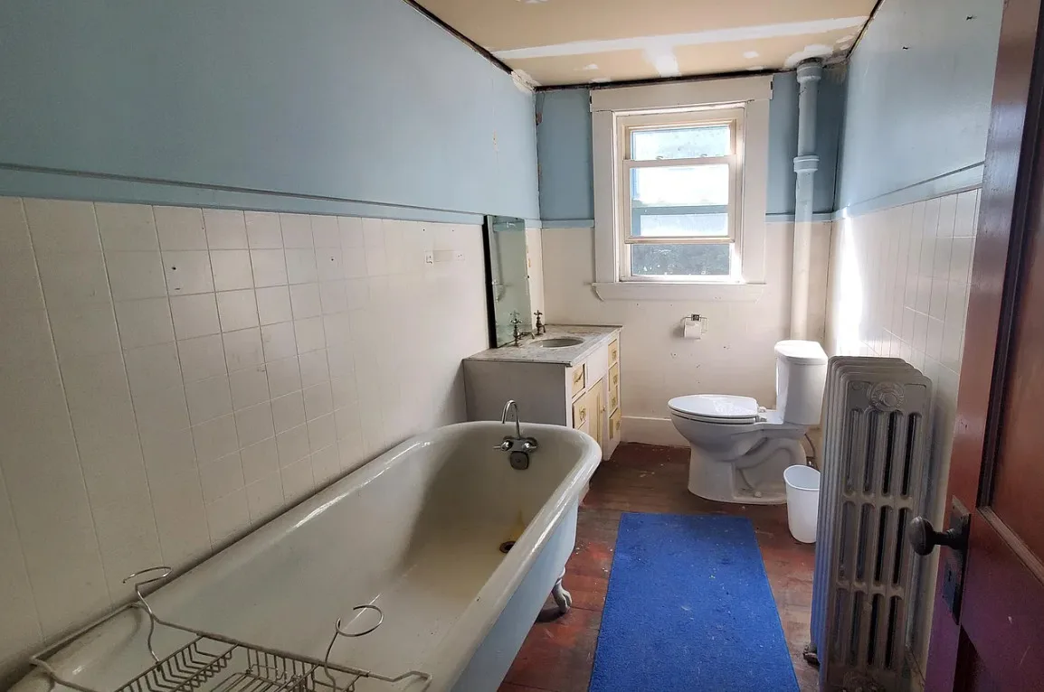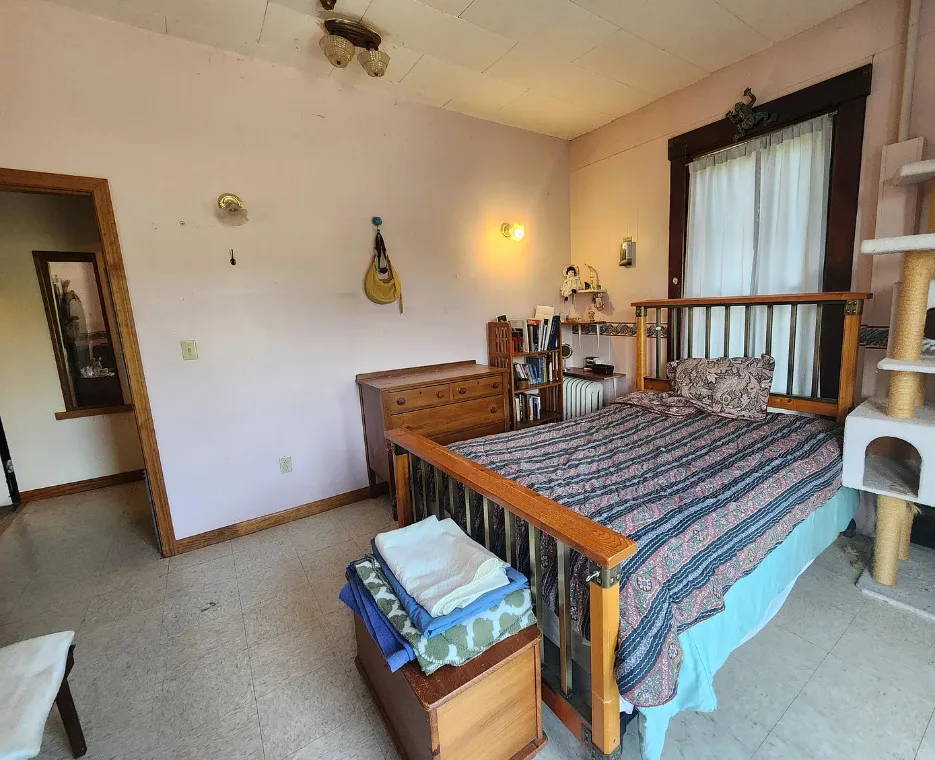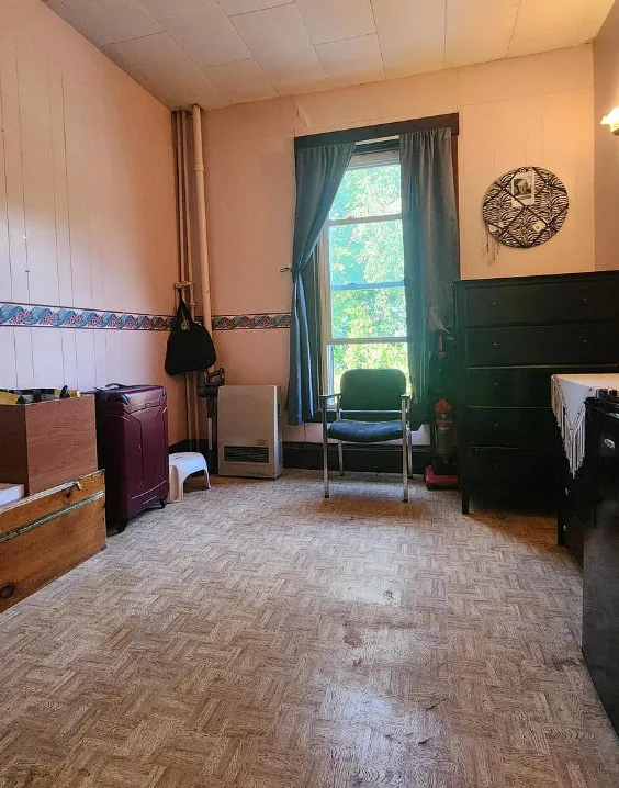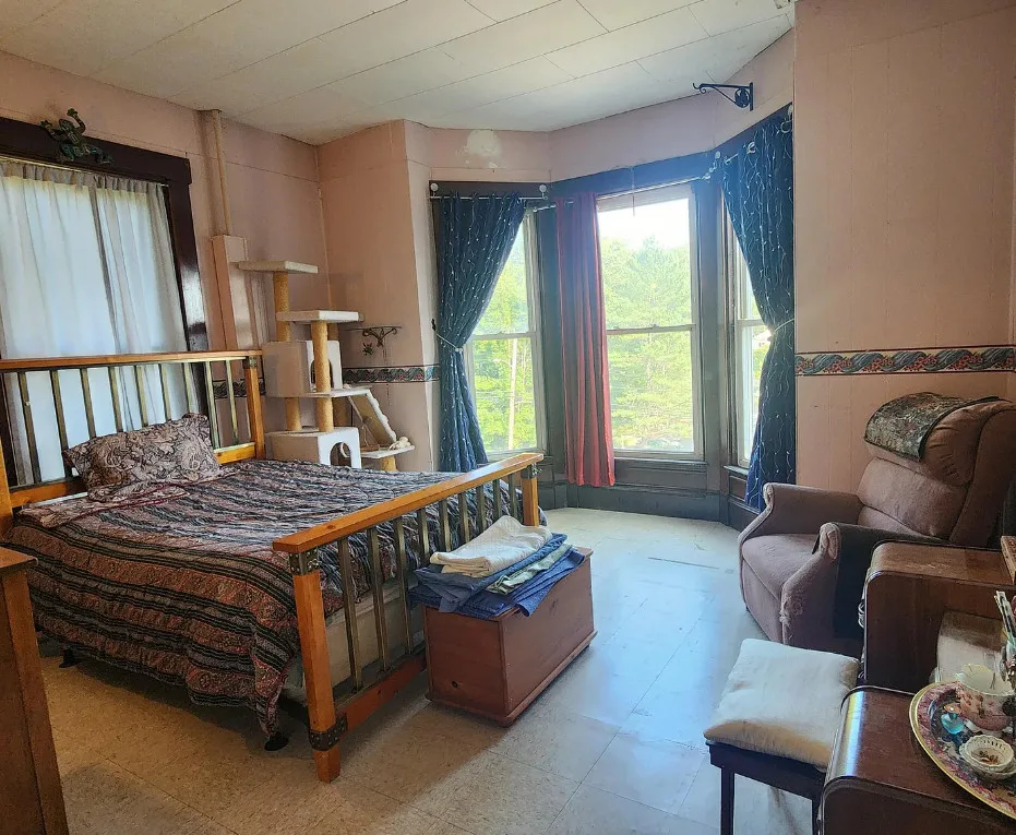 This is a big house with 14 bedrooms and eight bathrooms! It has a bit of a Talk Amongst Yourselves feel to it! The house was built in 1890. It is located on .94 acre in Dexter, Maine. The house features a covered front porch, double front doors, stained glass, wood floors and a nice staircase. There is a large basement. It definitely needs work and some undoing of past renovations, but this has potential. Fourteen bedrooms, eight bathrooms and 8,660 square feet. $340,000