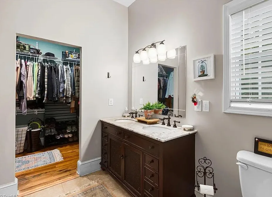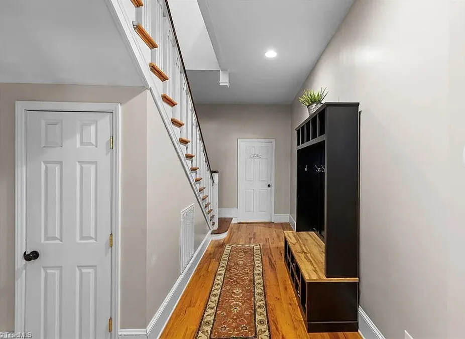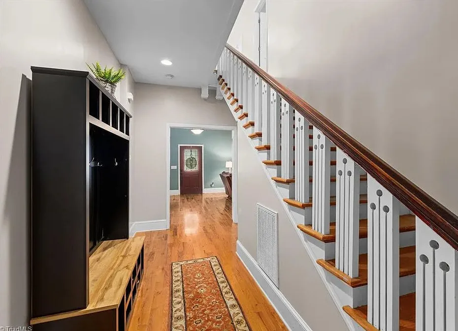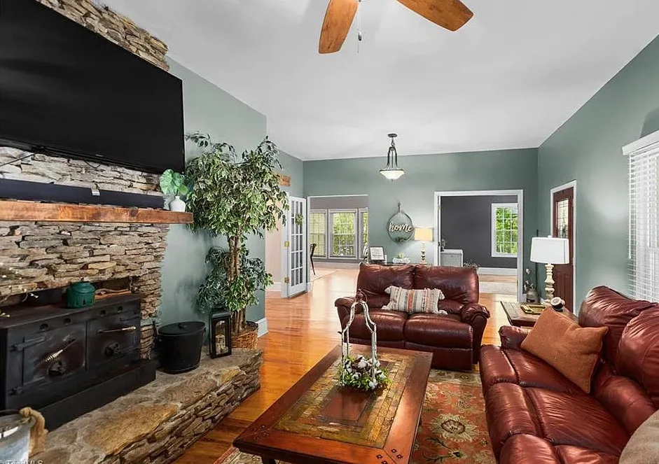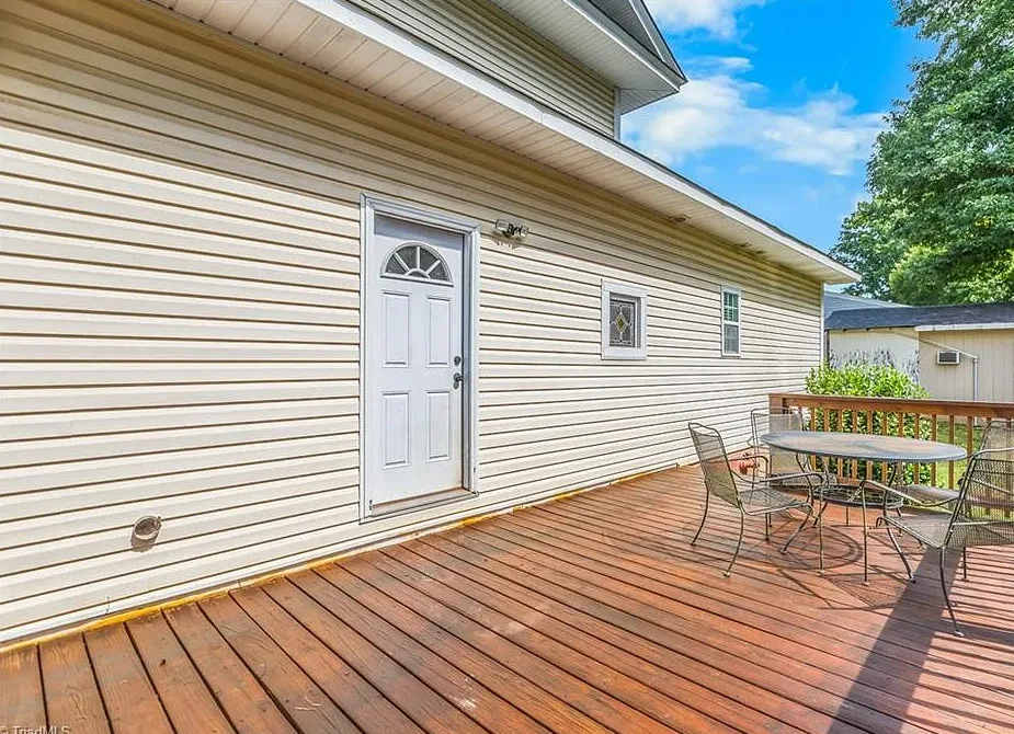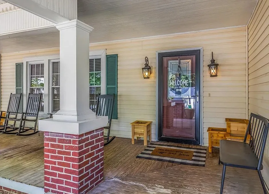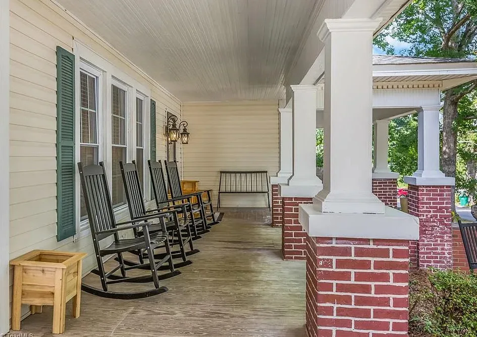 This house has a nice porch! It has a pretty interior also. The house was built in 1900. It is located on 2.45 acres in Stoneville, North Carolina. The house features a covered porch, a porte cochere, wood floors, wide baseboards, french doors, stone fireplace and an updated kitchen. There is a back deck and a large backyard. Four bedrooms, three bathrooms and 3,419 square feet. $399,000