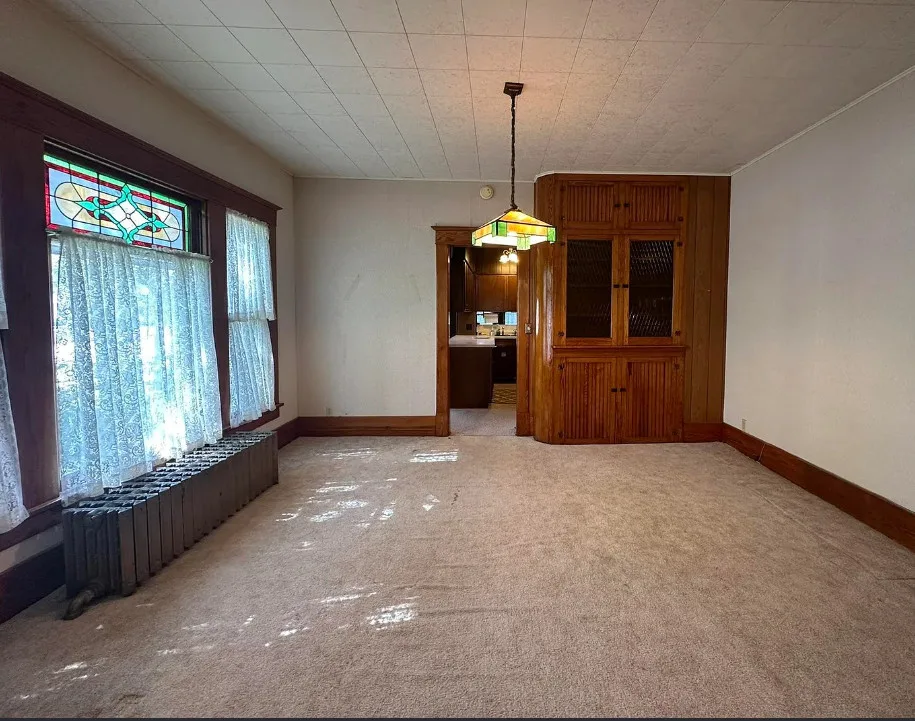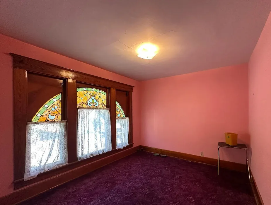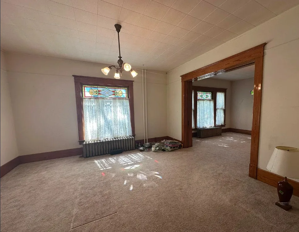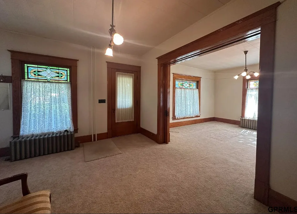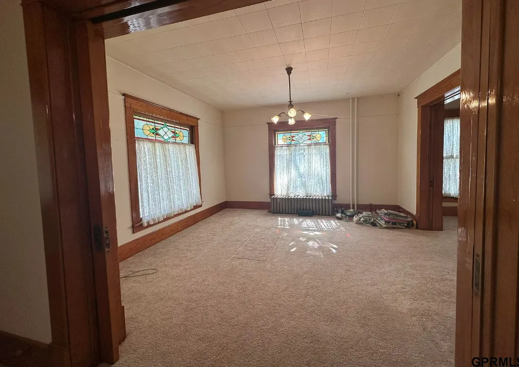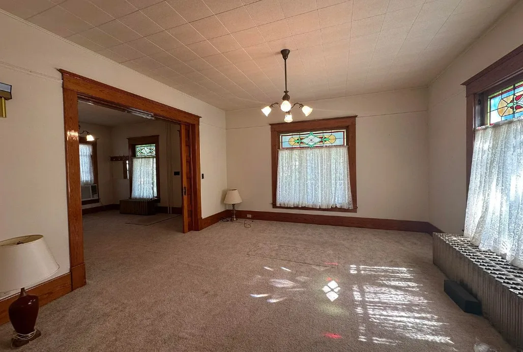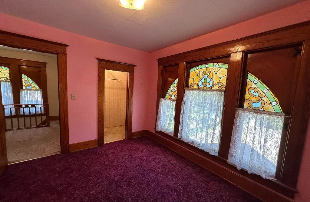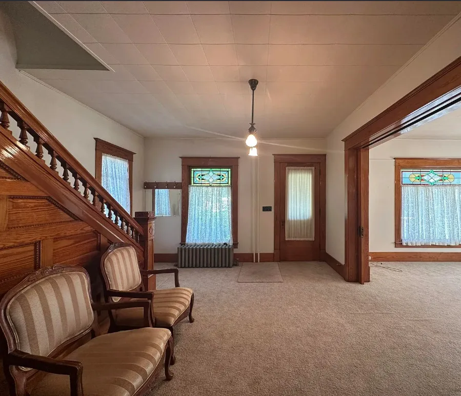 This house looks like a diamond in the rough! Those pocket doors, stairs and stained glass are pretty! The house was built in 1905. It is located on .35 acre in Geneva, Nebraska. The house features a covered front porch, pretty staircase, beautiful pocket doors, stained glass, vintage light fixtures and baseboards. There is a detached two car garage. Five bedrooms, three bathrooms and 2,721 square feet. $147,500