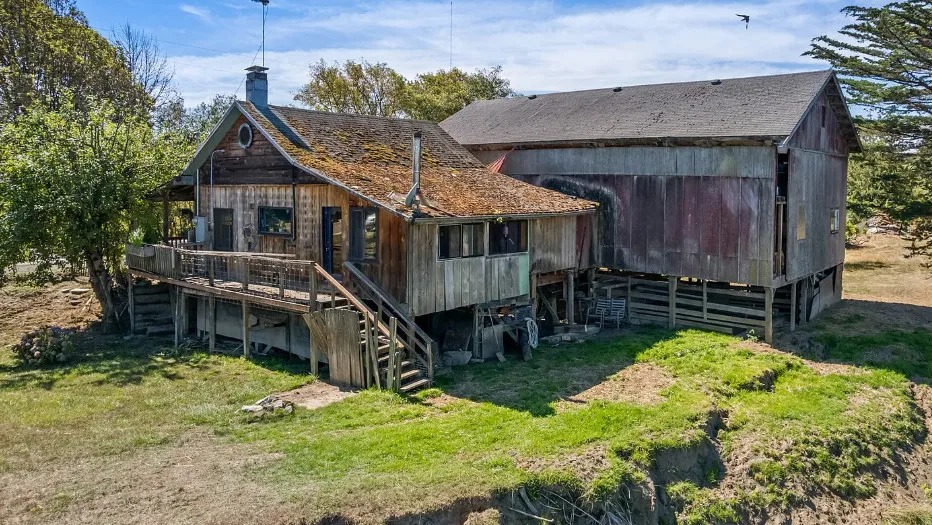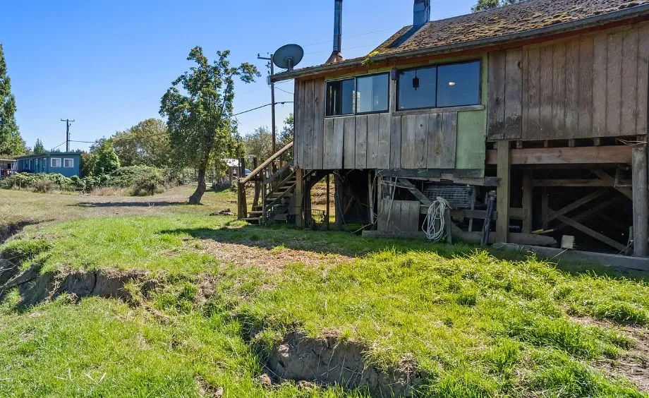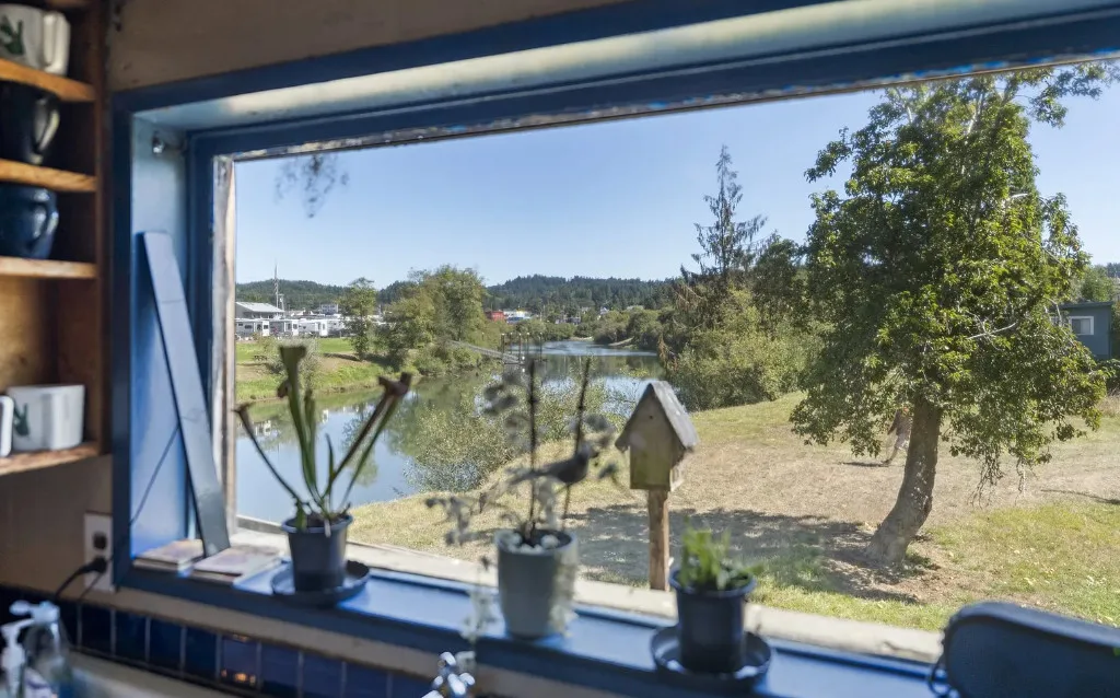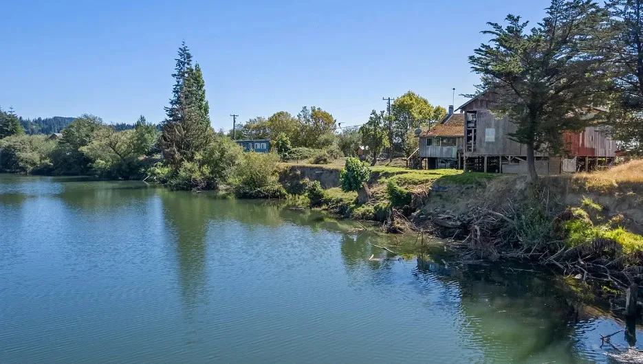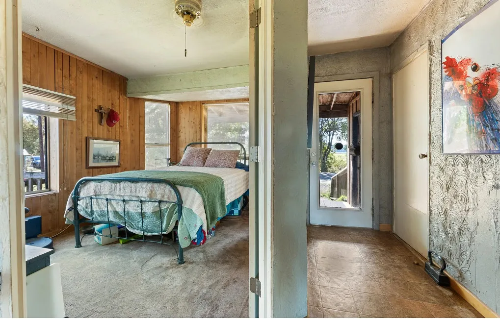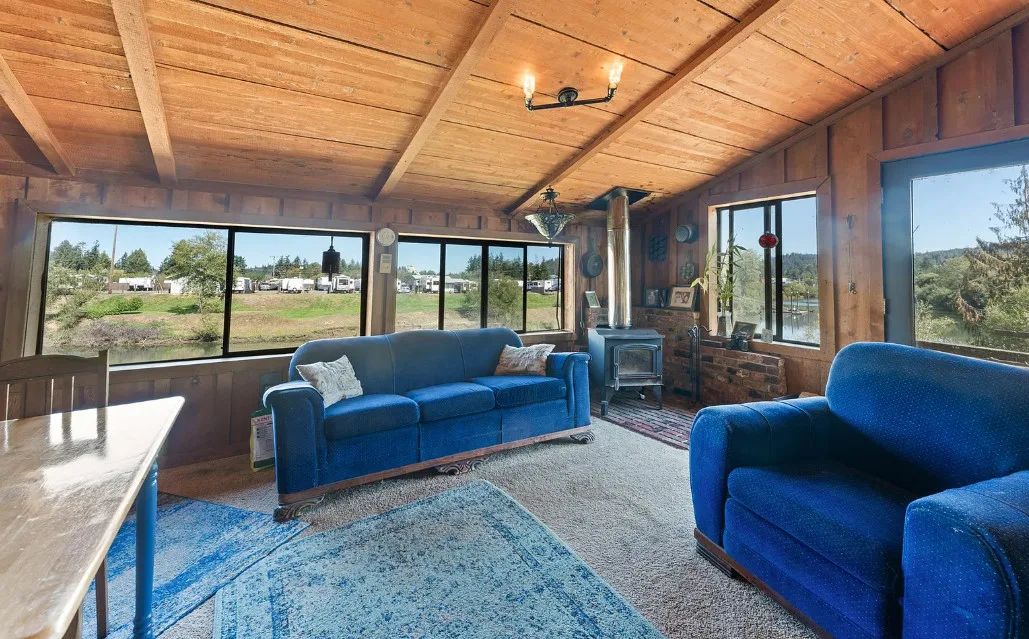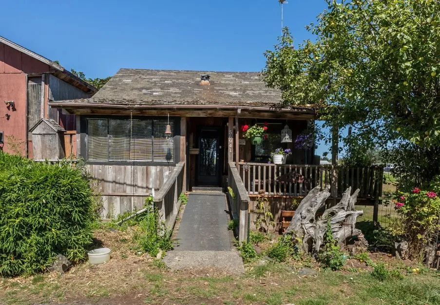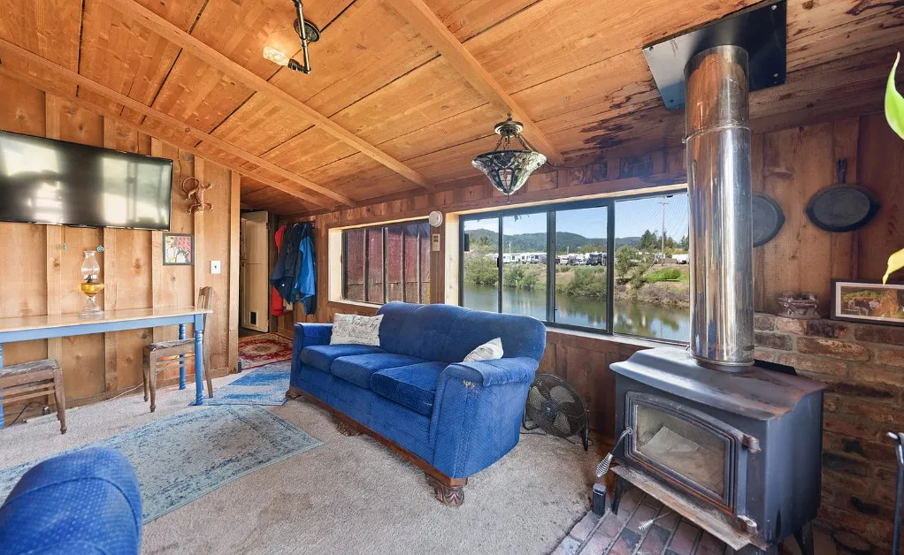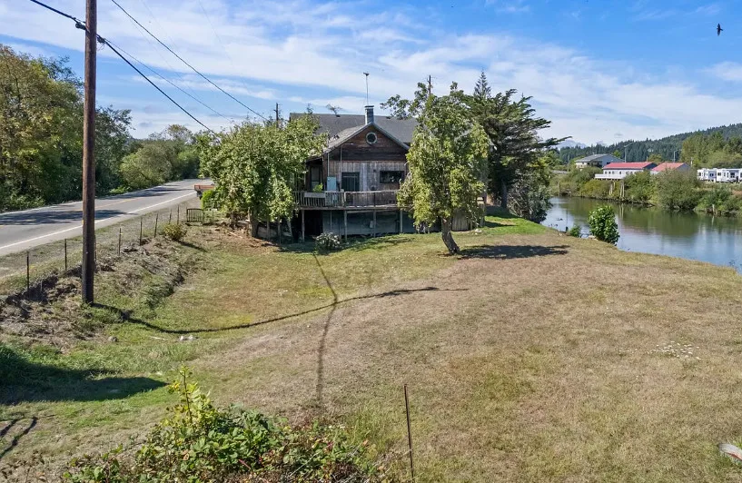 Rustic river cabin in Oregon. Interesting setting. The house was built in 1915. It is located on two acres in Coquille, Oregon. The house features a front porch, screened in porch, a lot of windows, some wood floors and exposed beams. There is a detached workshop on the property. The yard is fully fenced in. Two bedrooms, one bathroom and 720 square feet. $250,000