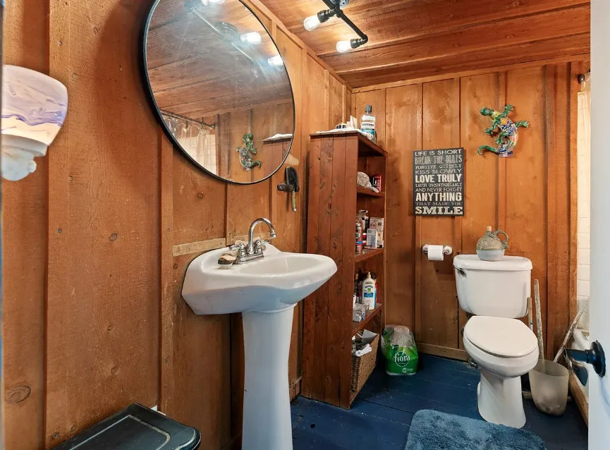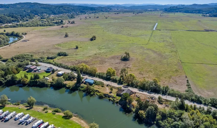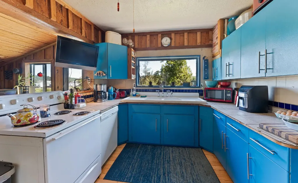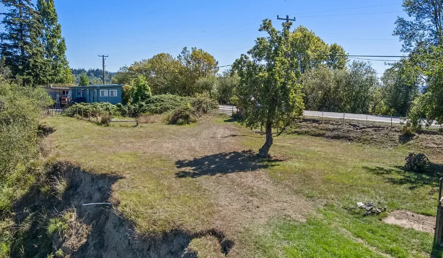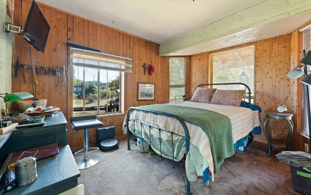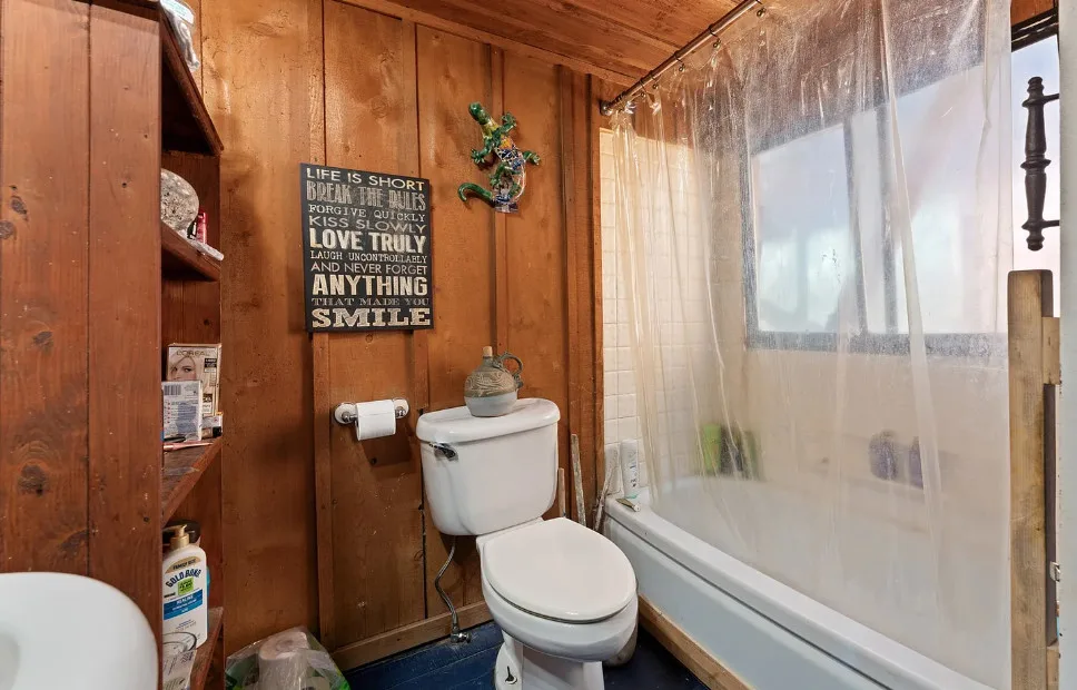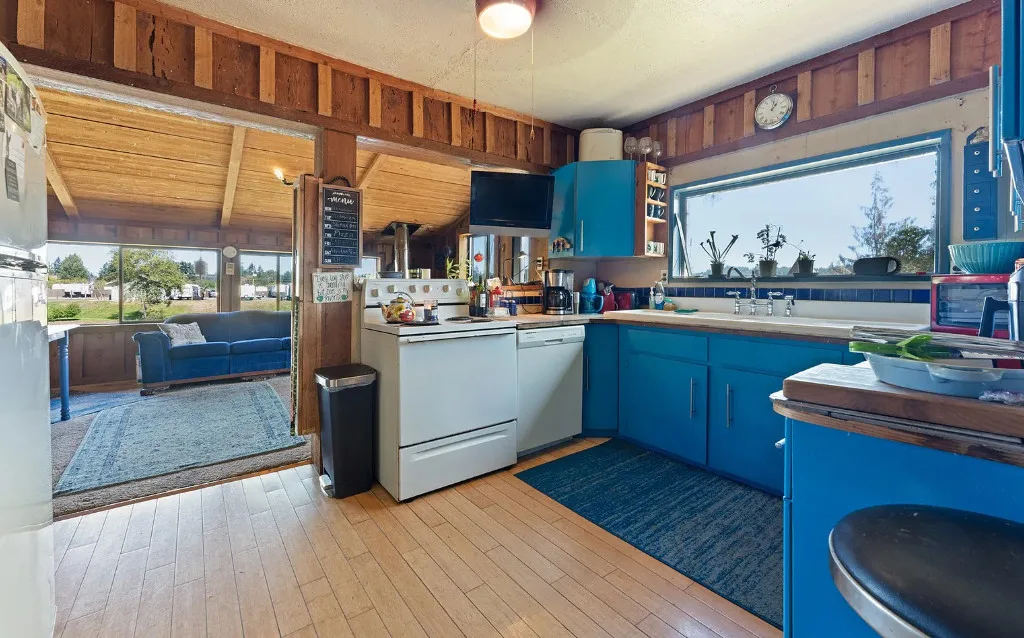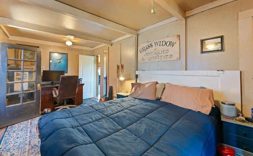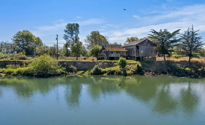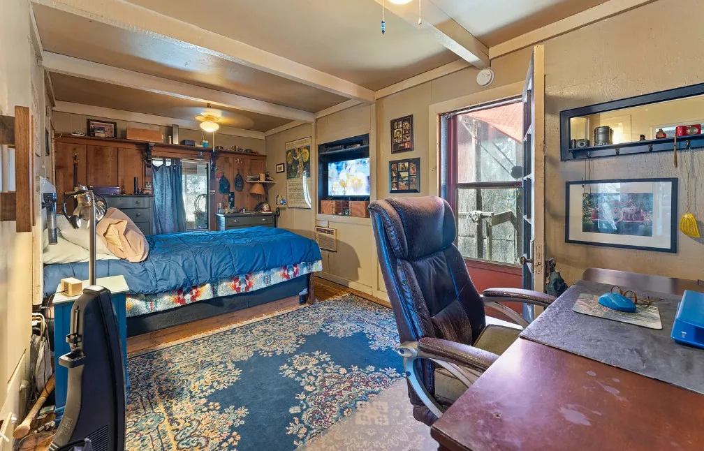 Rustic river cabin in Oregon. Interesting setting. The house was built in 1915. It is located on two acres in Coquille, Oregon. The house features a front porch, screened in porch, a lot of windows, some wood floors and exposed beams. There is a detached workshop on the property. The yard is fully fenced in. Two bedrooms, one bathroom and 720 square feet. $250,000