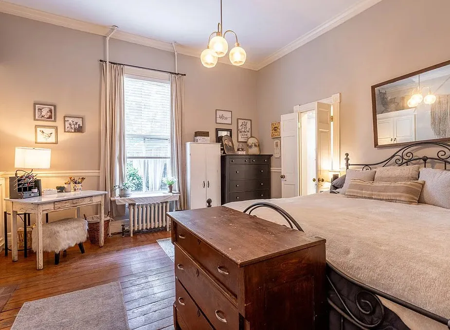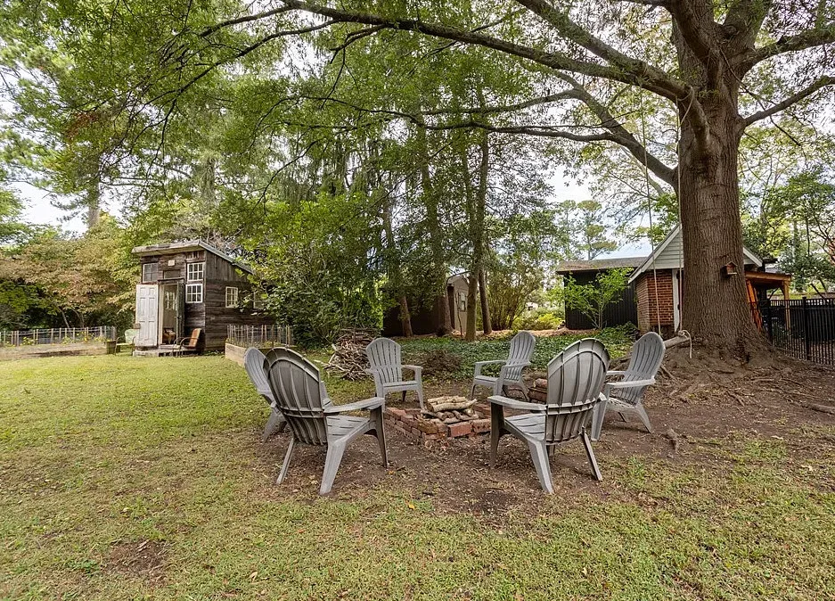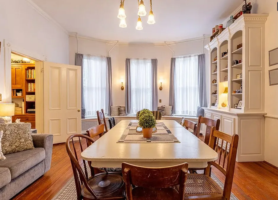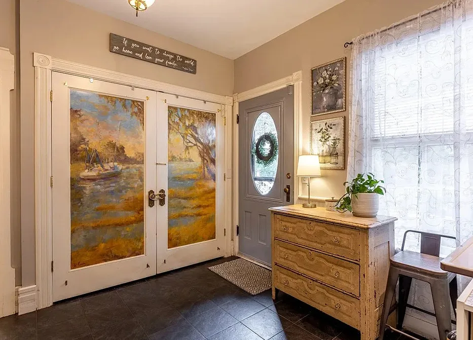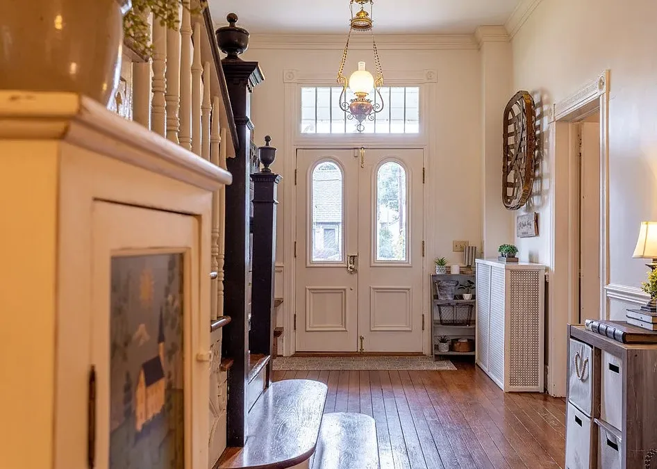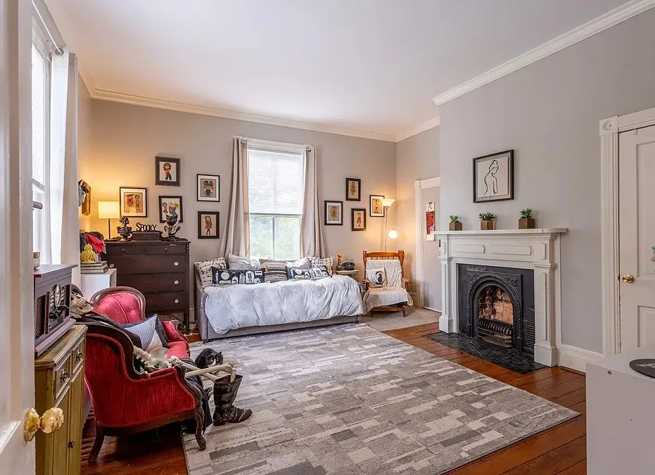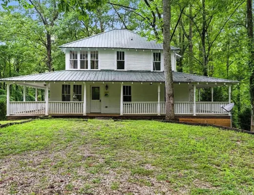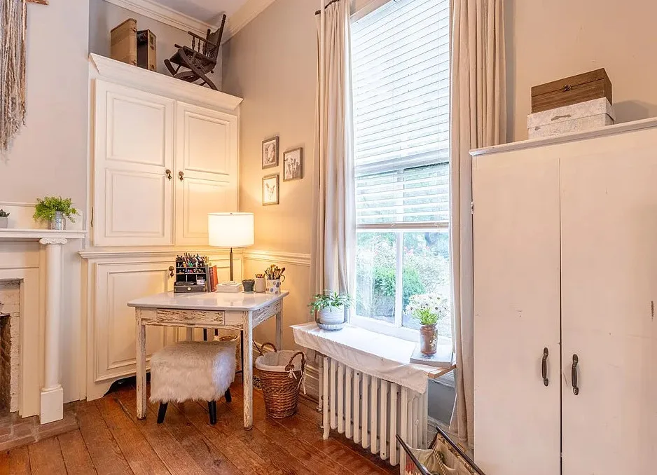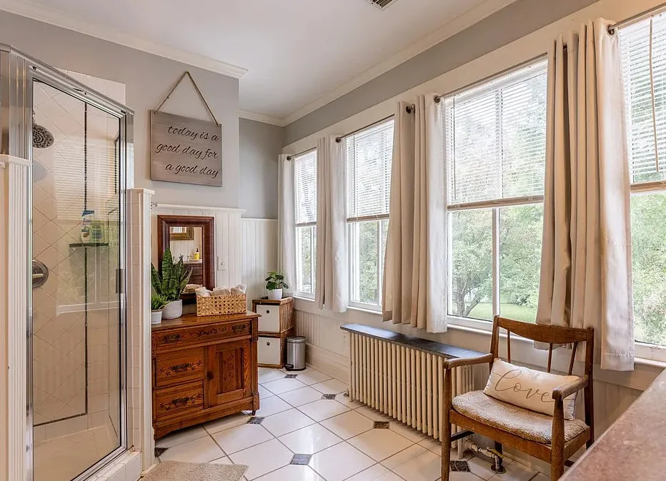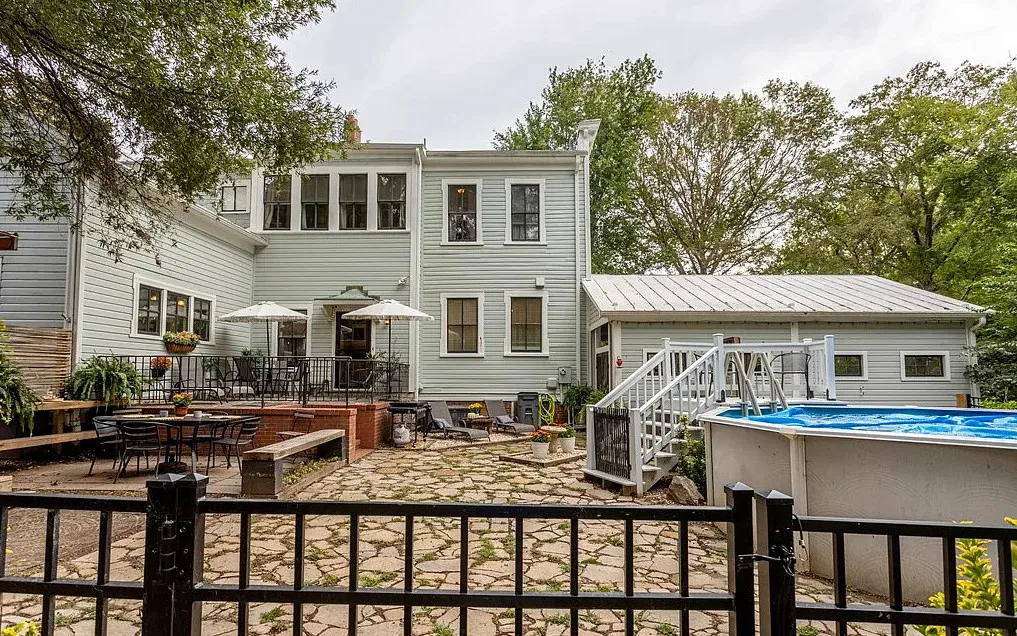 This house has really pretty details inside! The house was built in 1888. It is located on 1.04 acres in South Boston, Virginia. The house features a covered front porch, double front doors, wood floors, chair rails, baseboards, crown moulding, pocket doors, built-in china cabinet, wainscoting, tall ceilings, a lot of natural light, spacious kitchen and updated bathrooms. There is a backyard patio and a she-shed. This is a big house! Five bedrooms, five bathrooms and 4,608 square feet. $398,500