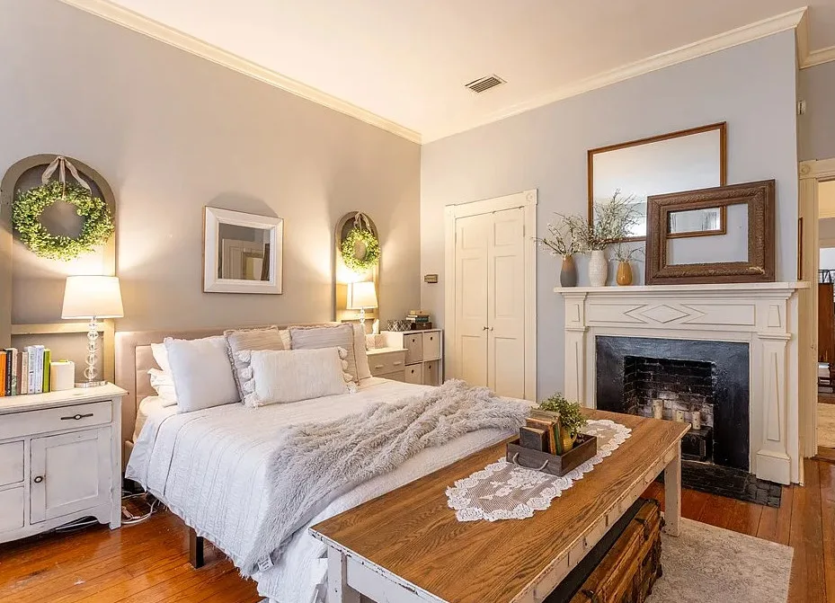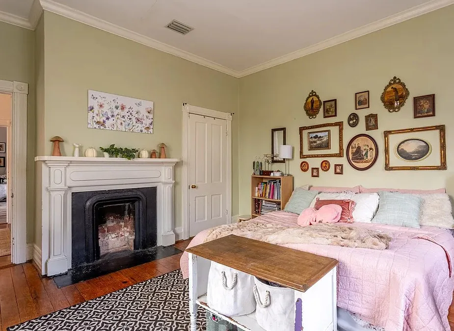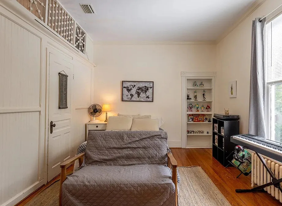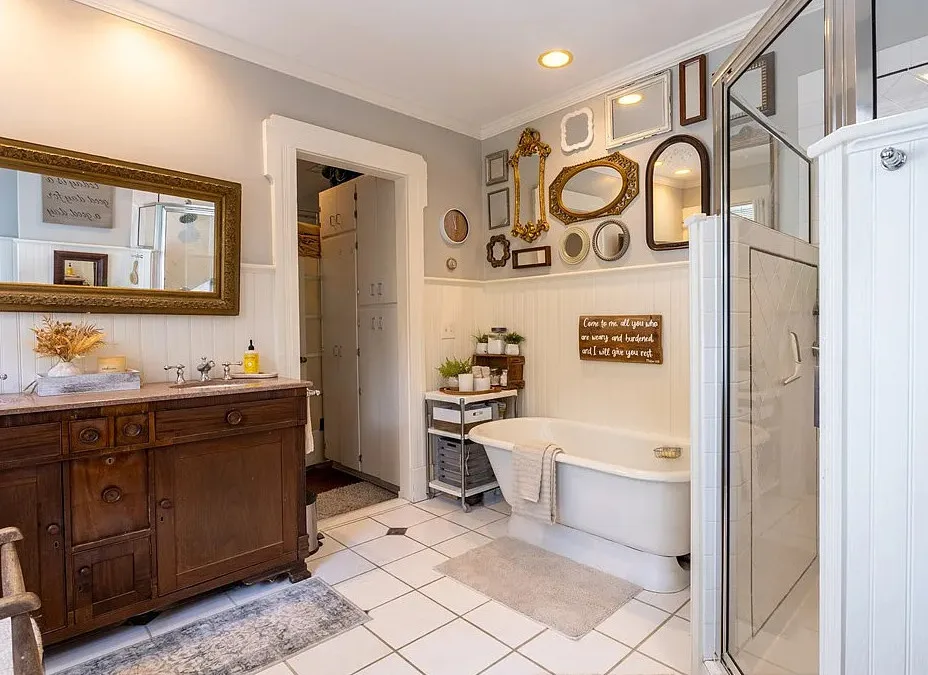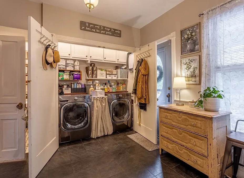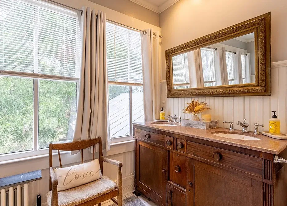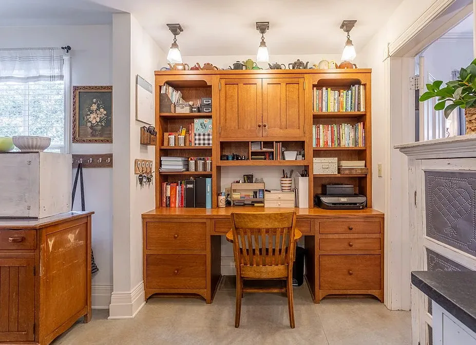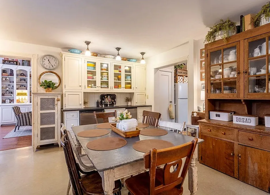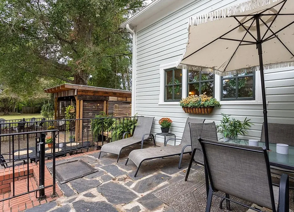 This house has really pretty details inside! The house was built in 1888. It is located on 1.04 acres in South Boston, Virginia. The house features a covered front porch, double front doors, wood floors, chair rails, baseboards, crown moulding, pocket doors, built-in china cabinet, wainscoting, tall ceilings, a lot of natural light, spacious kitchen and updated bathrooms. There is a backyard patio and a she-shed. This is a big house! Five bedrooms, five bathrooms and 4,608 square feet. $398,500