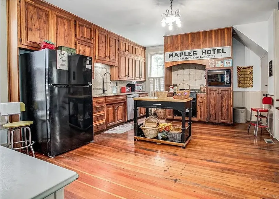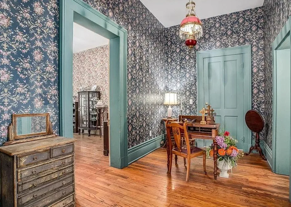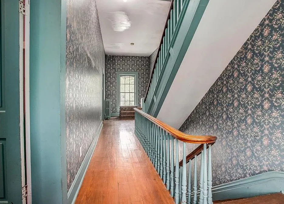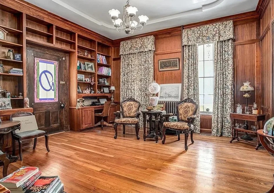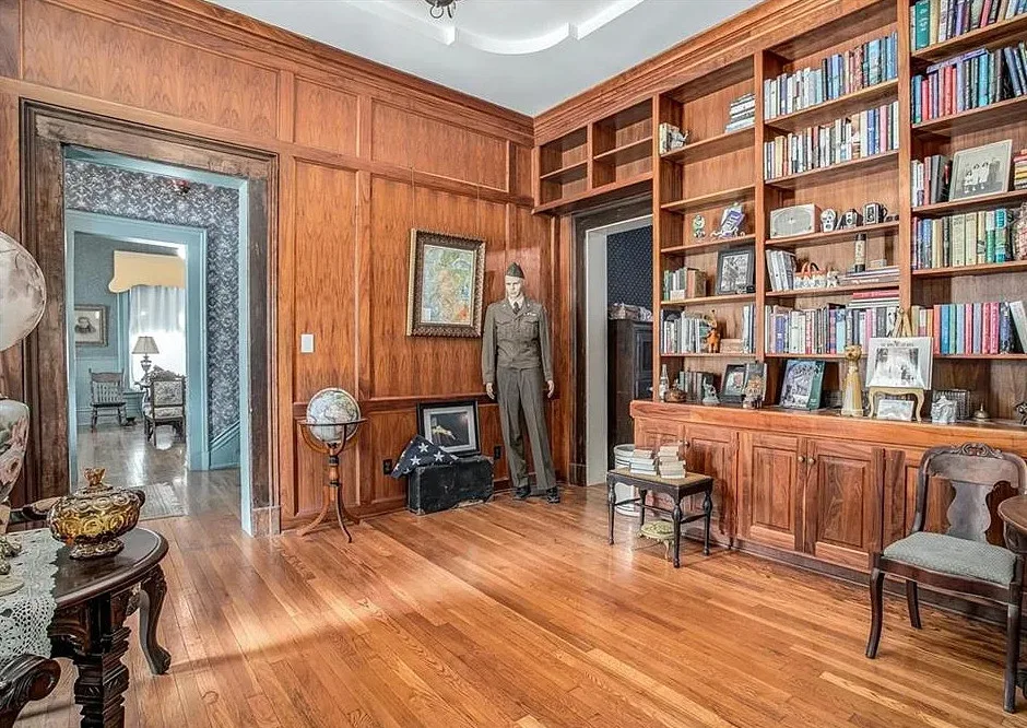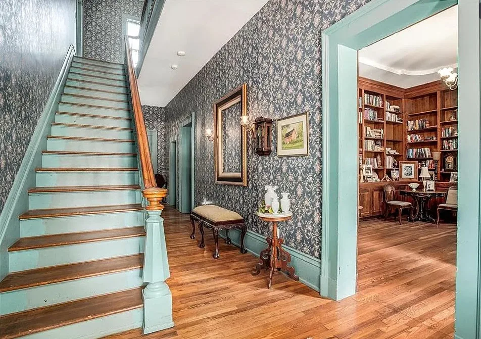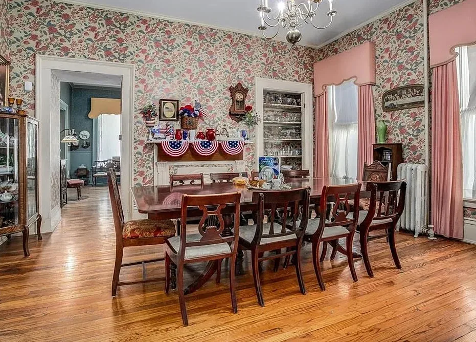 The Porter-Chiles Home is a big house with over 5,000 square feet of living space! In the early 20th century it was known as the Maples Hotel. The Porter-Chiles house was built in 1860. It is located in Independence, Missouri. The house features a large covered front porch, wood floors, wide baseboards, tall ceilings, two staircases, vintage light fixtures, crown moulding, library with built-in bookshelves and a spacious kitchen with a back staircase. The third floor has five bedrooms and some have the original lettering from the Maples Hotel era. Nine bedrooms, four bathrooms and 5,166 square feet. $395,000