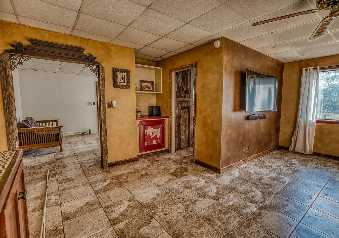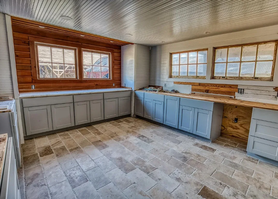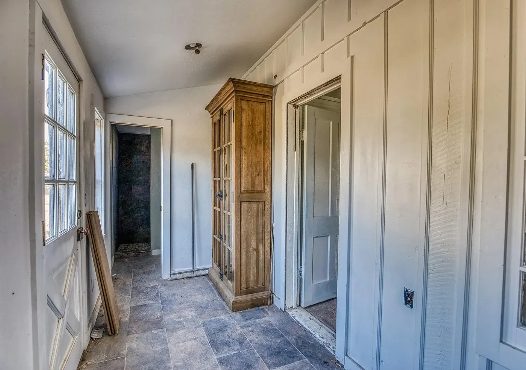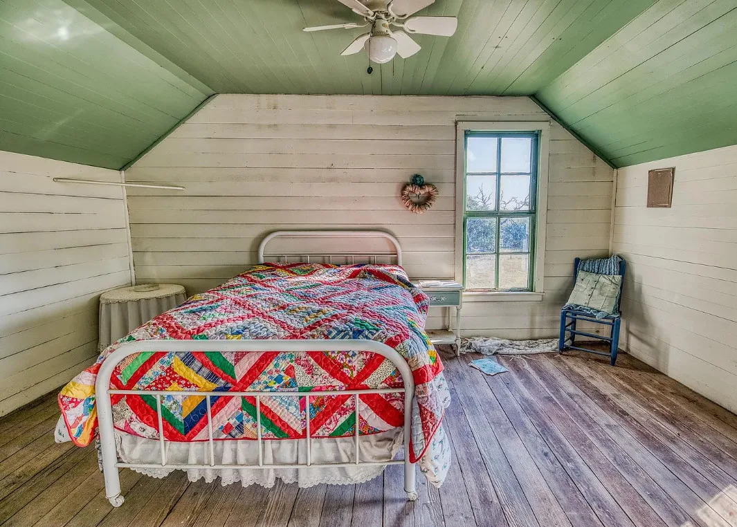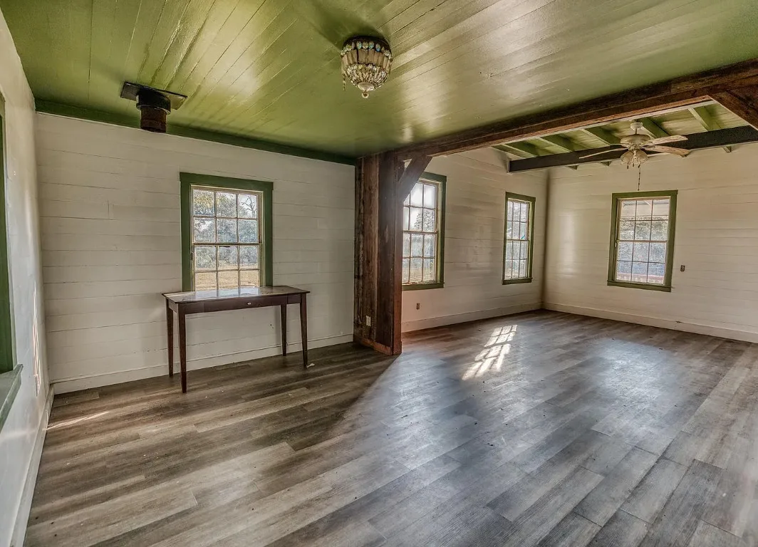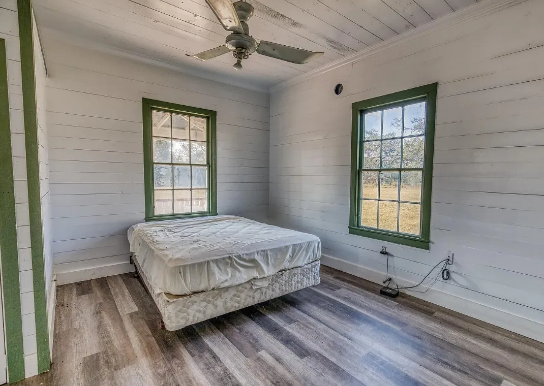 I want that stone structure! Love the old windmill too! The house was built in 1894. It is located on five acres in La Grange, Texas. The house could use some undoing of past renovations, especially that flooring. The house features a covered front porch, a small upper porch, a spacious kitchen, wood walls and wood ceilings. There are multiple outbuildings, including an old stone building they are calling an old smokehouse. Three bedrooms, and one bathroom. $375,000