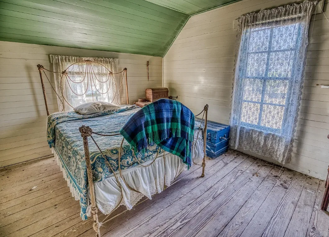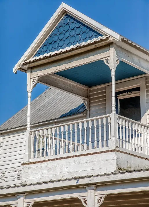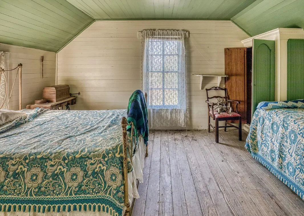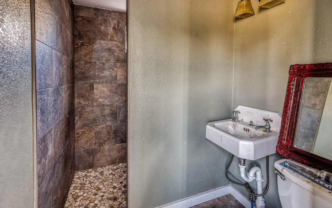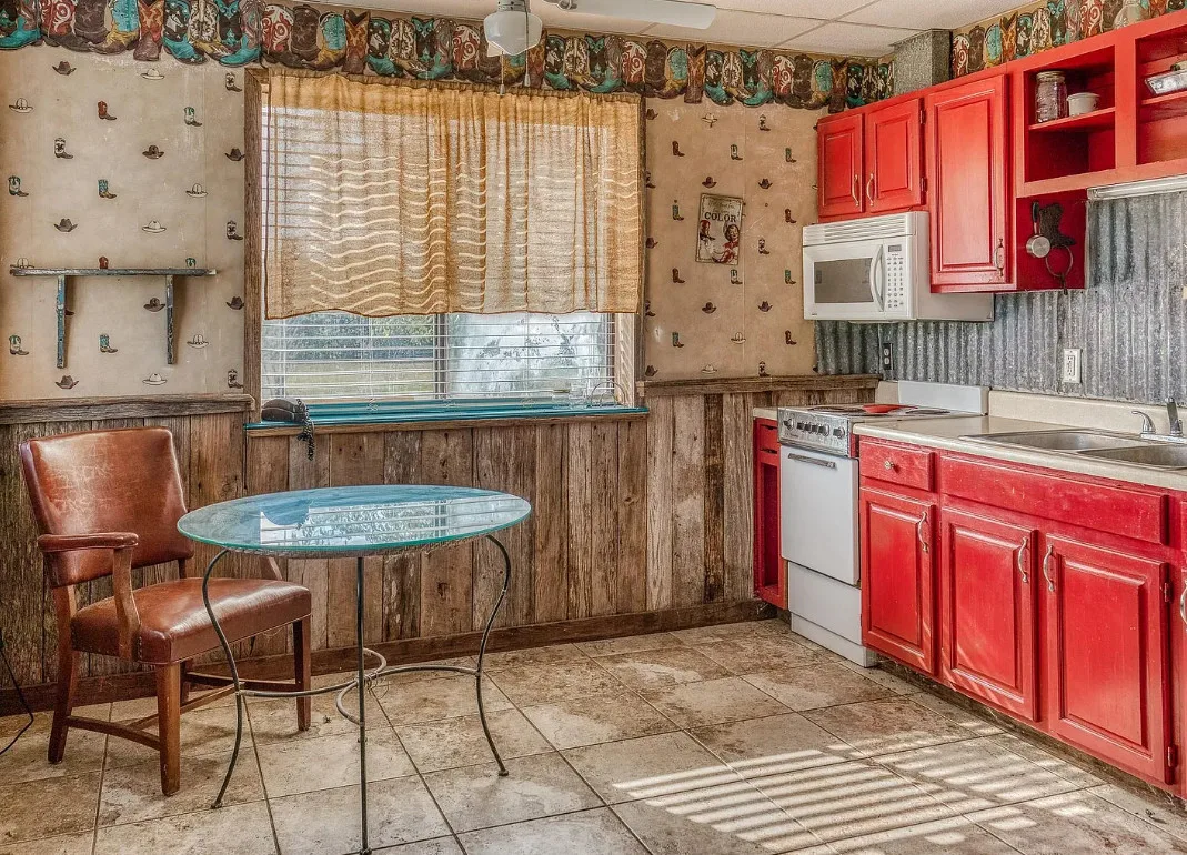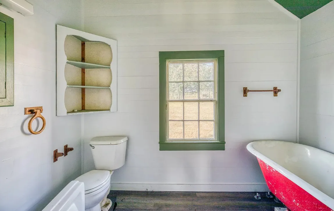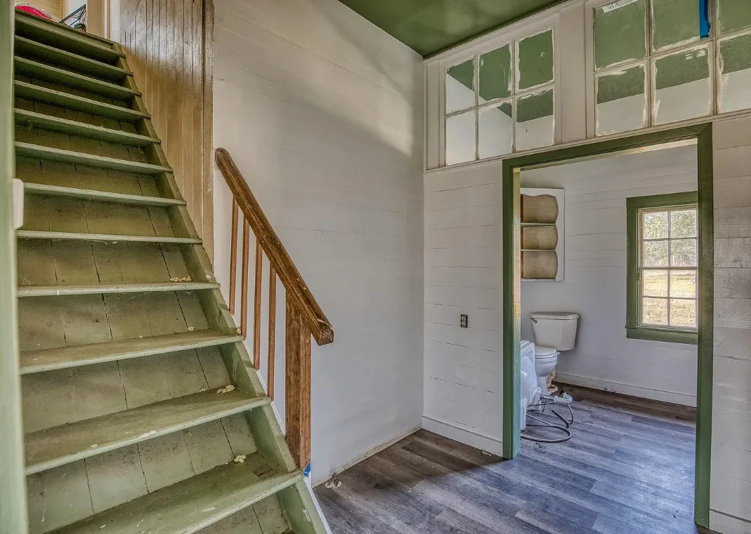 I want that stone structure! Love the old windmill too! The house was built in 1894. It is located on five acres in La Grange, Texas. The house could use some undoing of past renovations, especially that flooring. The house features a covered front porch, a small upper porch, a spacious kitchen, wood walls and wood ceilings. There are multiple outbuildings, including an old stone building they are calling an old smokehouse. Three bedrooms, and one bathroom. $375,000