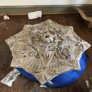 Traditional medallions were made from Plaster of Paris, cast in molds or shaped directly on the ceiling by hand. Skilled plasterers used wood, wax, or clay molds to create the designs, reinforcing them with hemp or horsehair for strength.