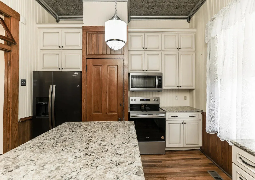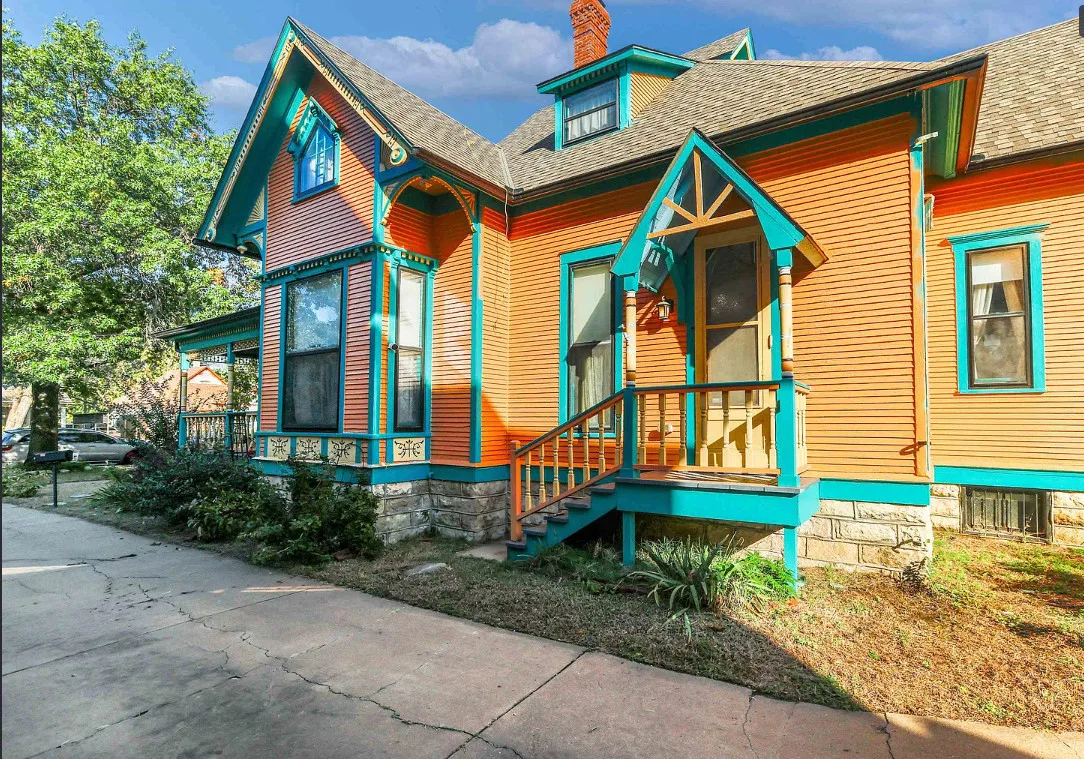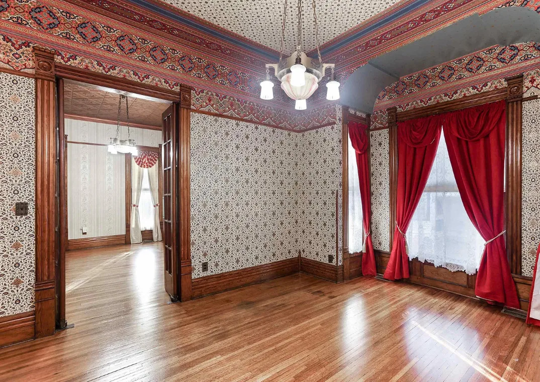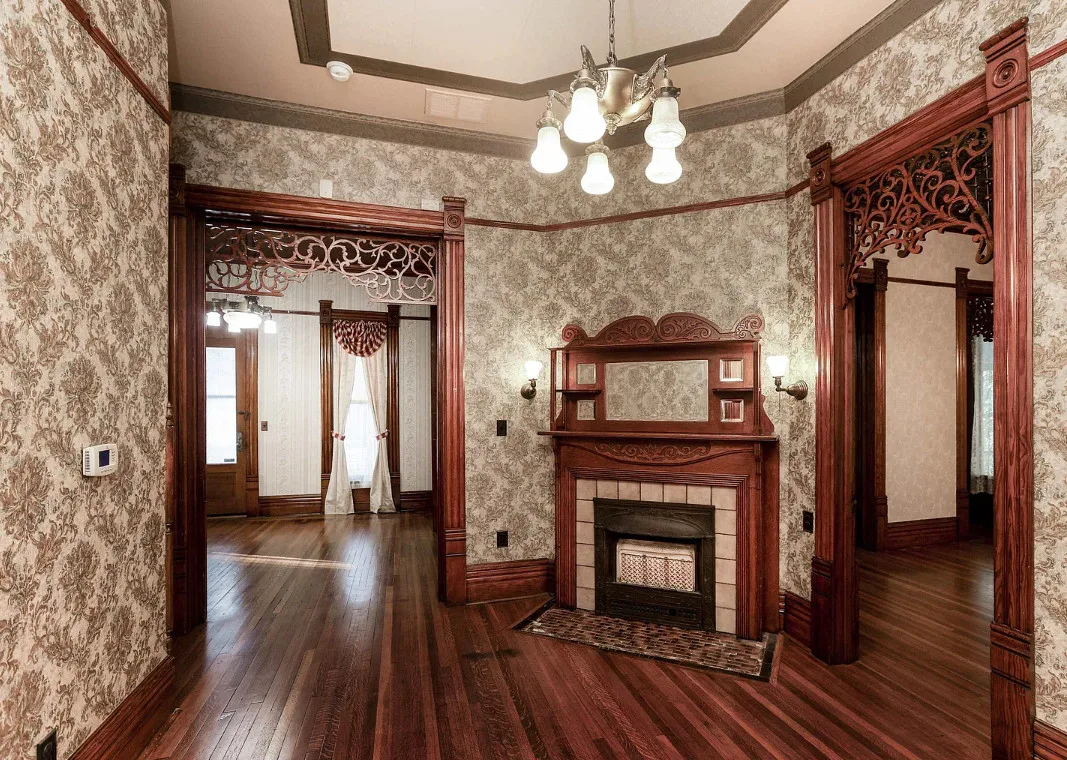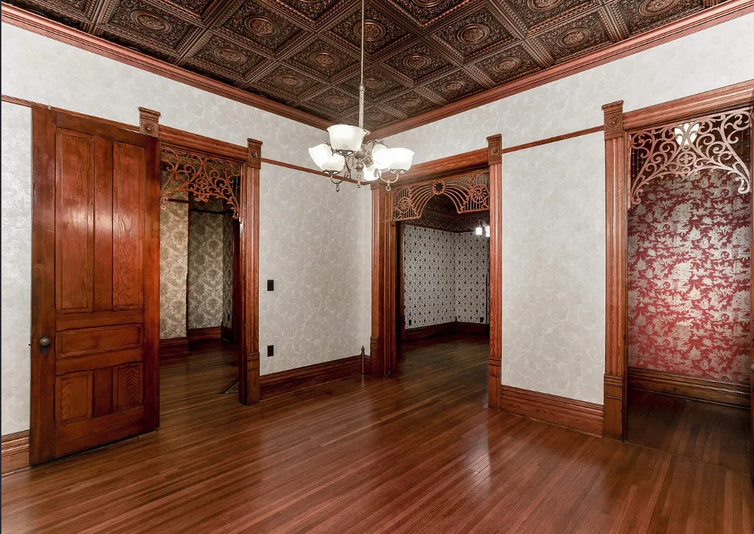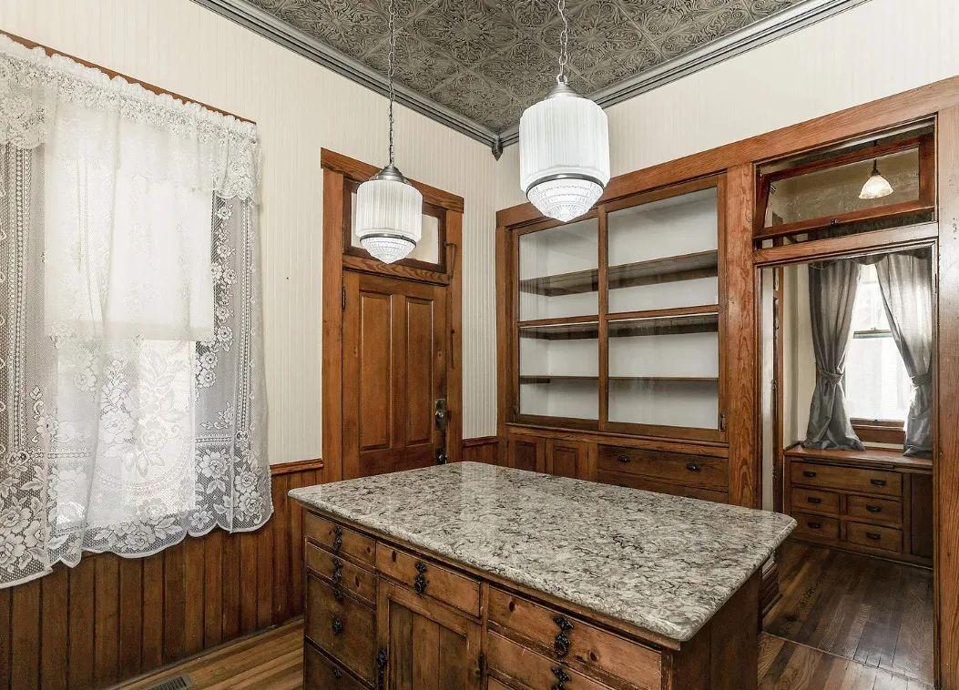 Take a look inside “The Market Street Cottage”. A true Victorian interior. The Market Street Cottage was built in 1884. It is located in Wichita, Kansas. The house features a covered front porch, wood floors, original fretwork, pressed tin ceiling, baseboards, crown moulding, french doors, beautiful butler’s pantry and an updated kitchen. There is a basement. Three bedrooms, two bathrooms and 2,066 square feet. $199,000