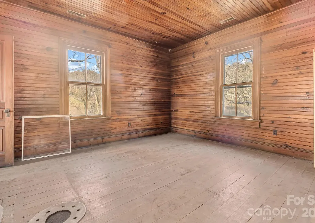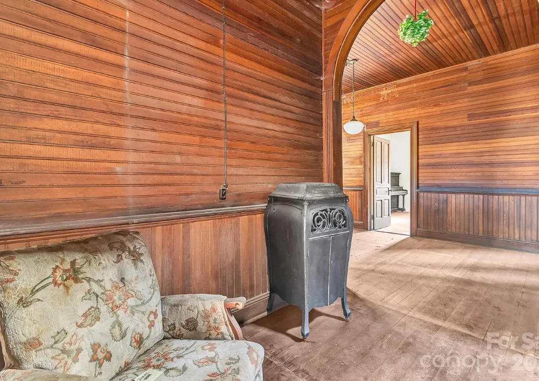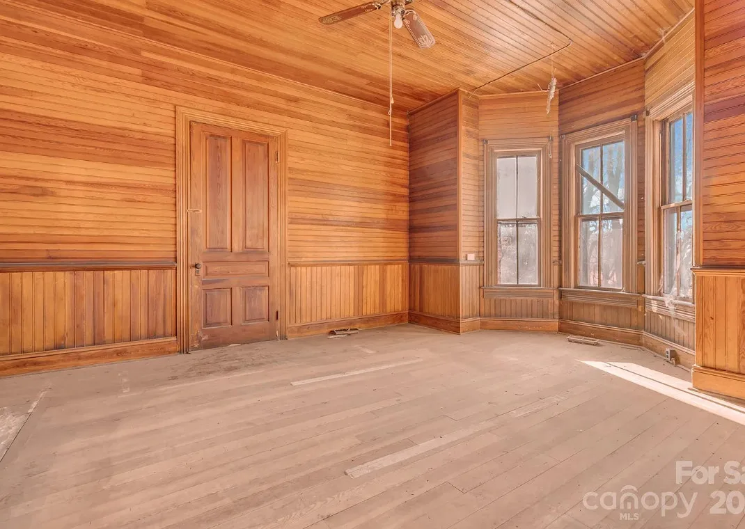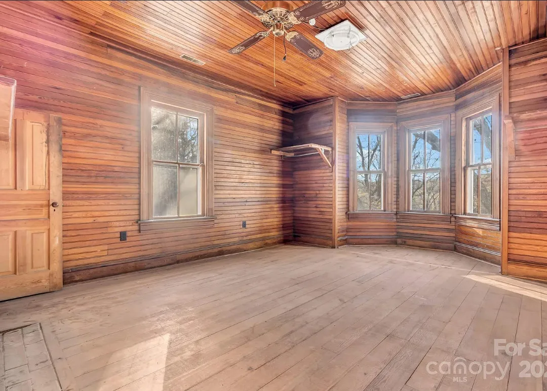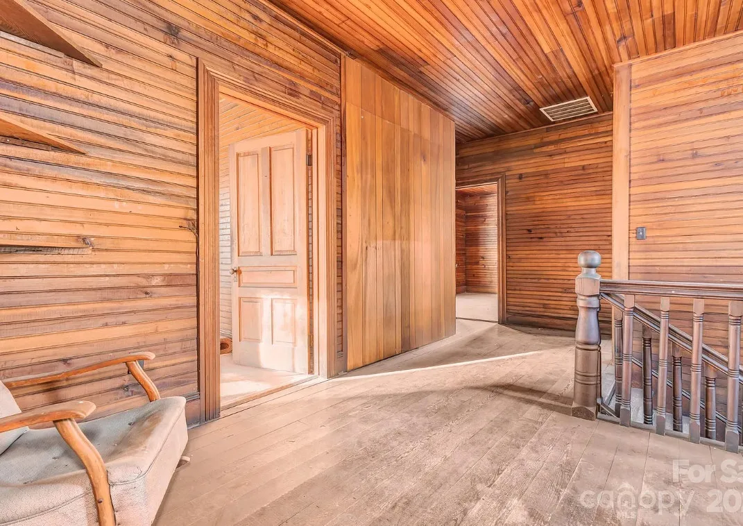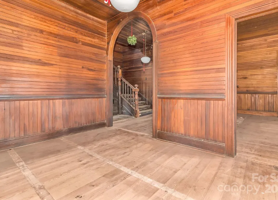 This house has some pretty woodwork! The setting looks private! The house was built in 1895. It is located on 1.35 acres in Fairview, North Carolina. The house features a covered front porch, original wood floors, tall ceilings, vintage light fixtures, beautiful bead board and a pretty staircase. The house needs work. Price seems a tad high to me. Four bedrooms, two bathrooms and 3,380 square feet. $350,000