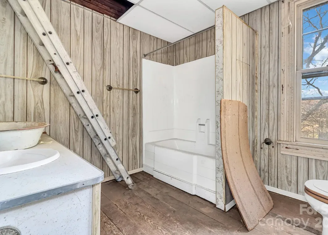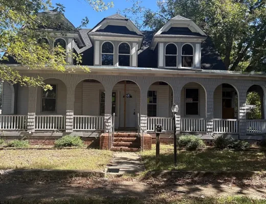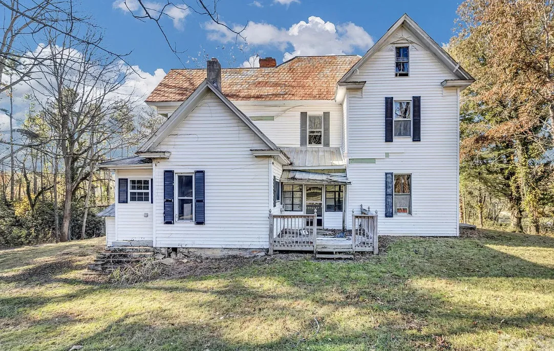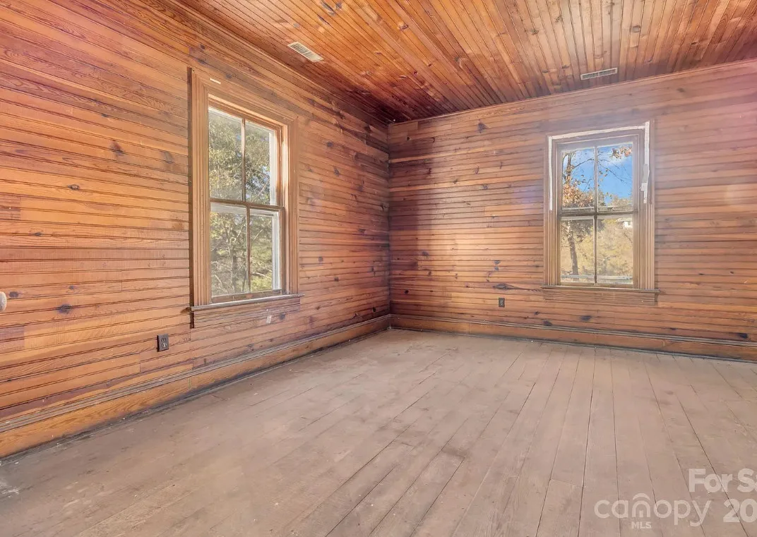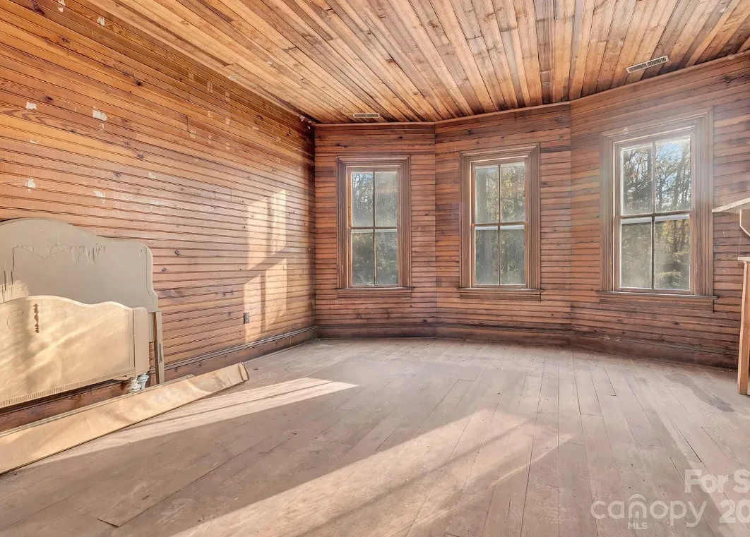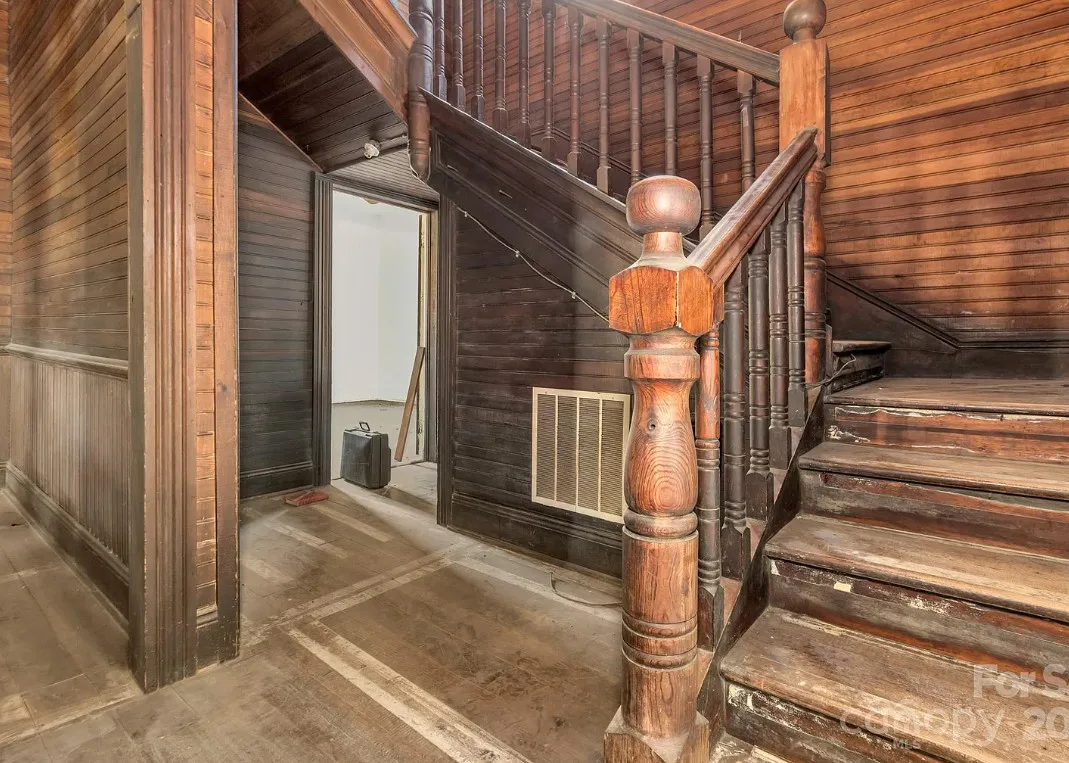 This house has some pretty woodwork! The setting looks private! The house was built in 1895. It is located on 1.35 acres in Fairview, North Carolina. The house features a covered front porch, original wood floors, tall ceilings, vintage light fixtures, beautiful bead board and a pretty staircase. The house needs work. Price seems a tad high to me. Four bedrooms, two bathrooms and 3,380 square feet. $350,000