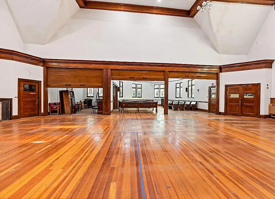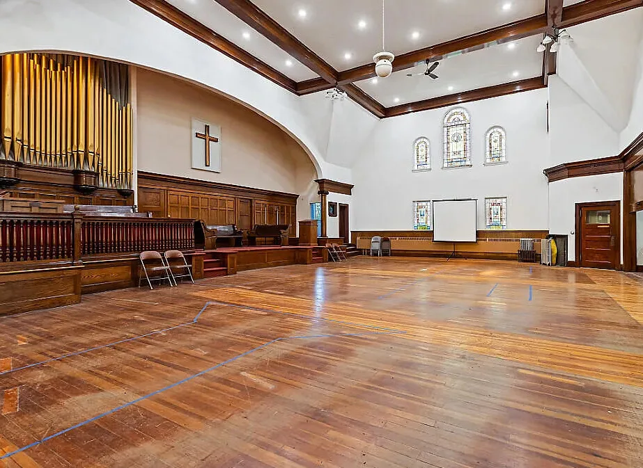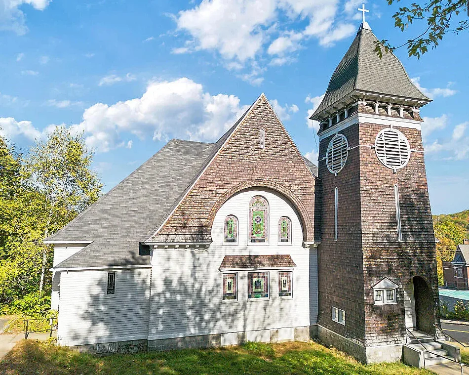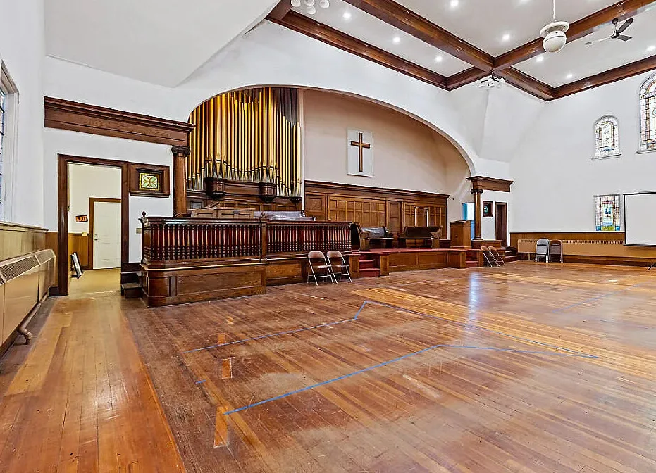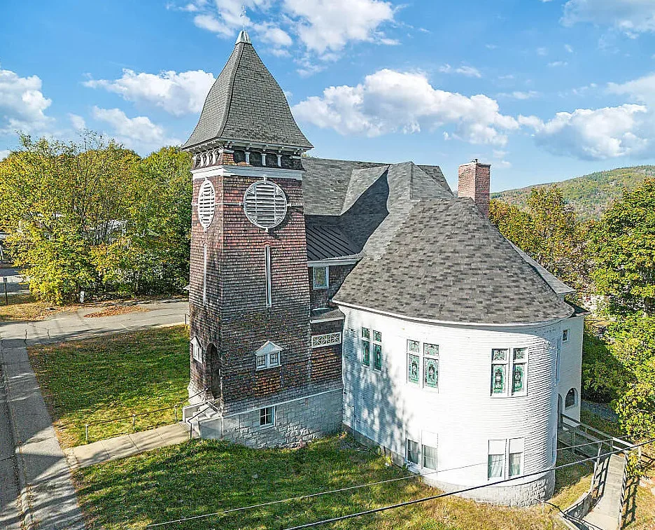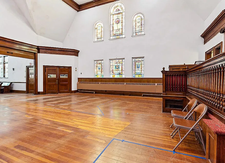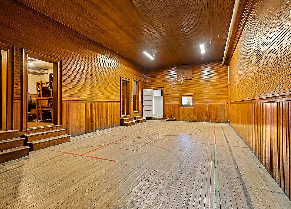 This is a pretty cool looking church! There is even a basketball court inside. The Rumford Falls First Baptist Church was built in 1902. It is located in Rumford, Maine. The church features wood floors, vaulted ceilings, pipe organ, stained glass, church pews, basketball court and double front doors. Two bedrooms, six bathrooms and 4,442 square feet. $150,000