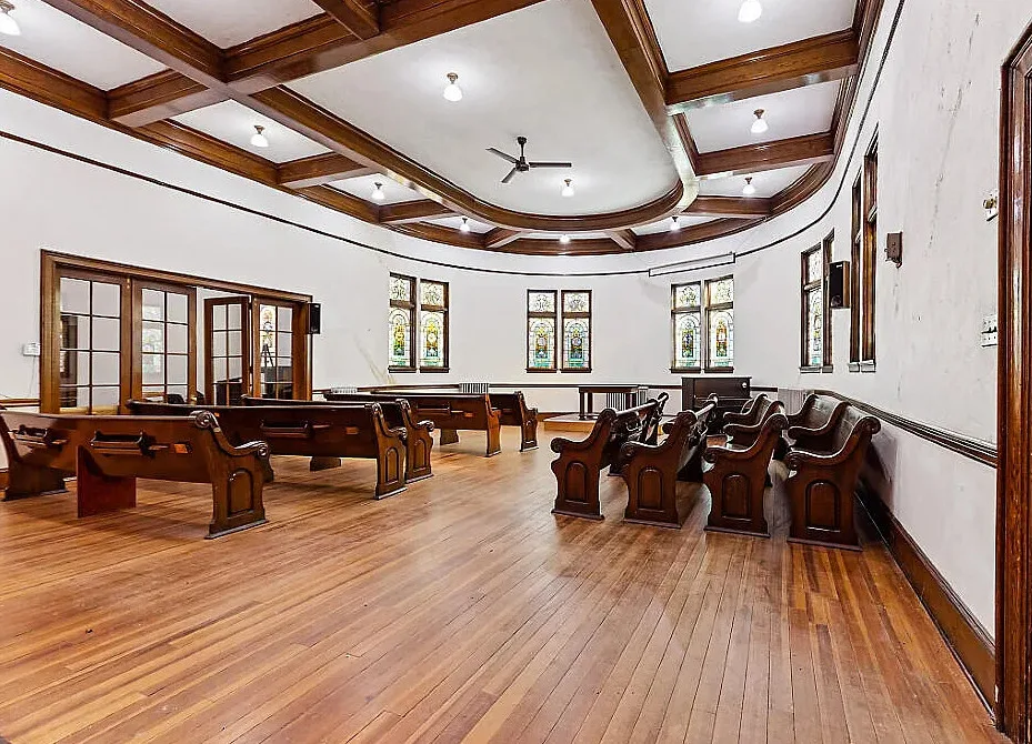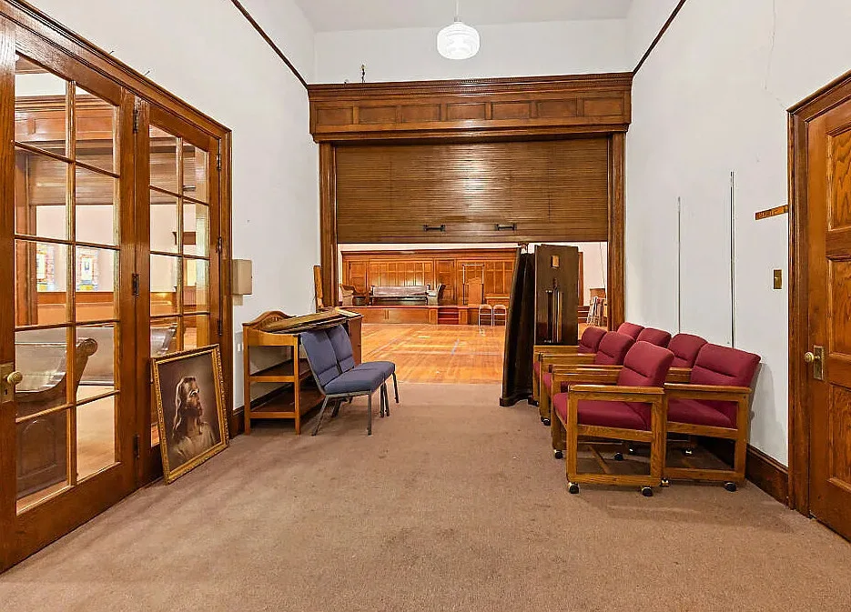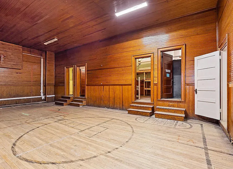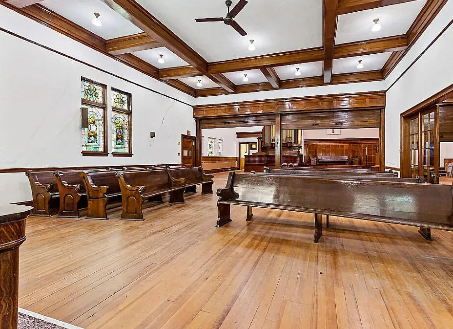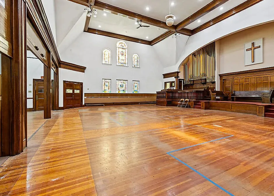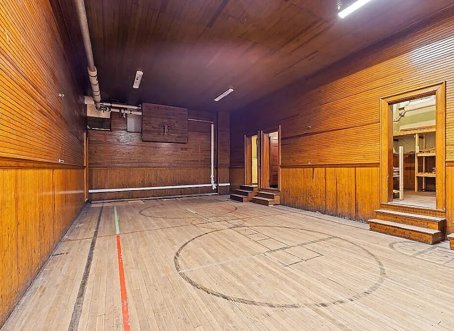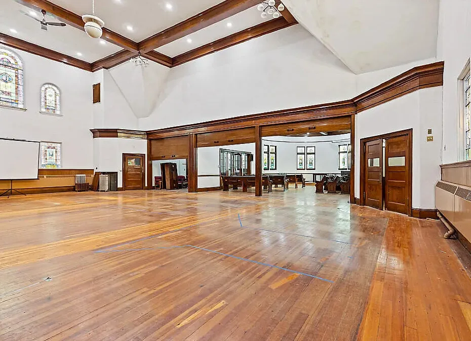 This is a pretty cool looking church! There is even a basketball court inside. The Rumford Falls First Baptist Church was built in 1902. It is located in Rumford, Maine. The church features wood floors, vaulted ceilings, pipe organ, stained glass, church pews, basketball court and double front doors. Two bedrooms, six bathrooms and 4,442 square feet. $150,000