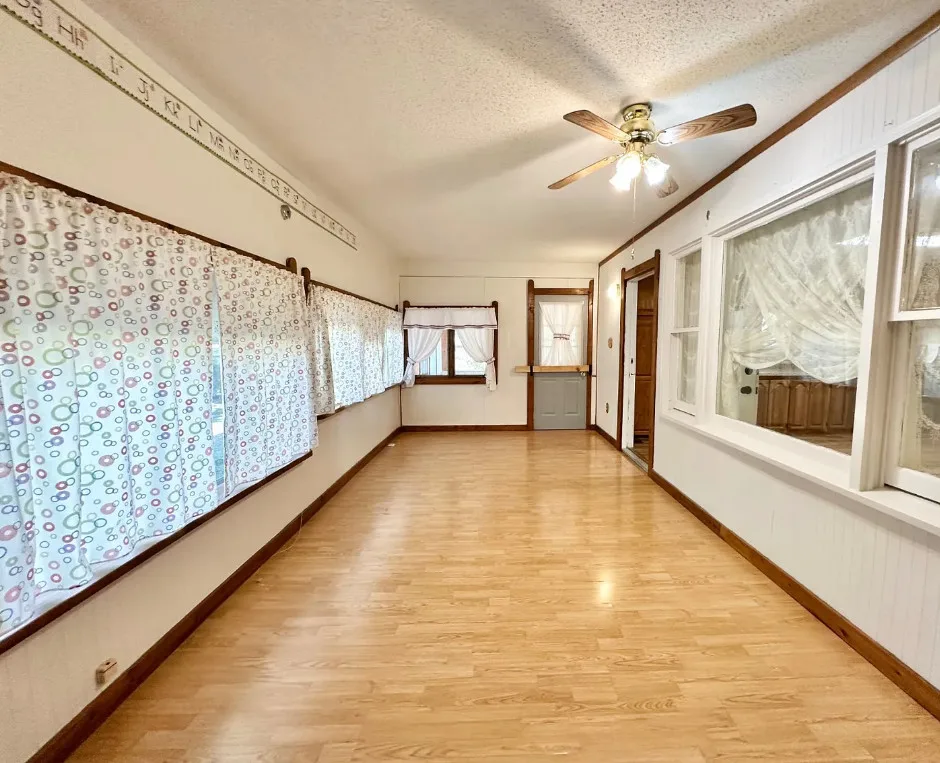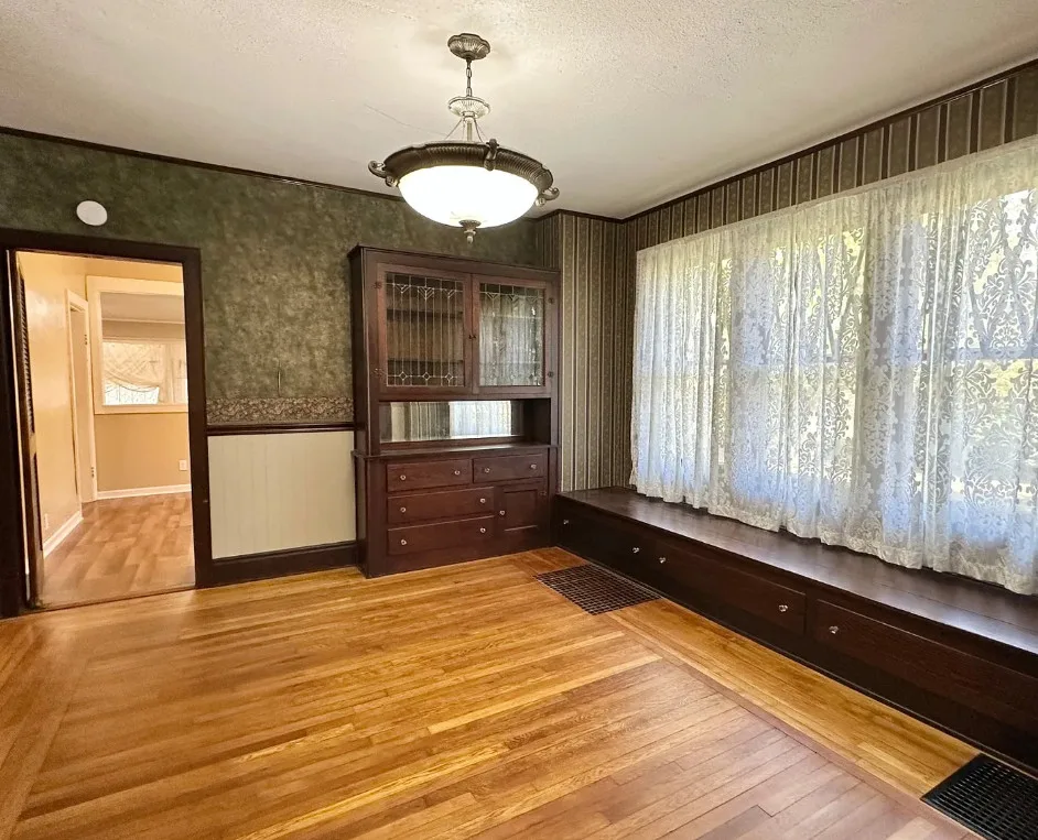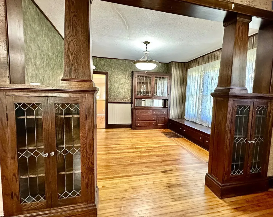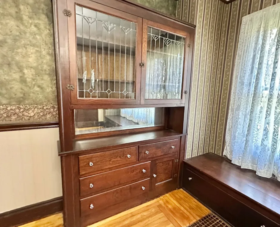 This house has pretty details inside! The house was built in 1917. It is located on .31 acre in Farina, Illinois. The house features a covered front porch, a detached three car garage, wood floors, baseboards, built-in bookshelves, leaded glass windows, in-laid hardwood floors and a built-in china cabinet. There is a nice screened in porch out back. Three bedrooms, one bathroom and 2,387 square feet. $187,000