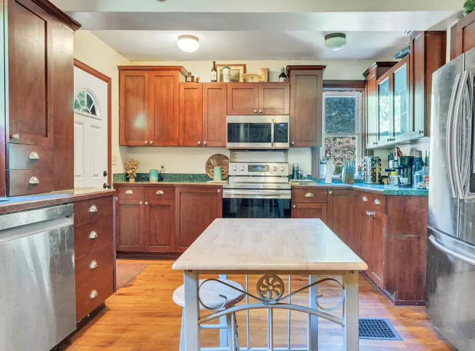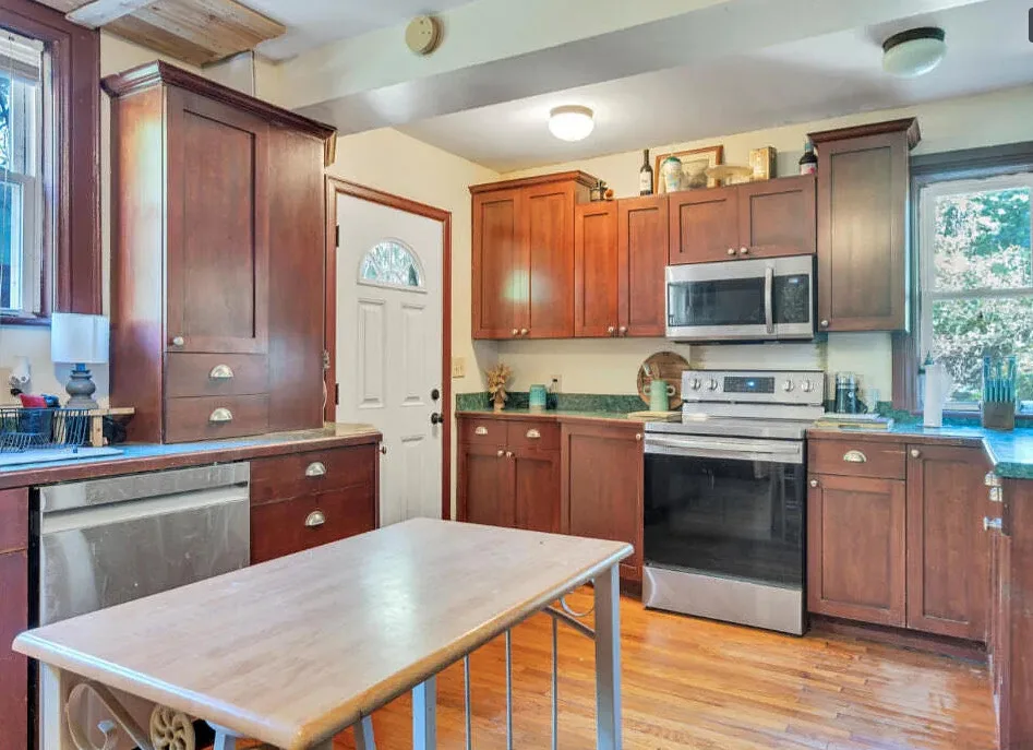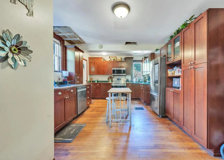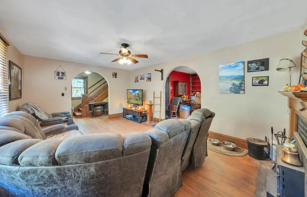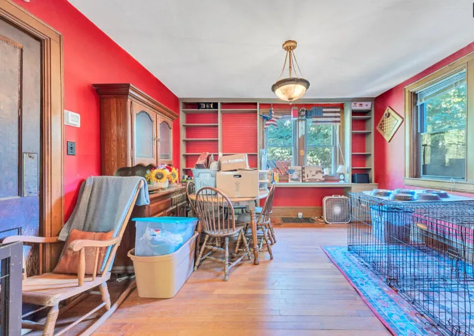 I love how this house has so many mature trees in the yard! Gives it privacy! The house was built in 1931. It is located on .34 acre in Boones Mill, Virginia. The house features a covered side porch, original wood floors, arched entryways, wide baseboards, built-in bookshelves and a spacious kitchen. Four bedrooms, one bathroom and 1,857 square feet. $225,000