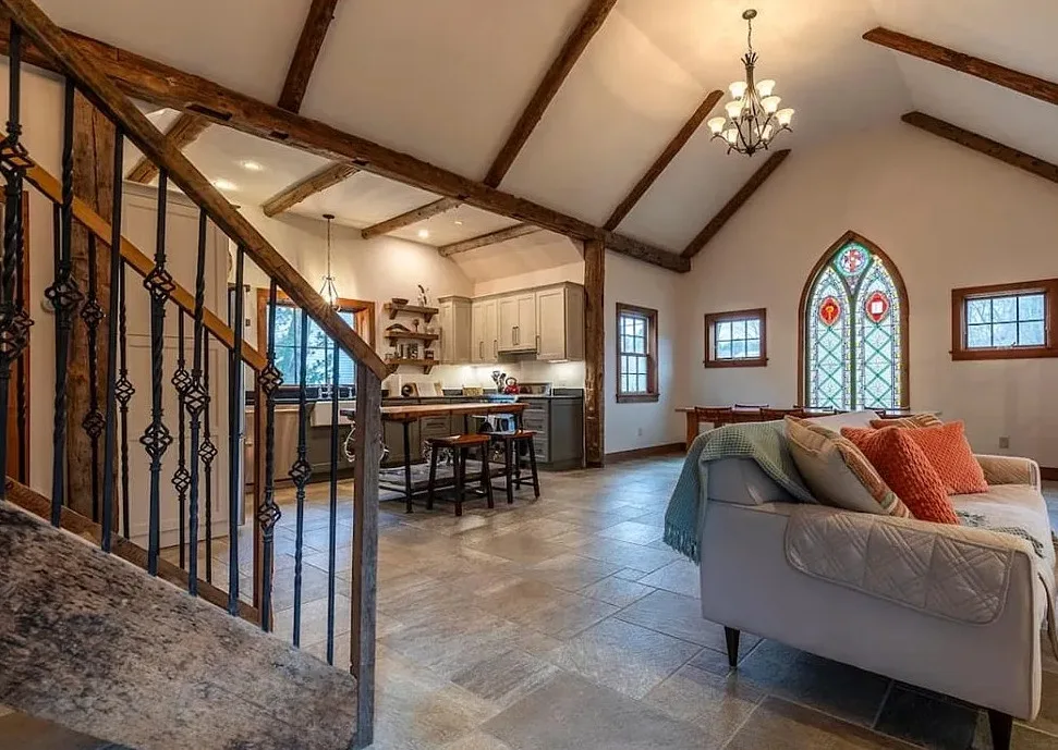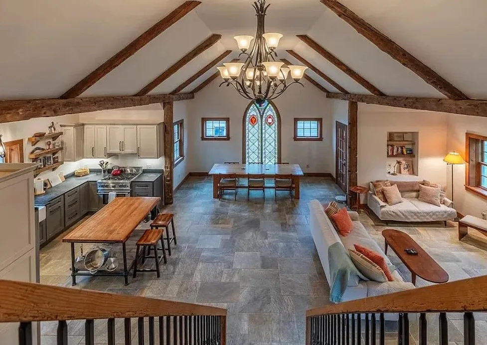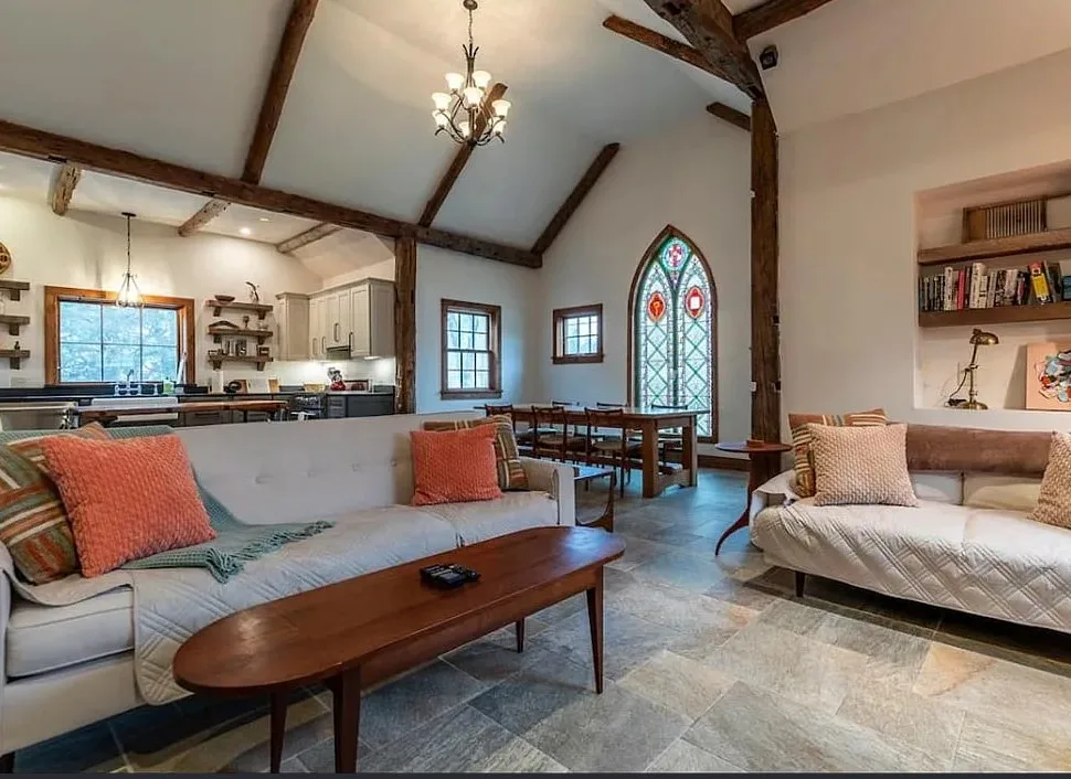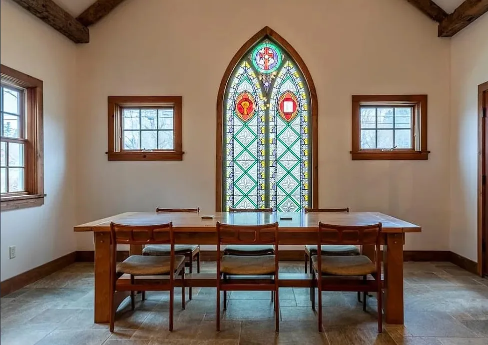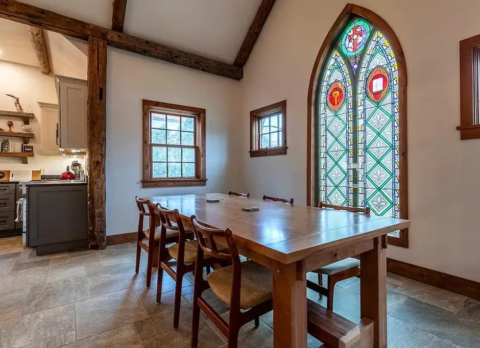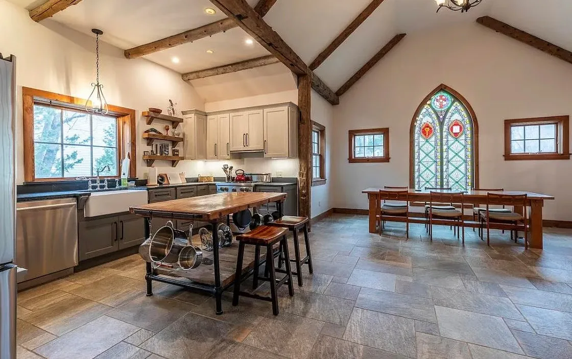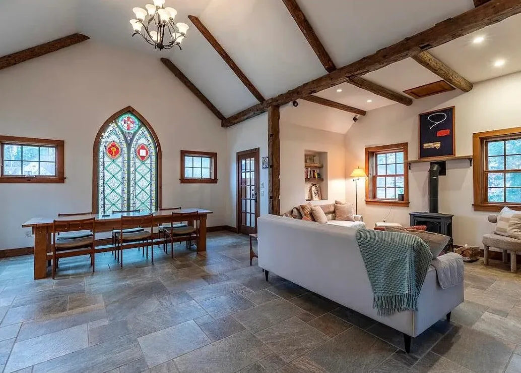 This Vermont church had a pretty amazing transformation into a private residence! The church was built in 1860. It is located in Londonderry, Vermont. The church/house features shake shingle siding, vaulted ceiling, exposed beams, stained glass windows, nice kitchen, wood stove and a claw foot tub. There is a large back patio and a nice backyard. Three bedrooms, two bathrooms and 1,751 square feet. $485,000