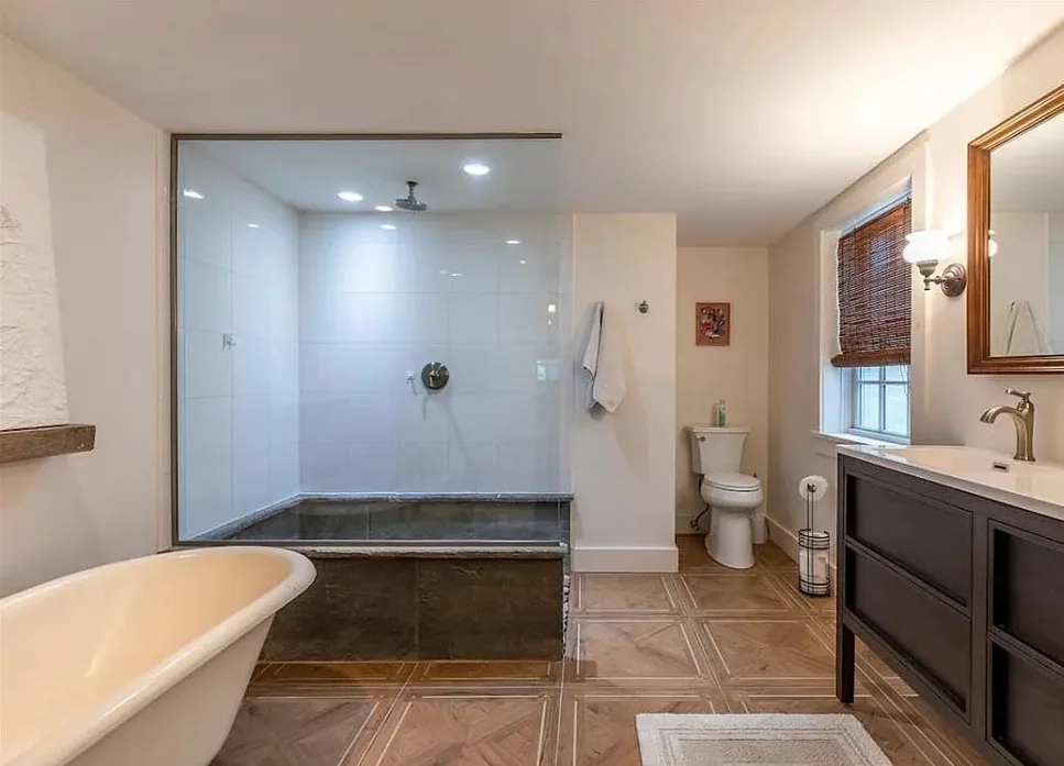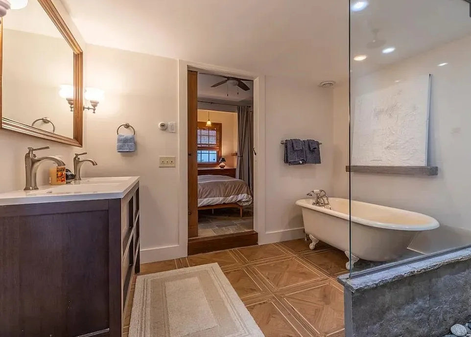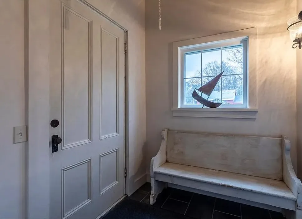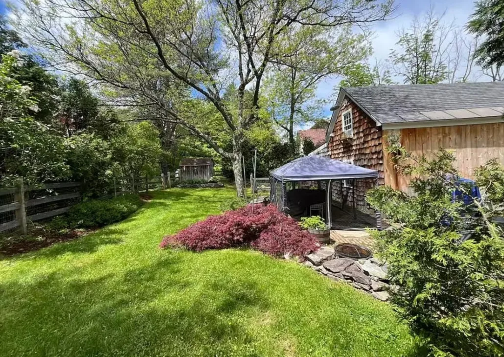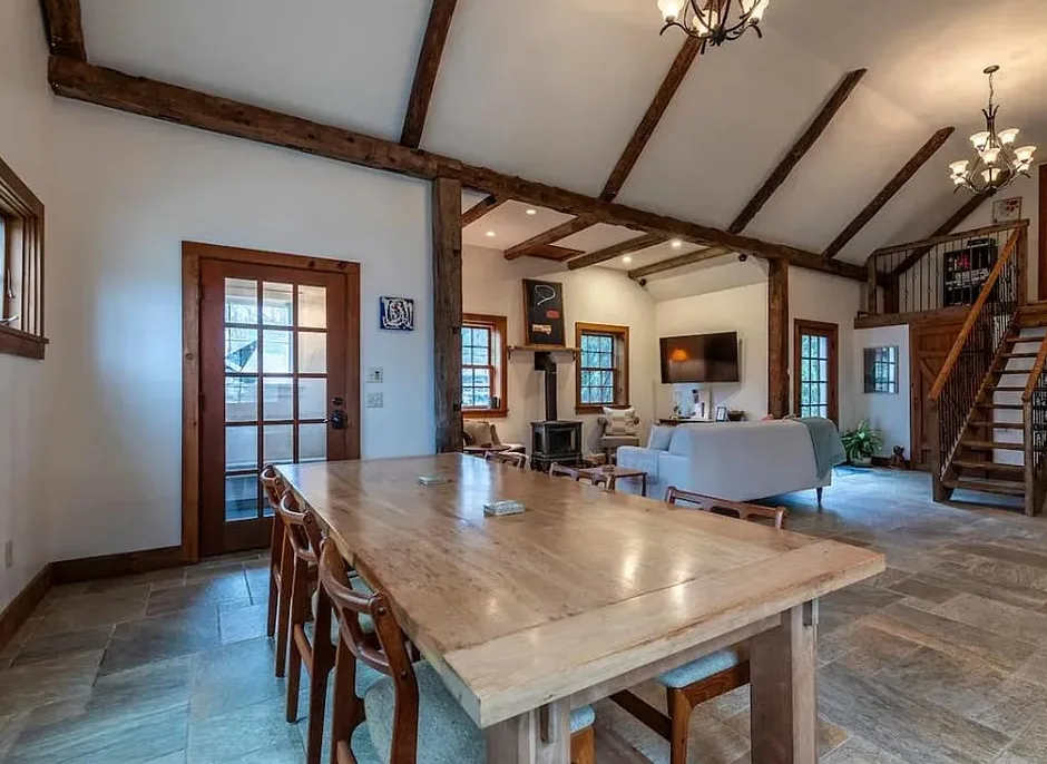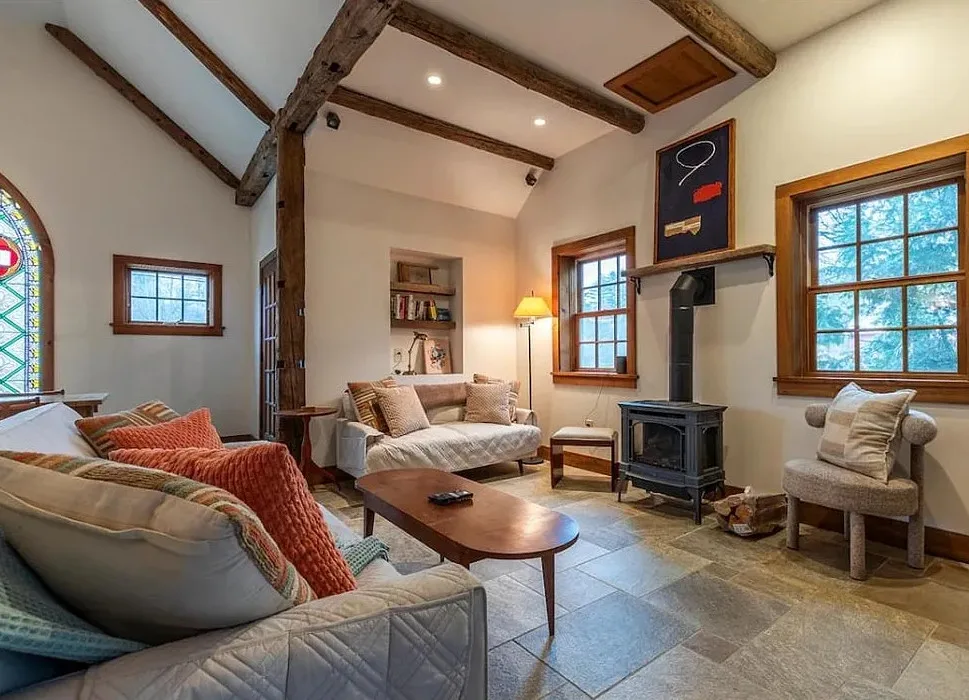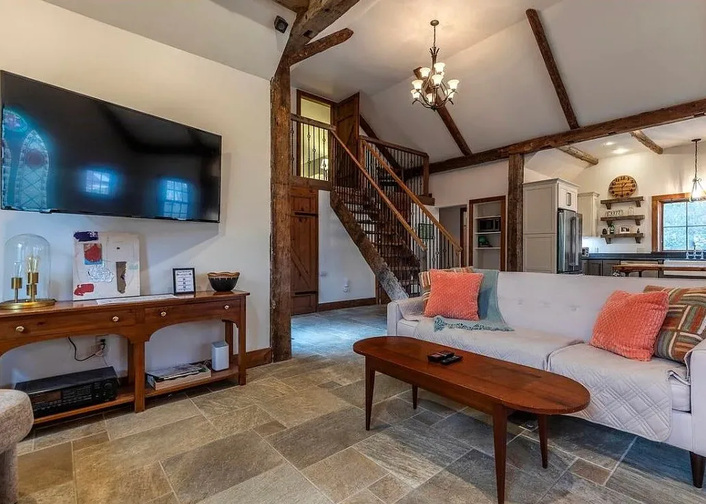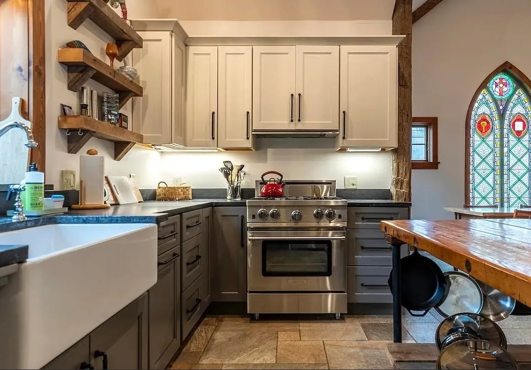 This Vermont church had a pretty amazing transformation into a private residence! The church was built in 1860. It is located in Londonderry, Vermont. The church/house features shake shingle siding, vaulted ceiling, exposed beams, stained glass windows, nice kitchen, wood stove and a claw foot tub. There is a large back patio and a nice backyard. Three bedrooms, two bathrooms and 1,751 square feet. $485,000