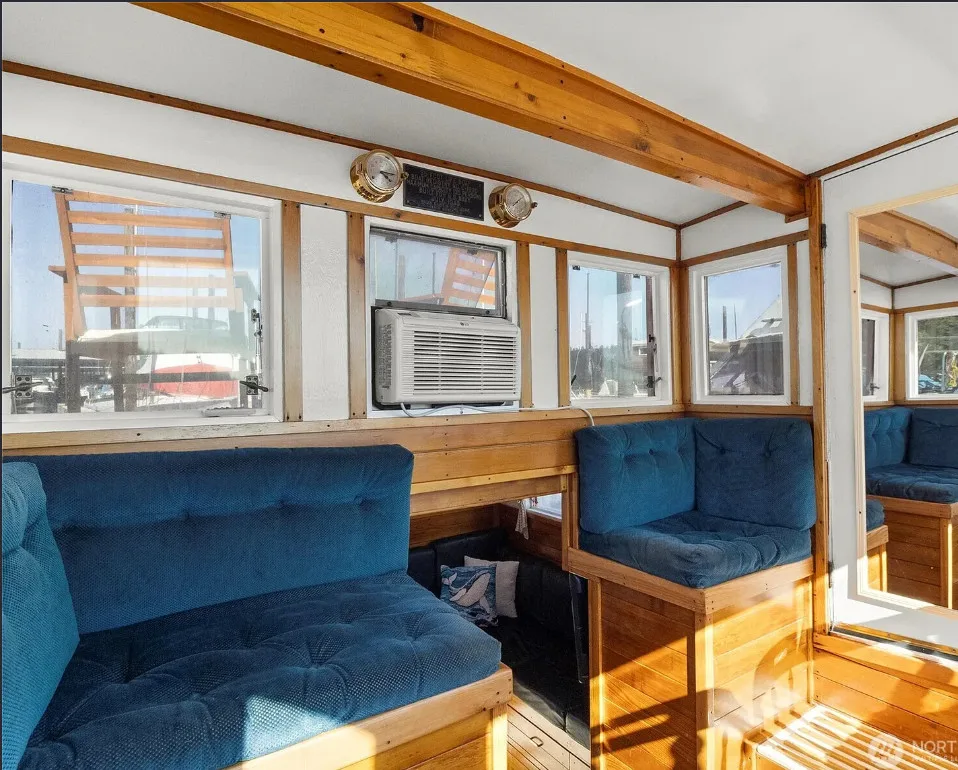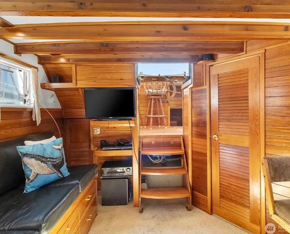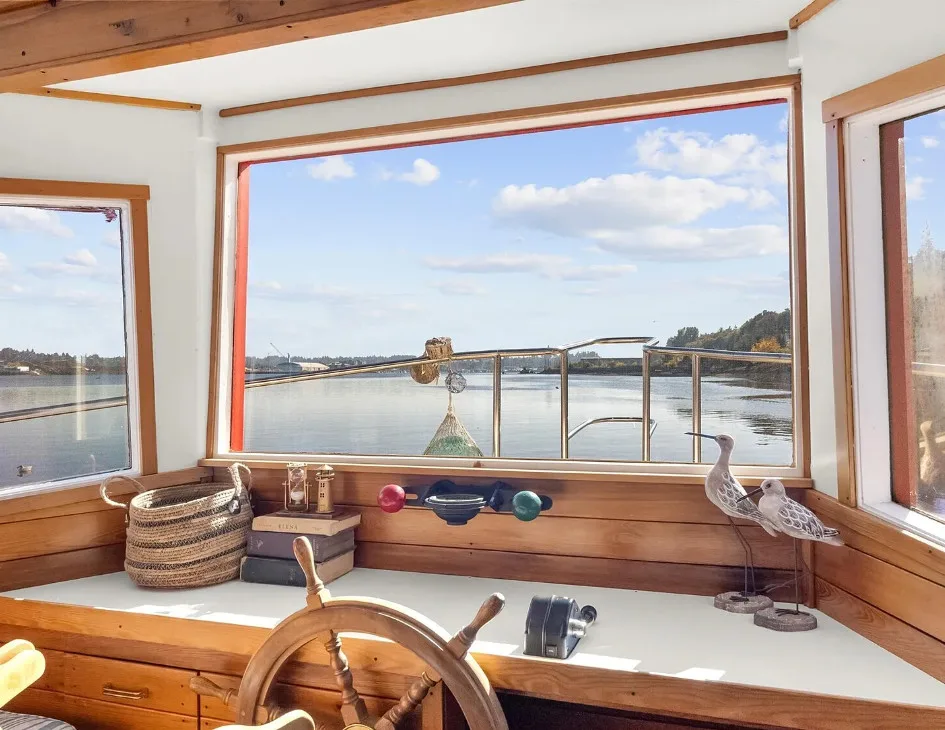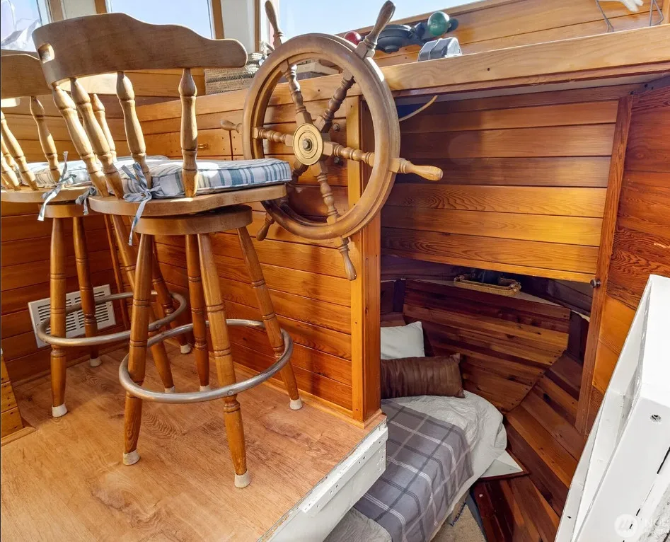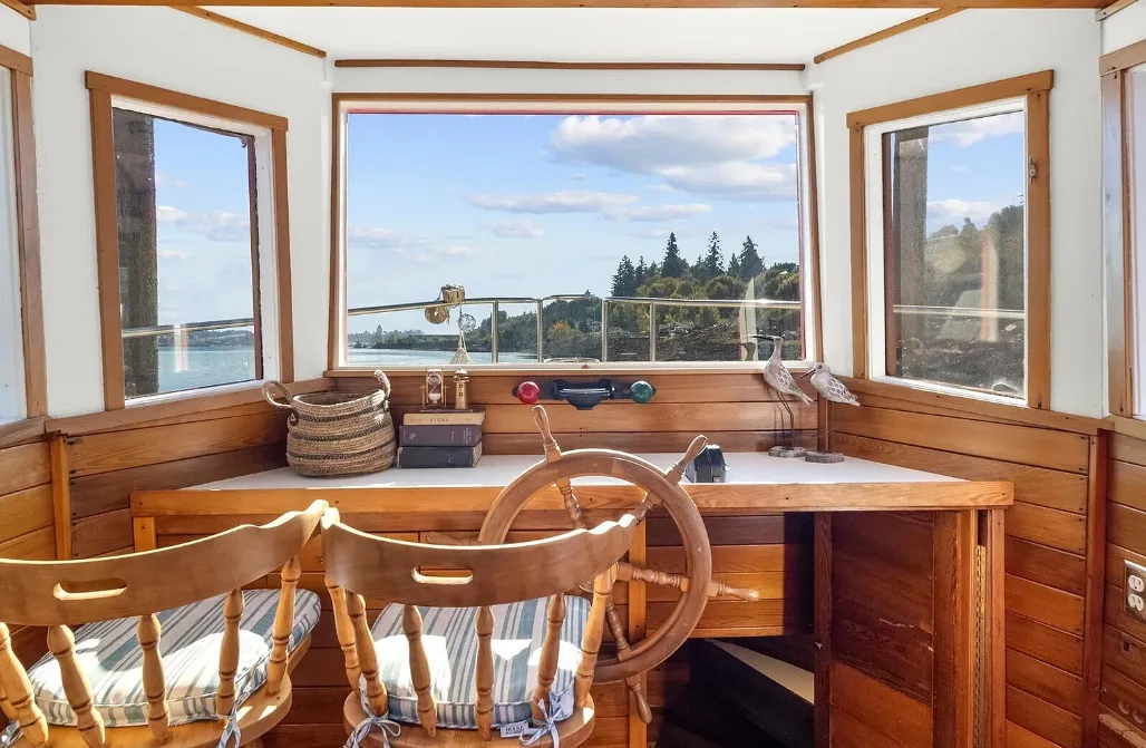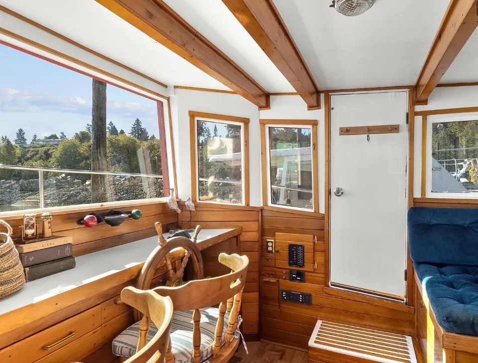 This is so cool and I want it! I love the interior! This Naval trawler was constructed in 1940. It is located in Olympia, Washington. The boat slip fee at the marina is $436 a month or the boat could be moved. I can imagine sitting on that rooftop having a glass of wine in the evening. Perfection. It is situated in Olympia’s West Bay Marina. One bedroom, one bathroom and 300 square feet. $95,000
