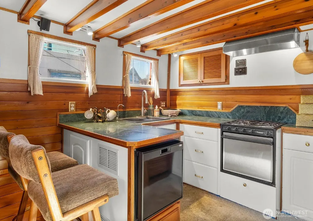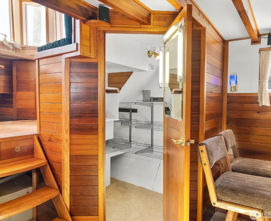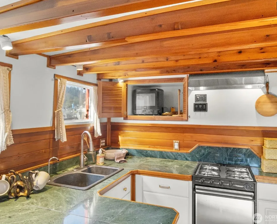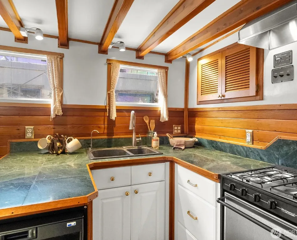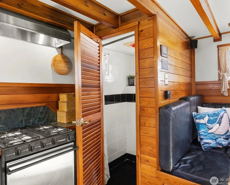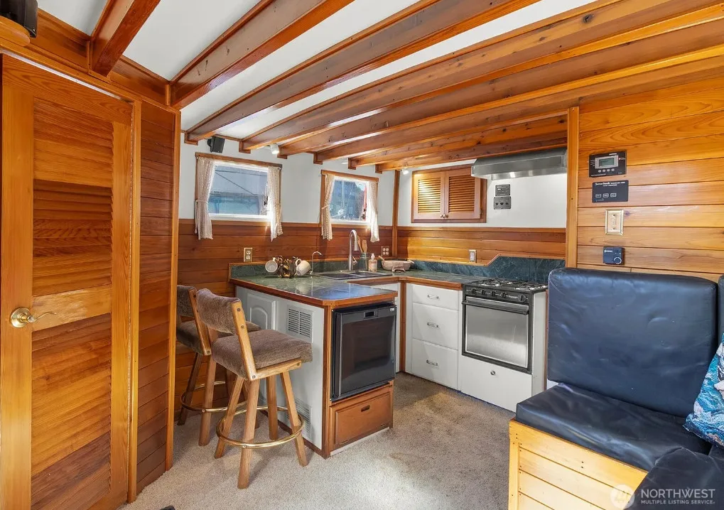 This is so cool and I want it! I love the interior! This Naval trawler was constructed in 1940. It is located in Olympia, Washington. The boat slip fee at the marina is $436 a month or the boat could be moved. I can imagine sitting on that rooftop having a glass of wine in the evening. Perfection. It is situated in Olympia’s West Bay Marina. One bedroom, one bathroom and 300 square feet. $95,000