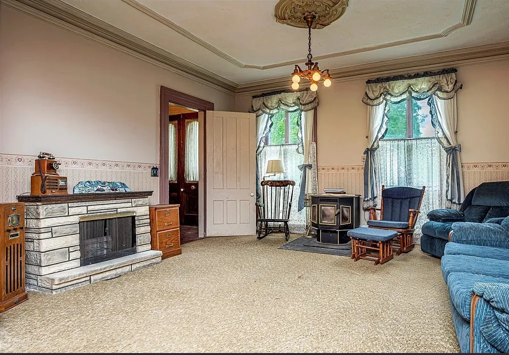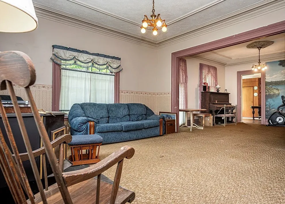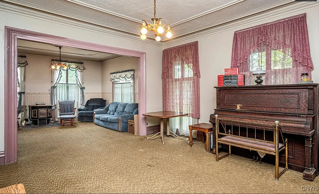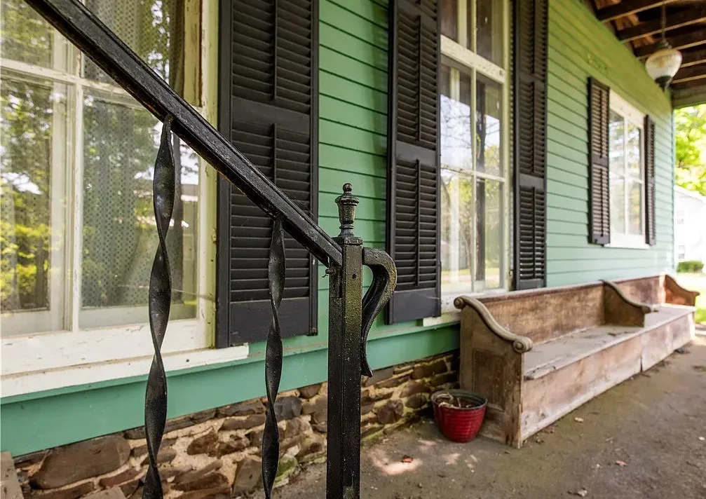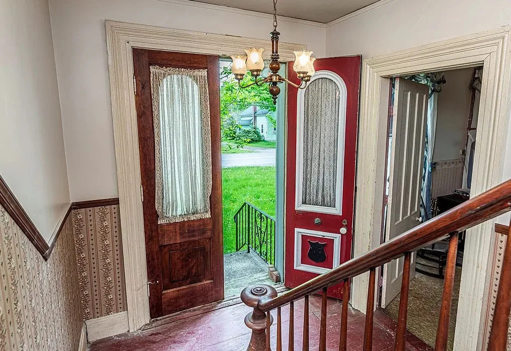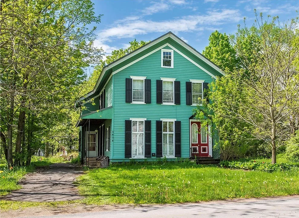 This house looks like a diamond in the rough! It has original details to work with! The house was built in 1860. It is located on 1.2 acres in Lee Center, New York. The house features double front doors, a covered side porch, nice staircase, baseboards, vintage light fixtures and ceiling medallions. There is a built in corner cabinet and crown moulding.The house definitely needs some work and undoing of past renovations, but it has nice potential. Four bedrooms, two bathrooms and 2,500 square feet. $119,900