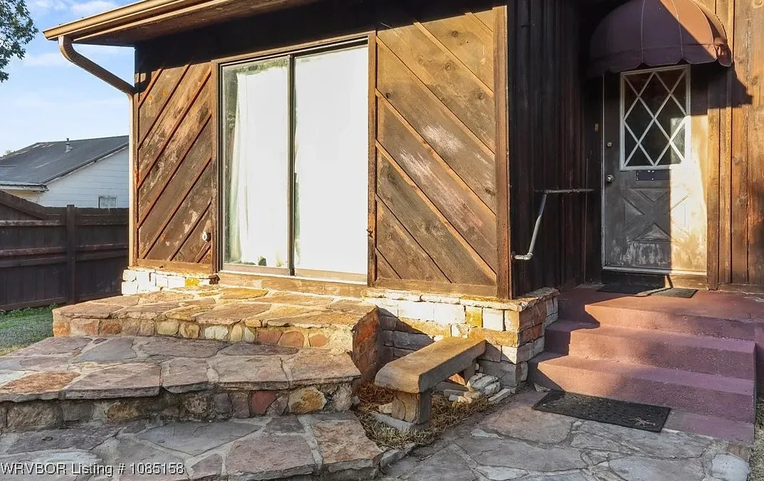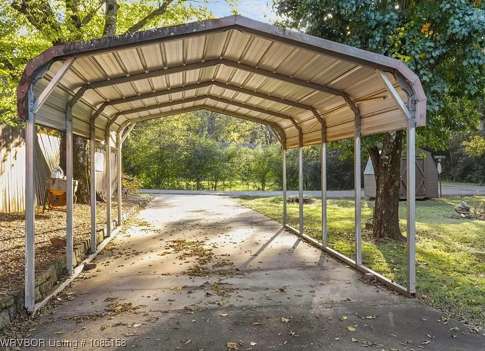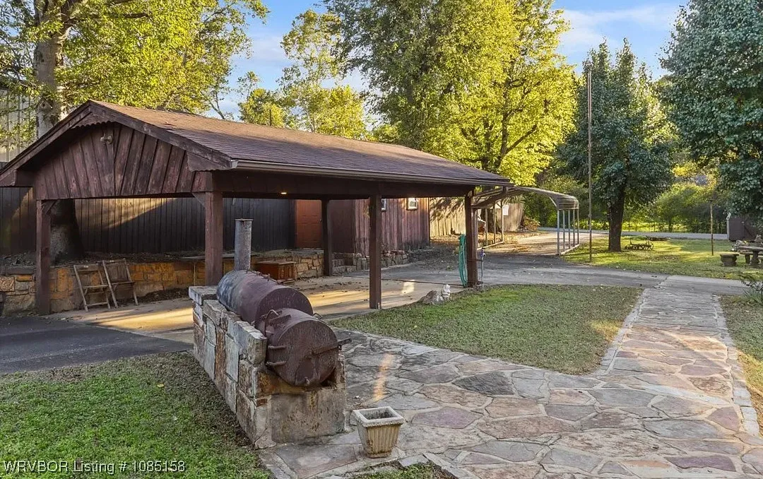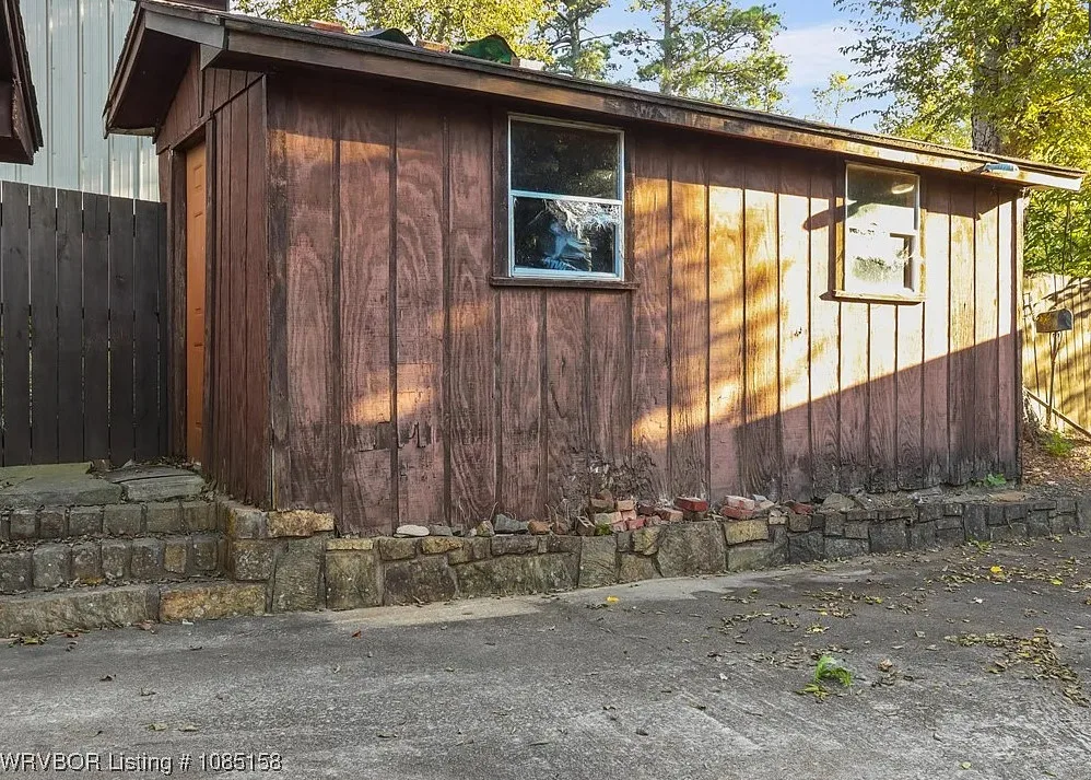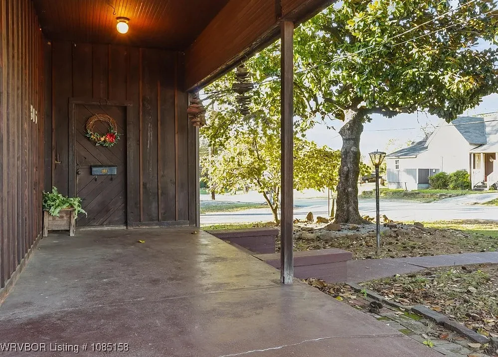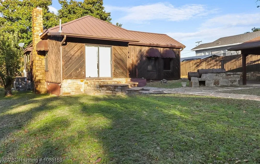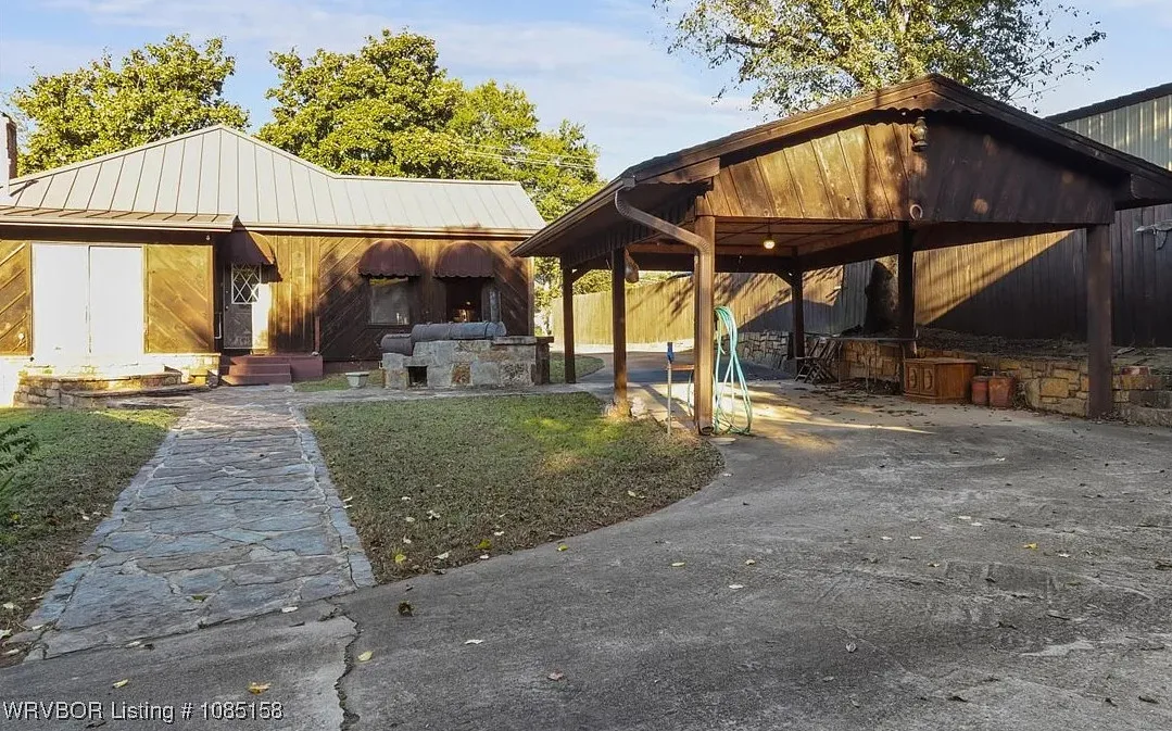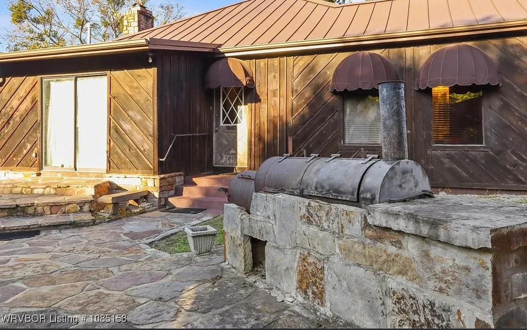 This is an interesting house in Oklahoma. I like the outdoor barbecue area. The house was built in 1910. It is located on .32 acre in Poteau, Oklahoma. The house features a large covered front porch, wood floors, brick fireplace in the kitchen, wainscoting and a large stone patio with barbecue. The property has two carports and a detached storage shed. Three bedrooms, two bathrooms and 1,521 square feet. $160,000