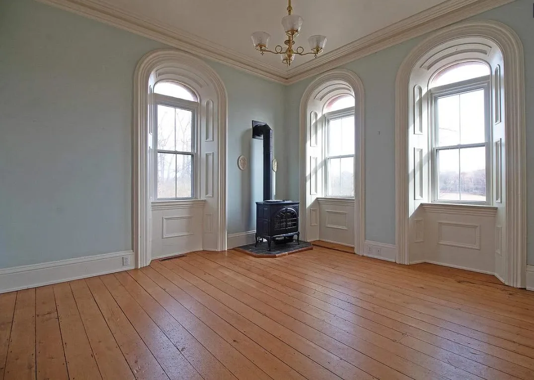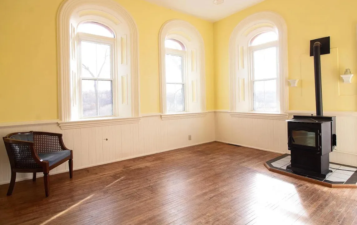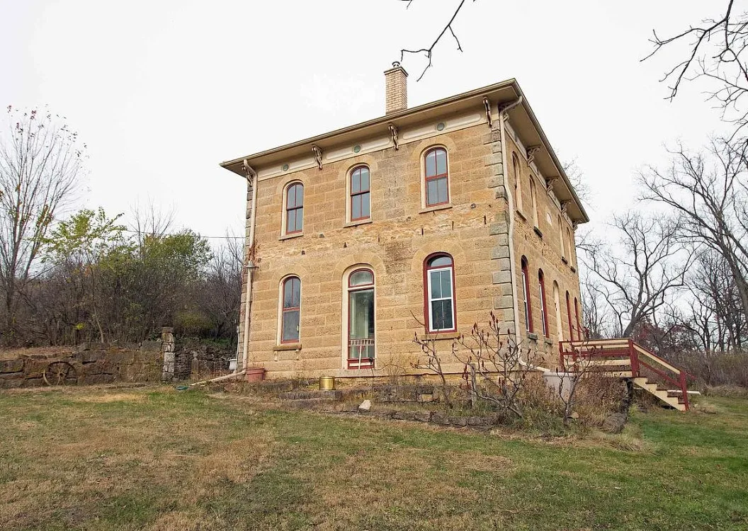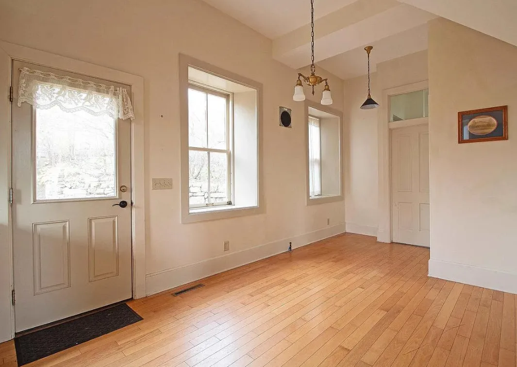 Don’t judge a book by its cover! Sure wasn’t expecting that interior! Love that this property has an apple and pear orchard! Known as the William M. Jones House. It was built in 1878. It is located on 5.17 acres in Barneveld, Wisconsin. The house features a limestone exterior, wood floors, arched windows, vintage light fixtures, wide baseboards, crown moulding and chair rails. There is a large basement. Four bedrooms, two bathrooms and 1,924 square feet. $486,000