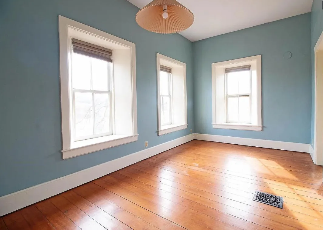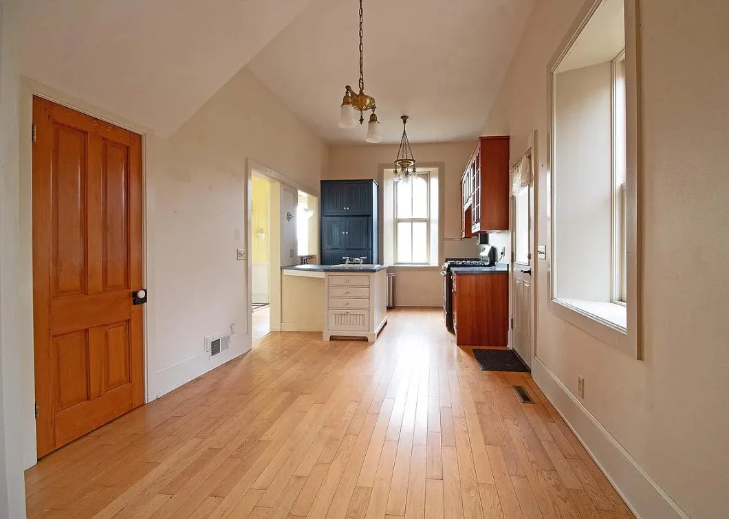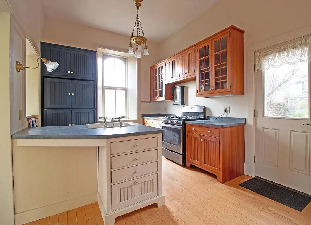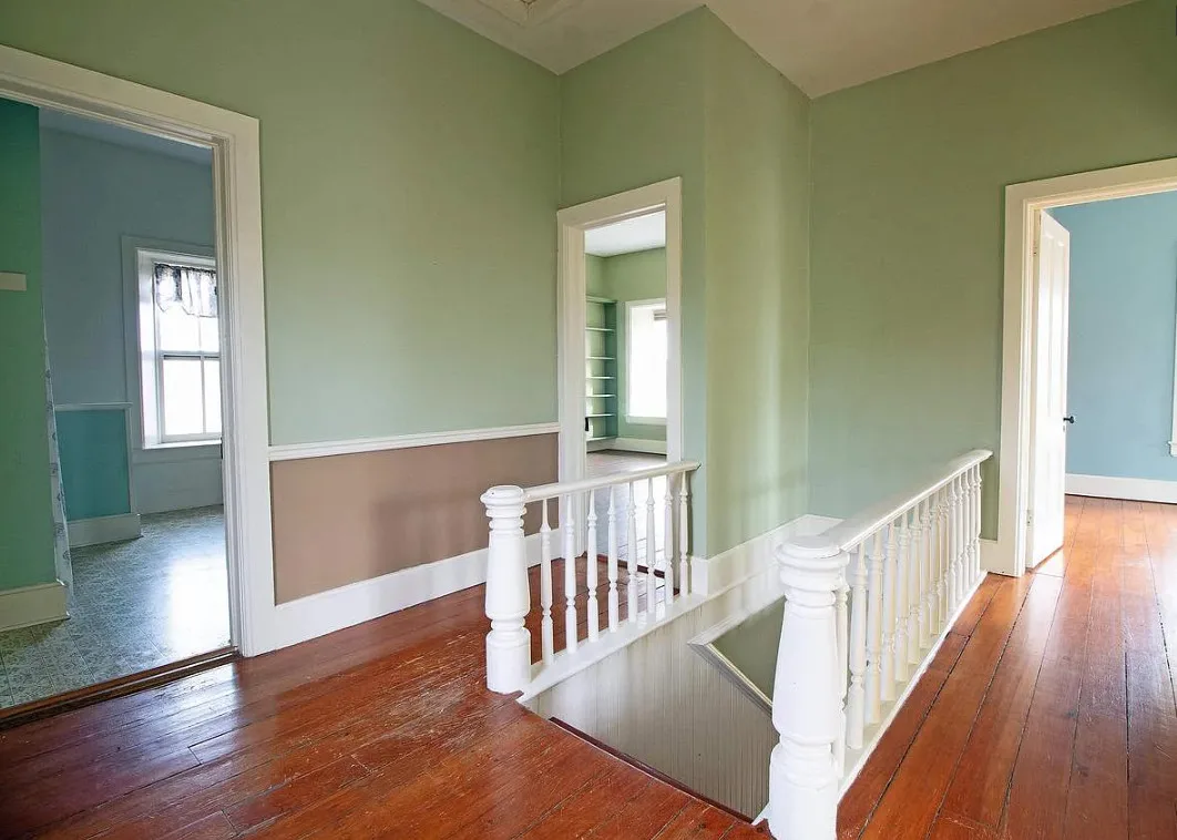Don’t judge a book by its cover! Sure wasn’t expecting that interior! Love that this property has an apple and pear orchard! Known as the William M. Jones House. It was built in 1878. It is located on 5.17 acres in Barneveld, Wisconsin. The house features a limestone exterior, wood floors, arched windows, vintage light fixtures, wide baseboards, crown moulding and chair rails. There is a large basement. Four bedrooms, two bathrooms and 1,924 square feet. $486,000