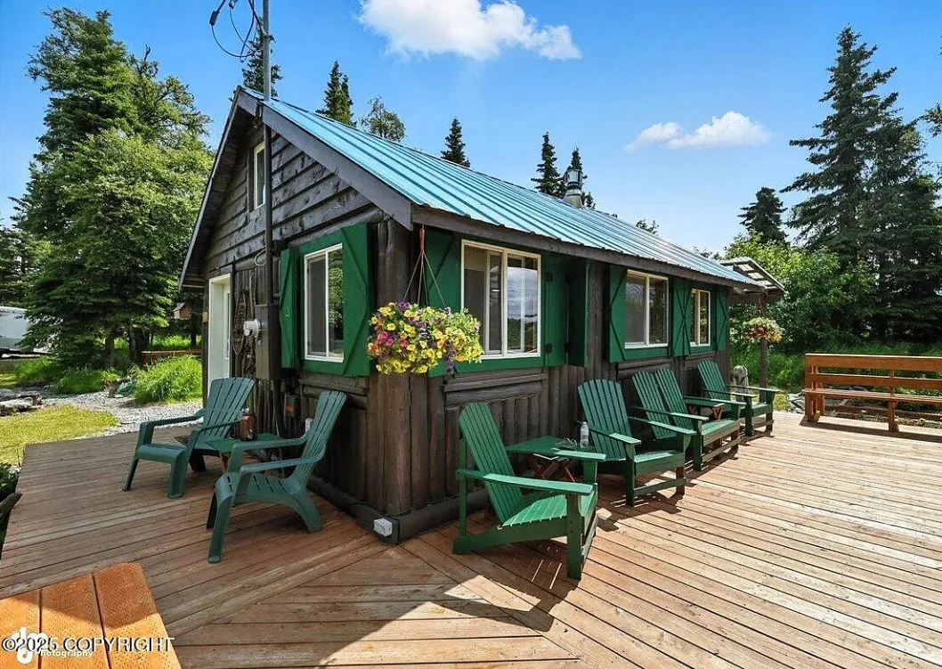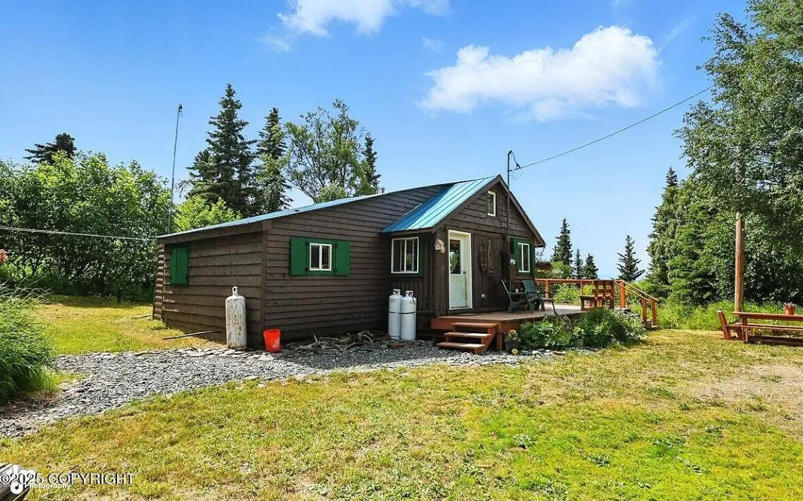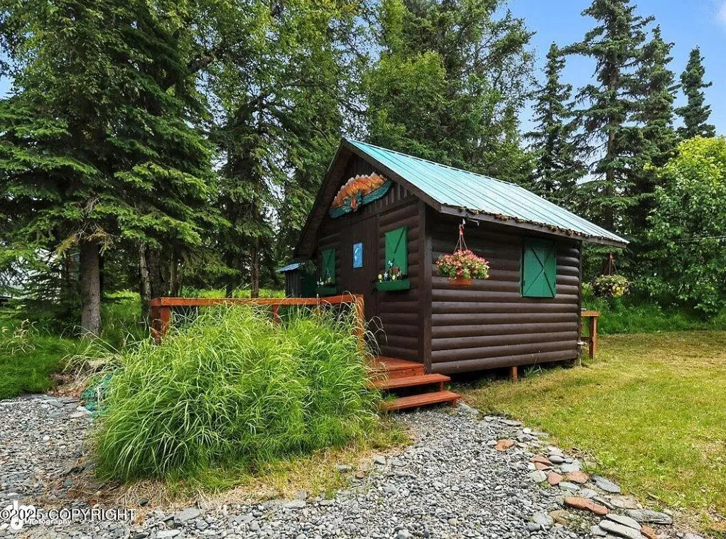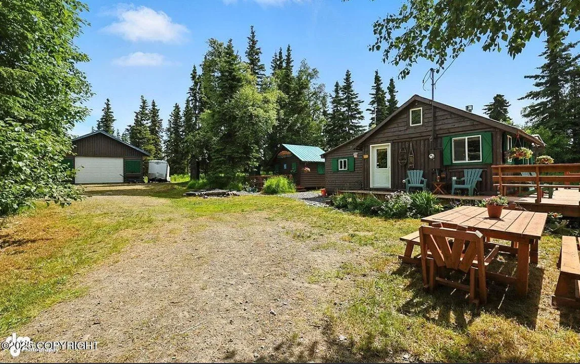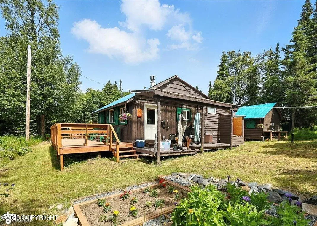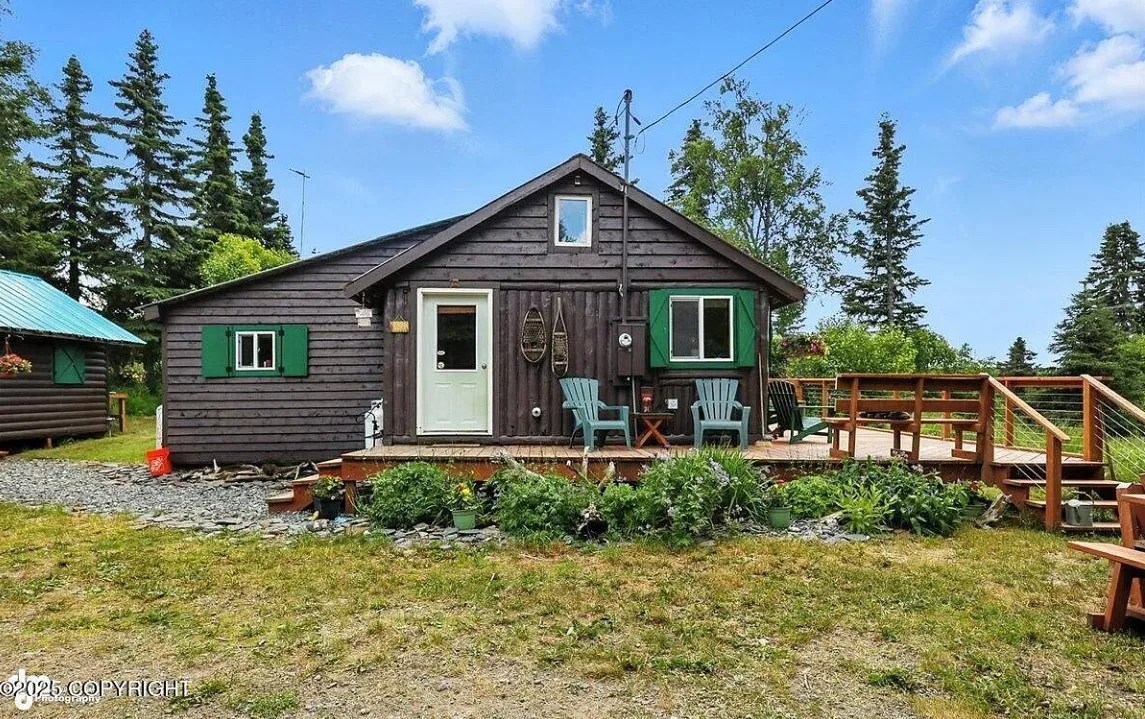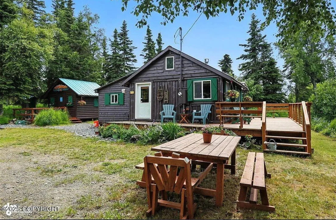 Alaska time! Love that there is a detached bunk house! Pretty setting! The house was built in 1949. It is located on 1.98 acres in Clam Gulch, Alaska. The house features a large deck, large open rooms and a log exterior. There is a detached bunk house and a detached garage. Two bedrooms, two bathrooms and 822 square feet. $250,000