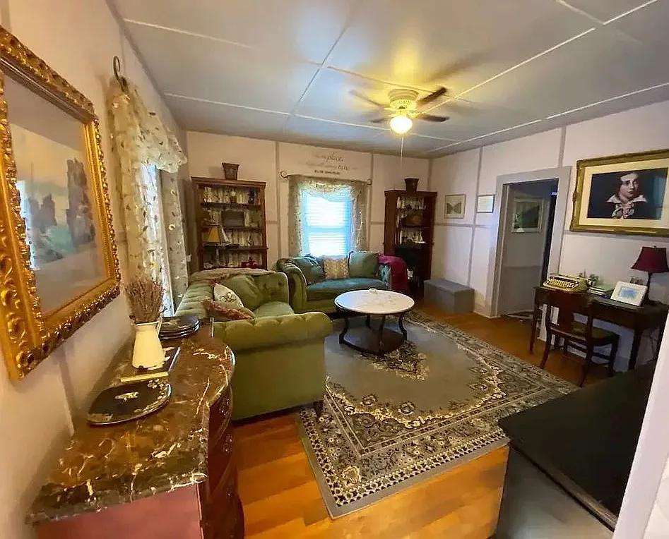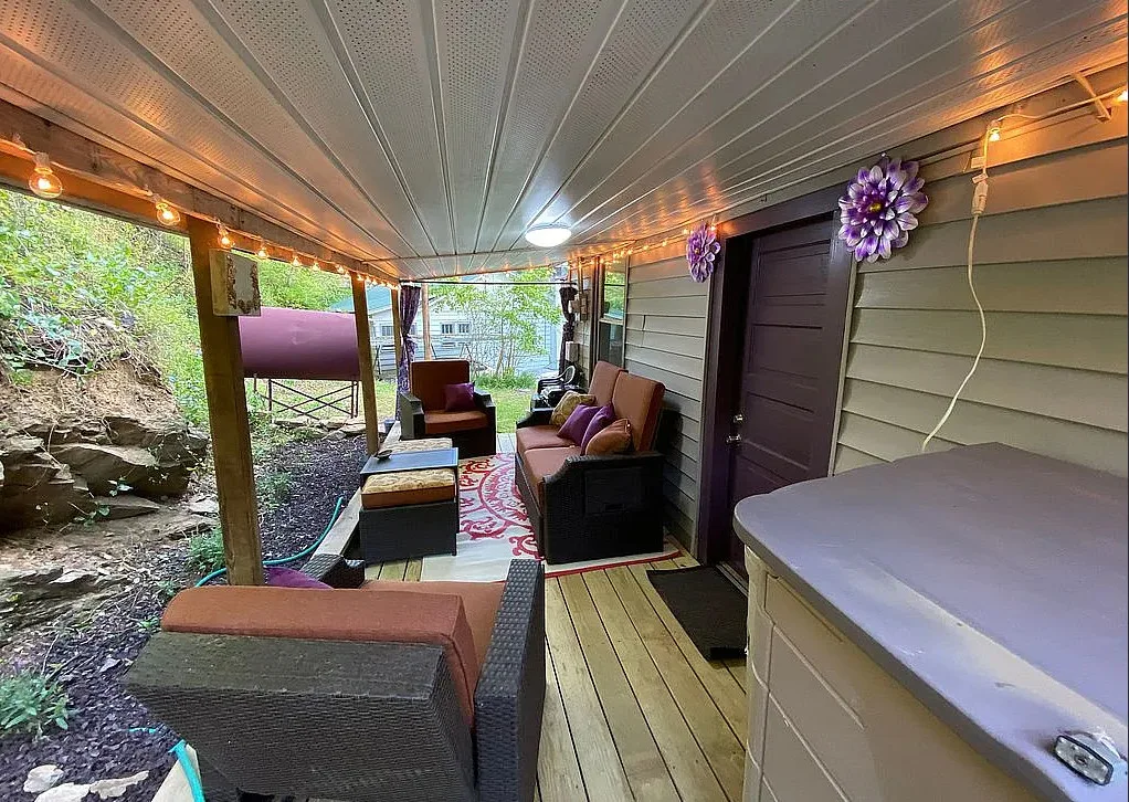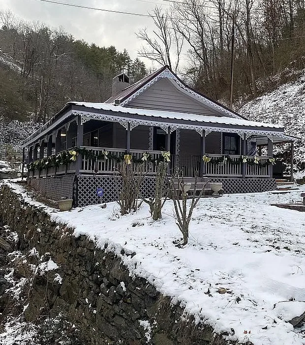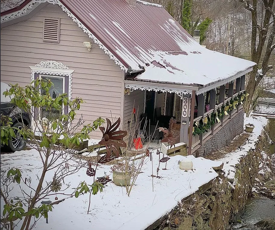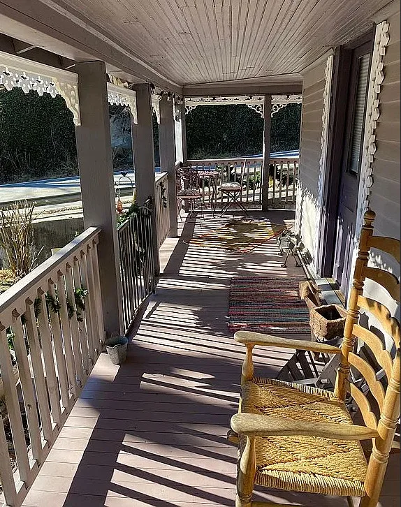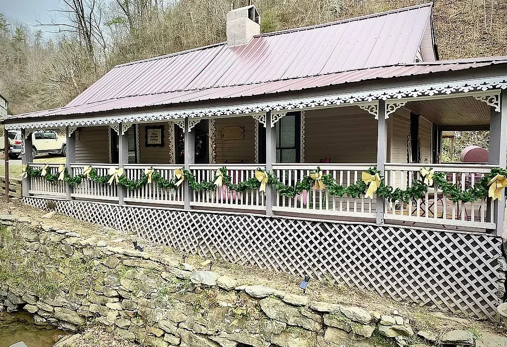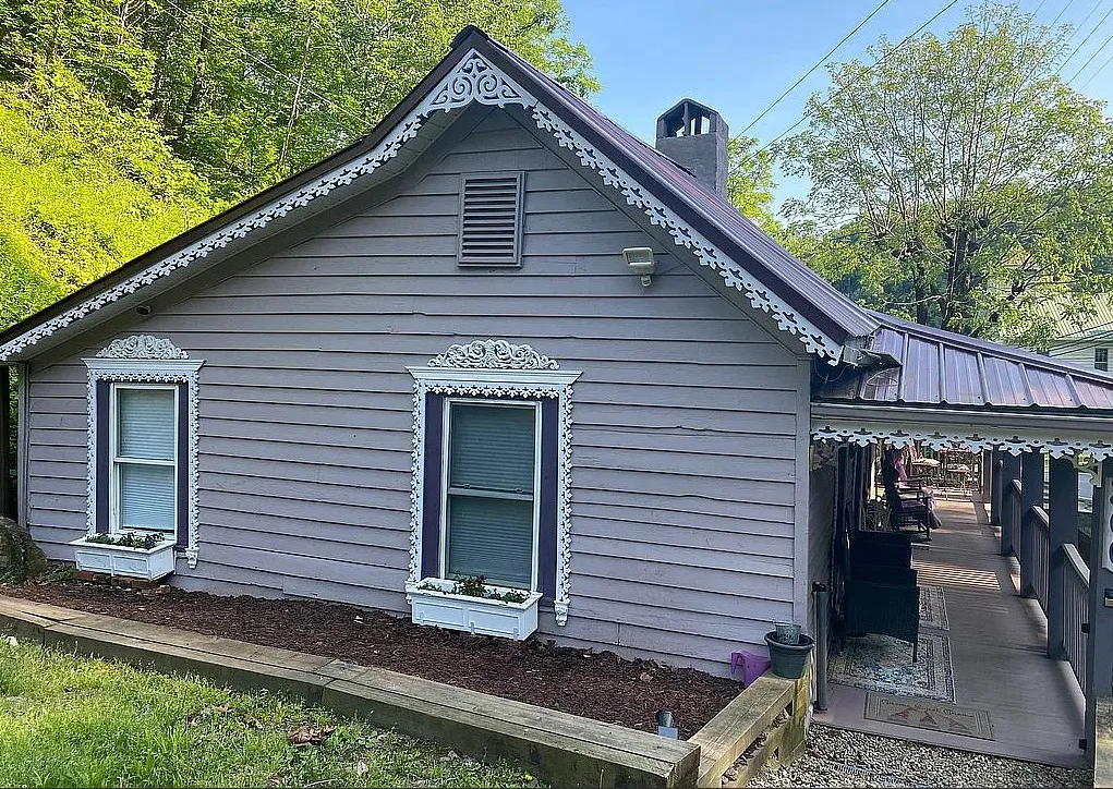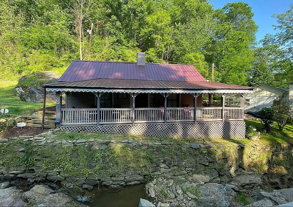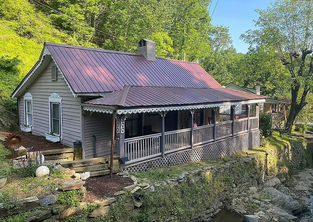 Porch goals! Love this setting and cottage! I also love how the seller said, no flooding from Helene! Known as Plum Crooked Poet’s Cottage. It was built in 1934. It is located on one acre in Marshall, North Carolina. The house features a large wrap around front porch, cute exterior trim and wood floors. The house is being offered fully furnished. It has been a successful short term rental. One bedroom, one bathroom and 880 square feet. $249,000