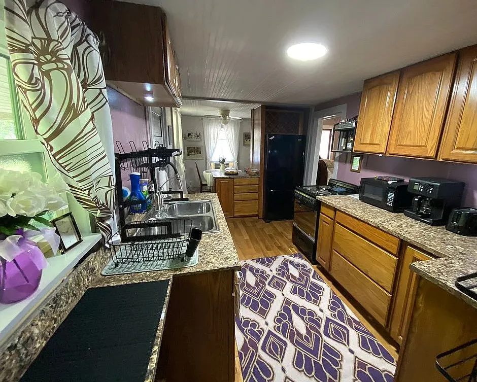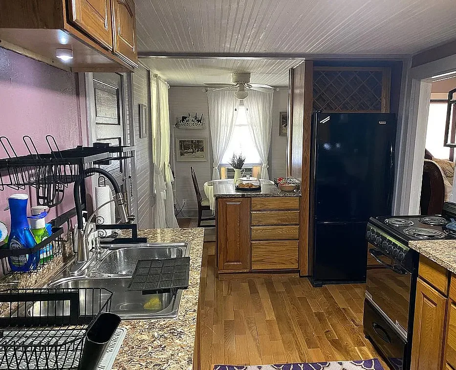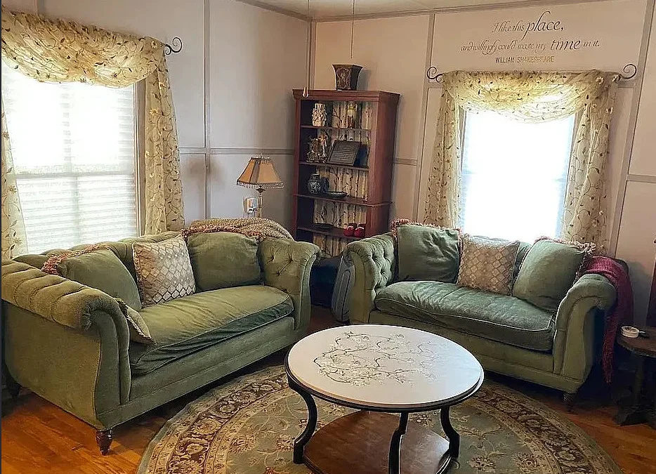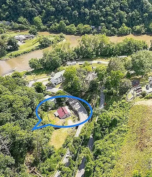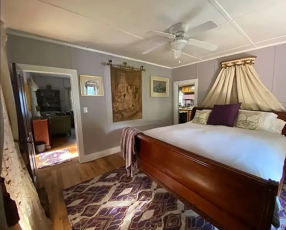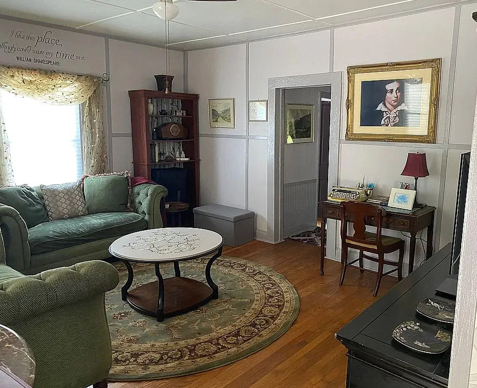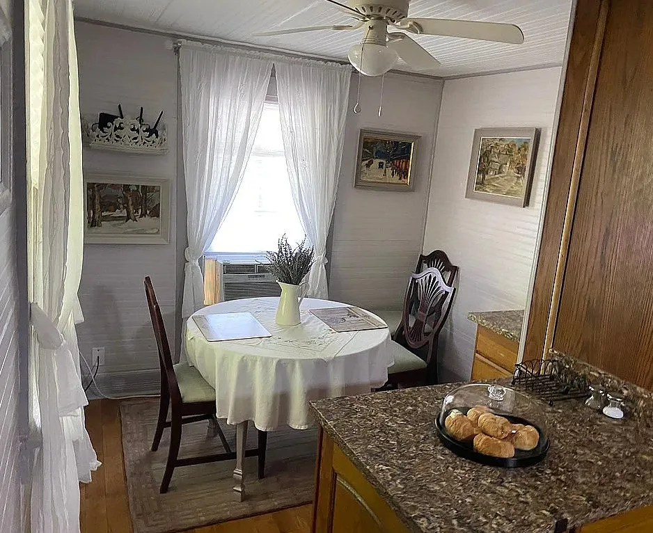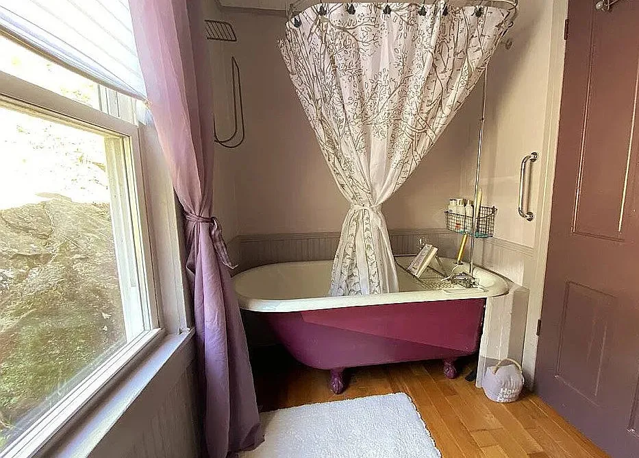 Porch goals! Love this setting and cottage! I also love how the seller said, no flooding from Helene! Known as Plum Crooked Poet’s Cottage. It was built in 1934. It is located on one acre in Marshall, North Carolina. The house features a large wrap around front porch, cute exterior trim and wood floors. The house is being offered fully furnished. It has been a successful short term rental. One bedroom, one bathroom and 880 square feet. $249,000
