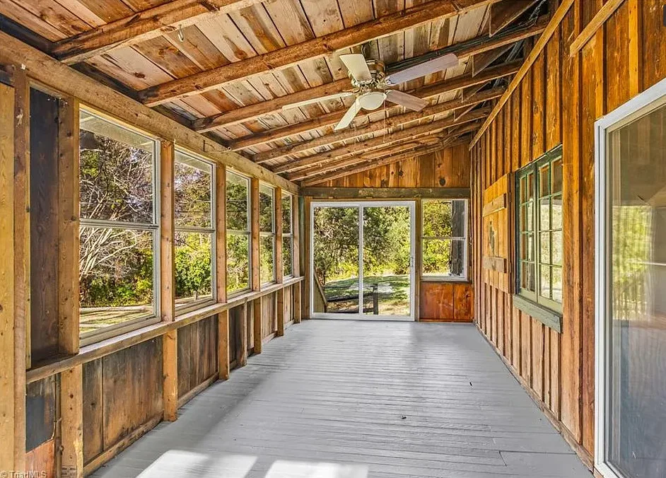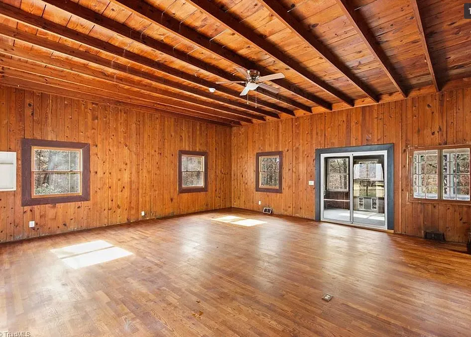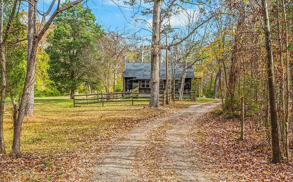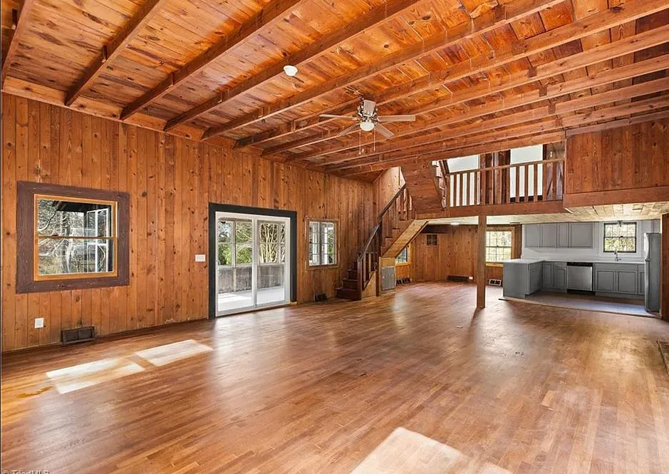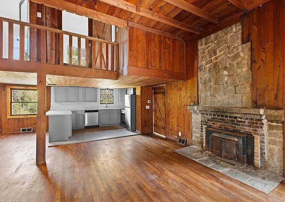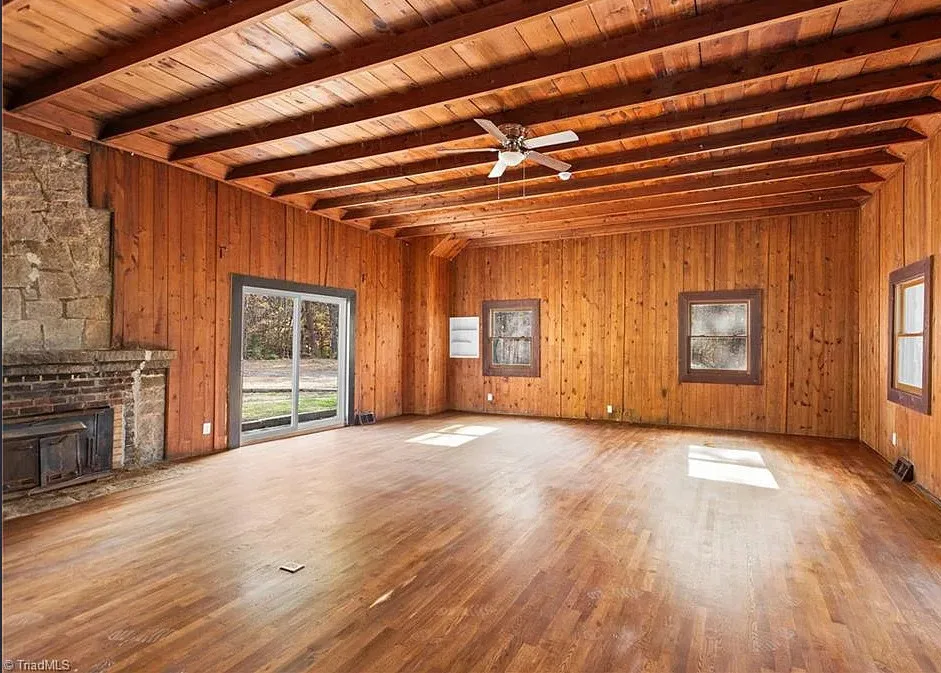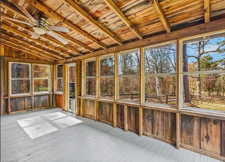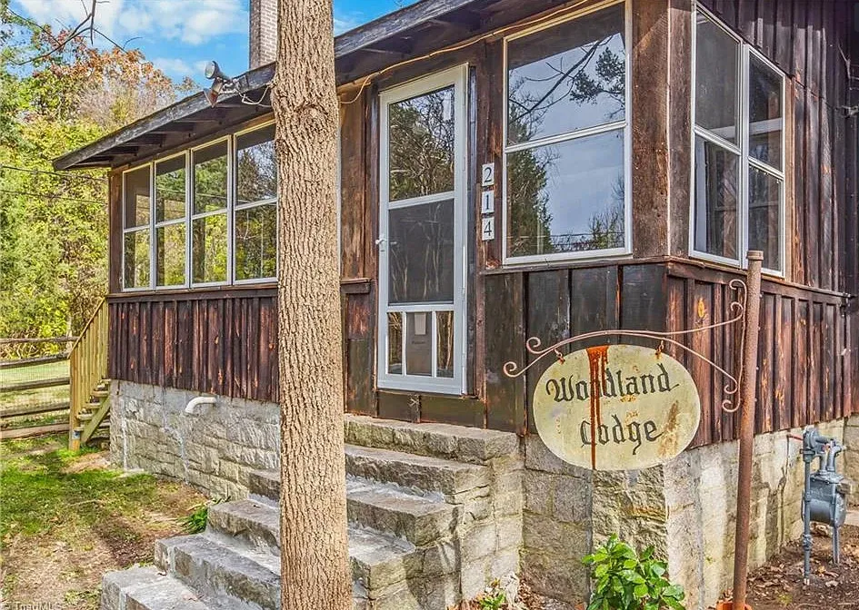 I love a house with a long driveway! I bet this one is really pretty in spring and summer! This is known as Woodland Lodge. It was built in 1930. Woodland Lodge is located o 1.47 acres in Granite Quarry, North Carolina. The house features a large stone chimney, enclosed porch, large fireplace, wood floors, exposed beams and rich woodwork. I am not a fan of that kitchen. It needs a total overhaul. This price seems reasonable. Two bedrooms, two bathrooms and 1,696 square feet. $250,000