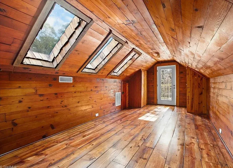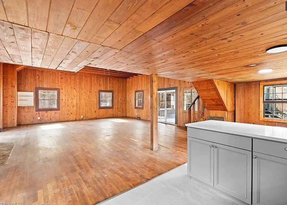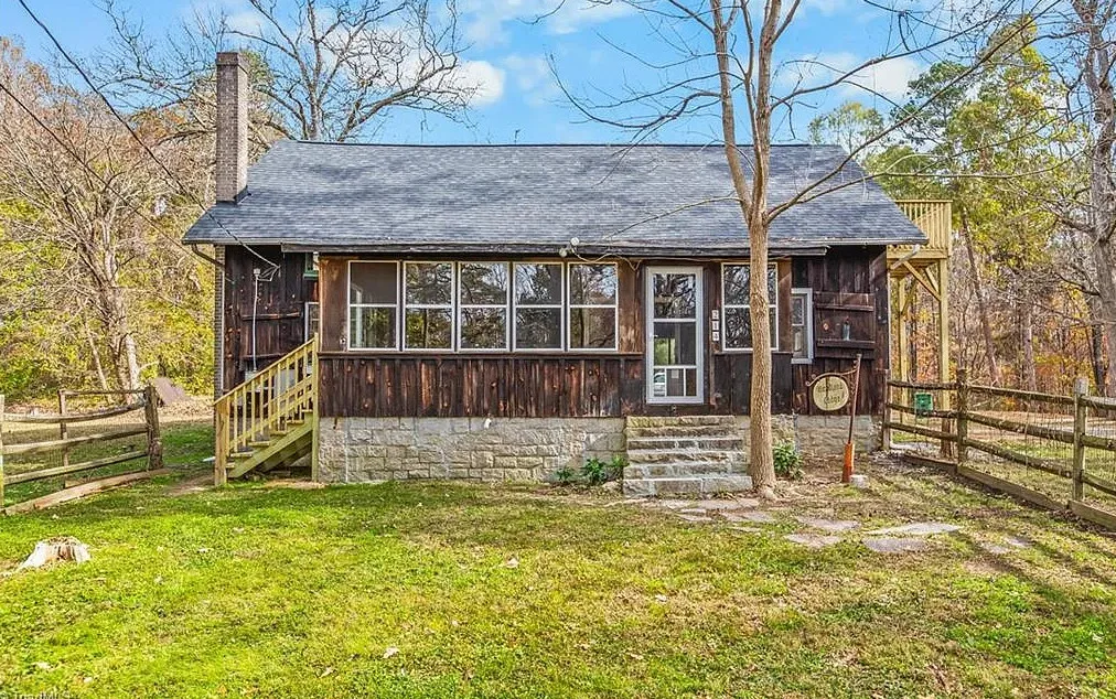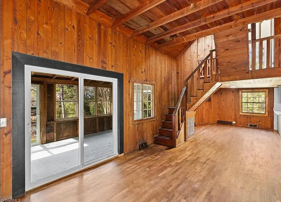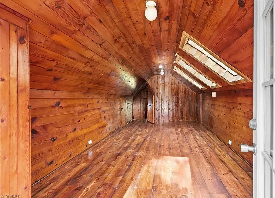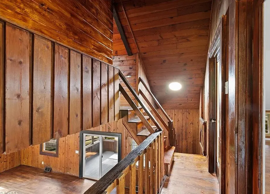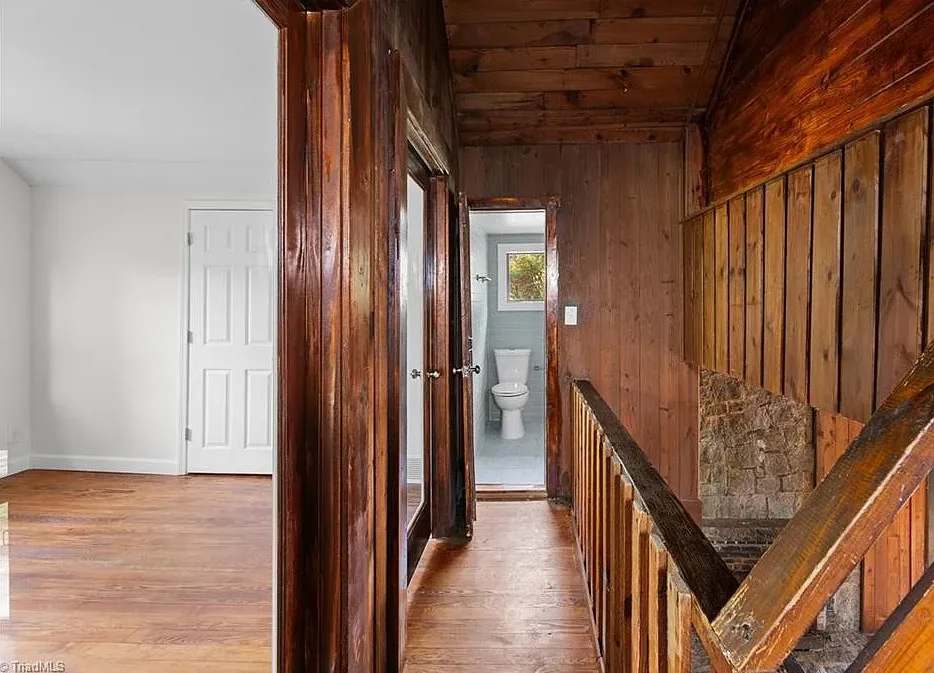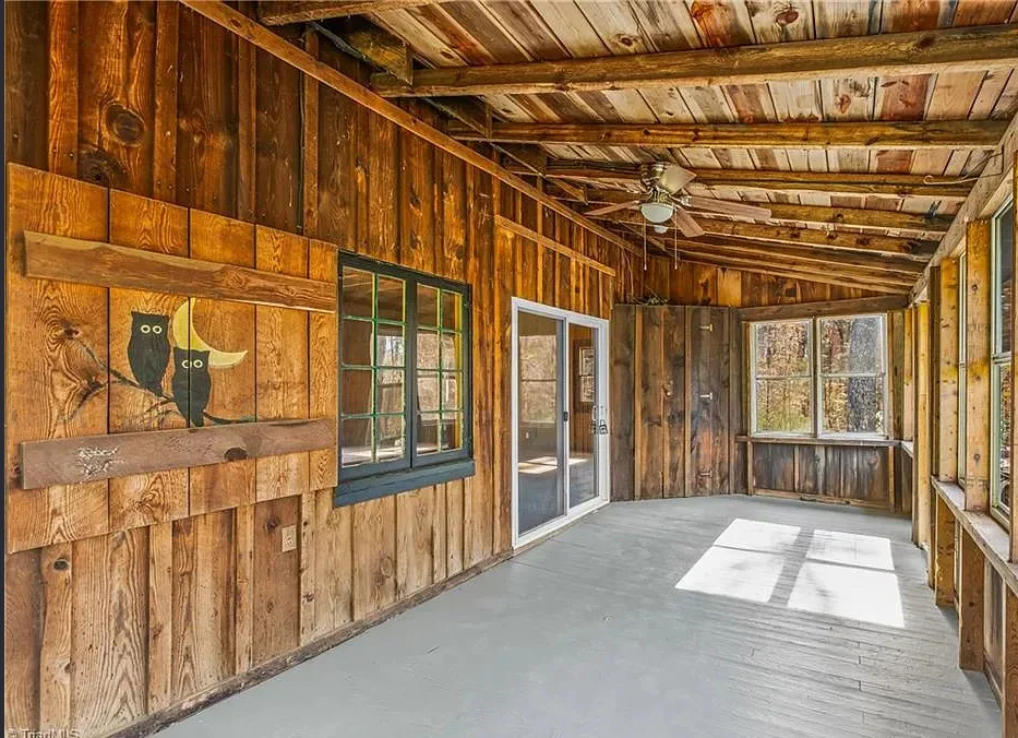 I love a house with a long driveway! I bet this one is really pretty in spring and summer! This is known as Woodland Lodge. It was built in 1930. Woodland Lodge is located o 1.47 acres in Granite Quarry, North Carolina. The house features a large stone chimney, enclosed porch, large fireplace, wood floors, exposed beams and rich woodwork. I am not a fan of that kitchen. It needs a total overhaul. This price seems reasonable. Two bedrooms, two bathrooms and 1,696 square feet. $250,000
