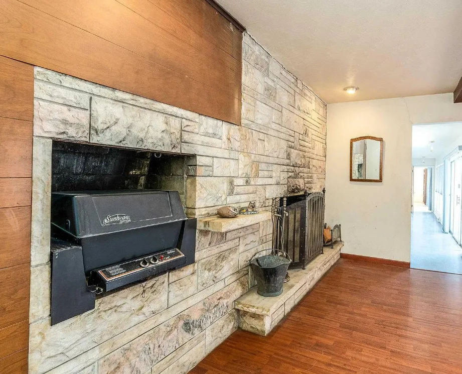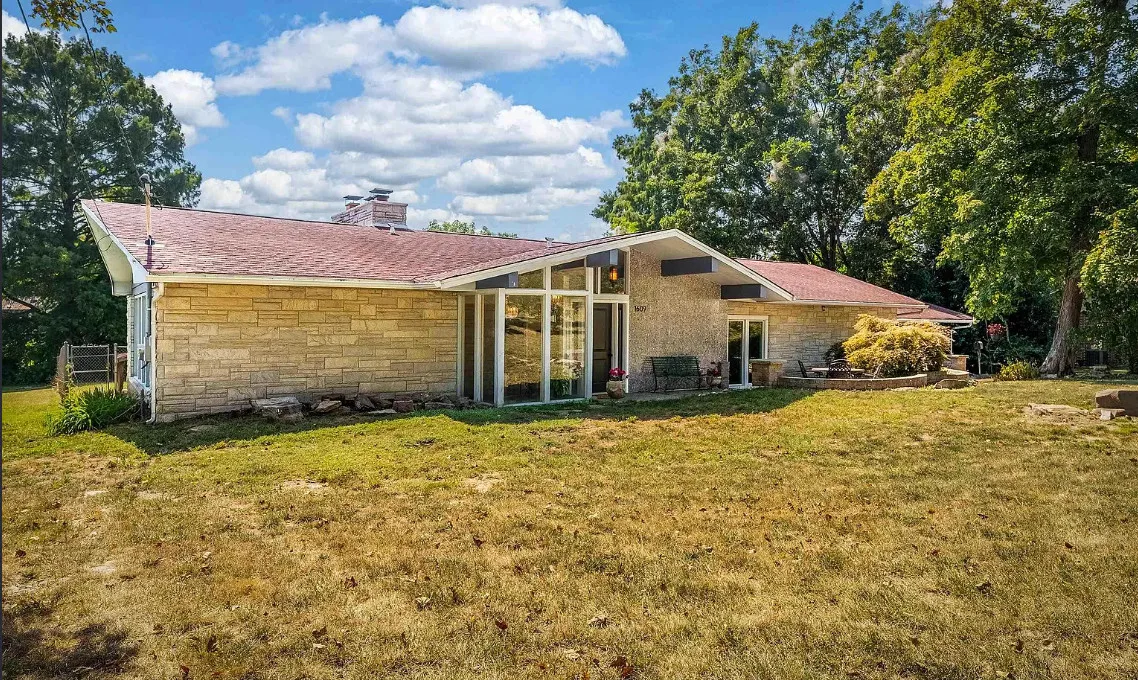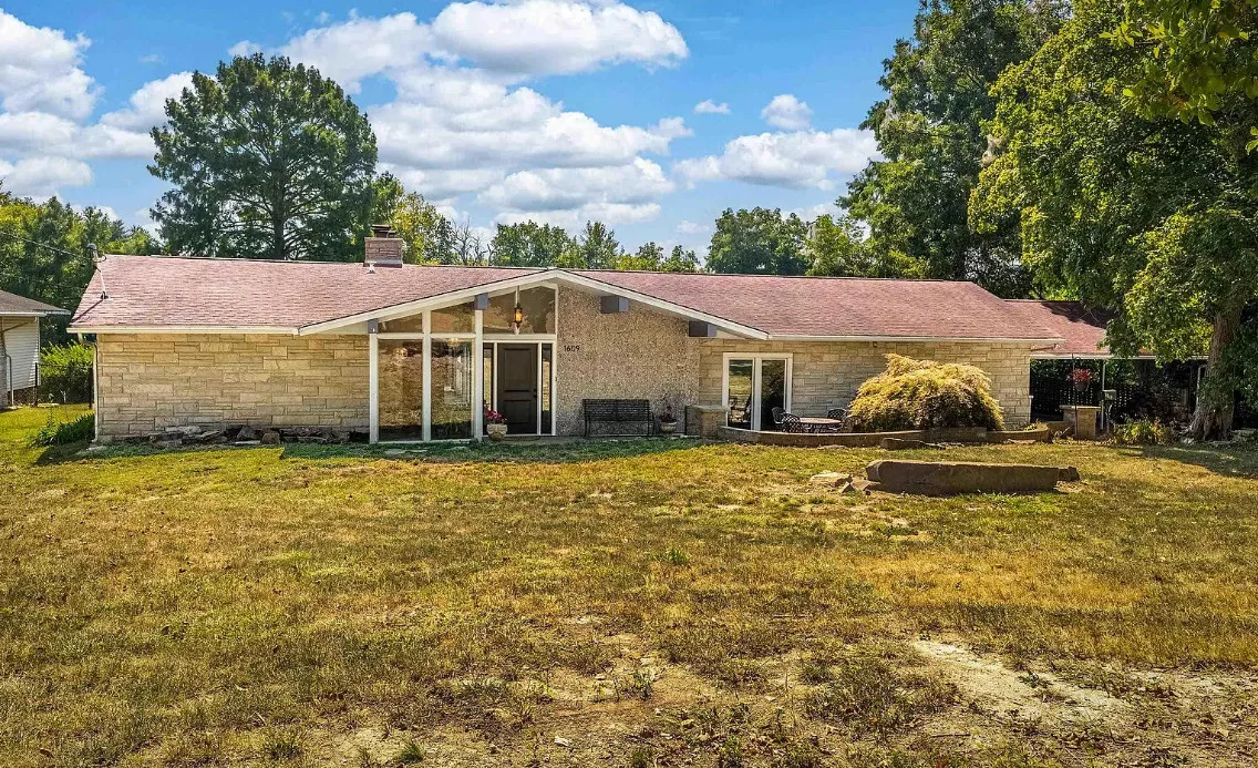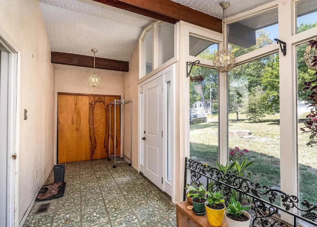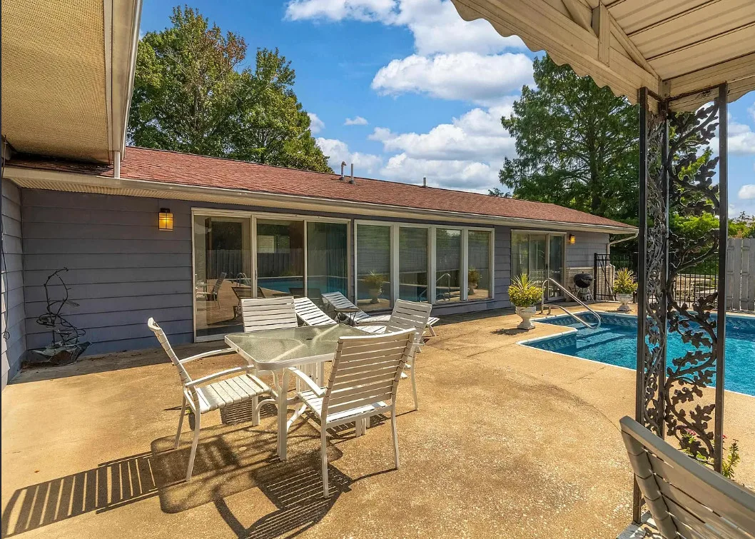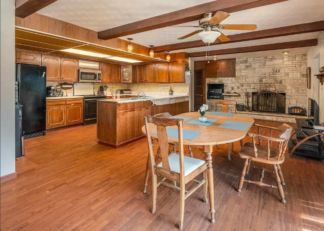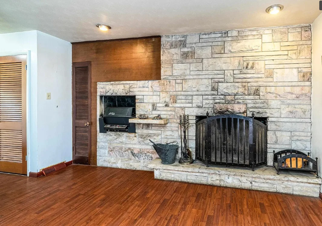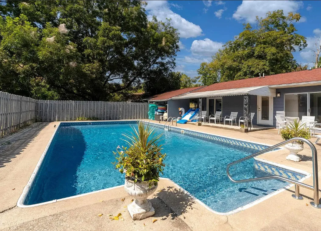 This sure would be a fun house to work on! The pool is nice! The house was built in 1960. It is located in Murphysboro, Illinois. The house features a covered front porch, large patio, neat entryway and a large fireplace. How about that built-in grill beside the fireplace. There are exposed beams and a large kitchen. The backyard is fenced with a large pool and patio. Four bedrooms, three bathrooms and 3,267 square feet. $150,000