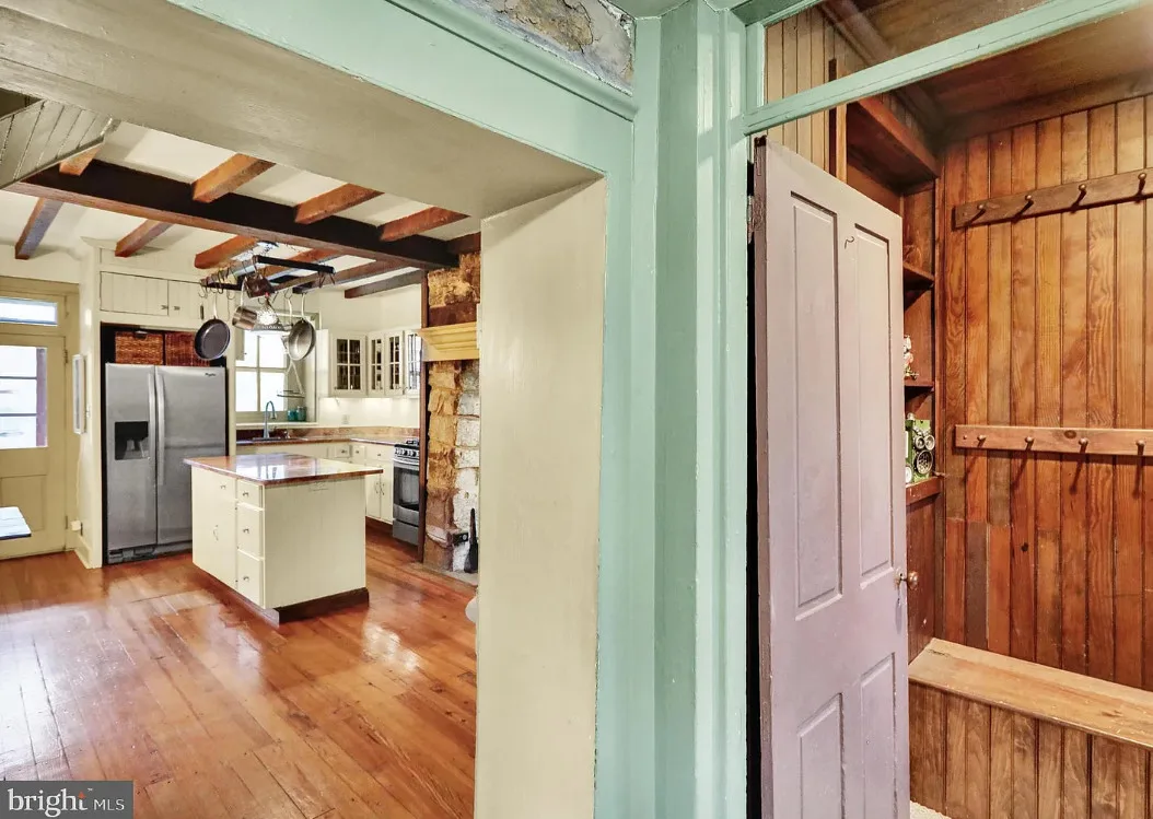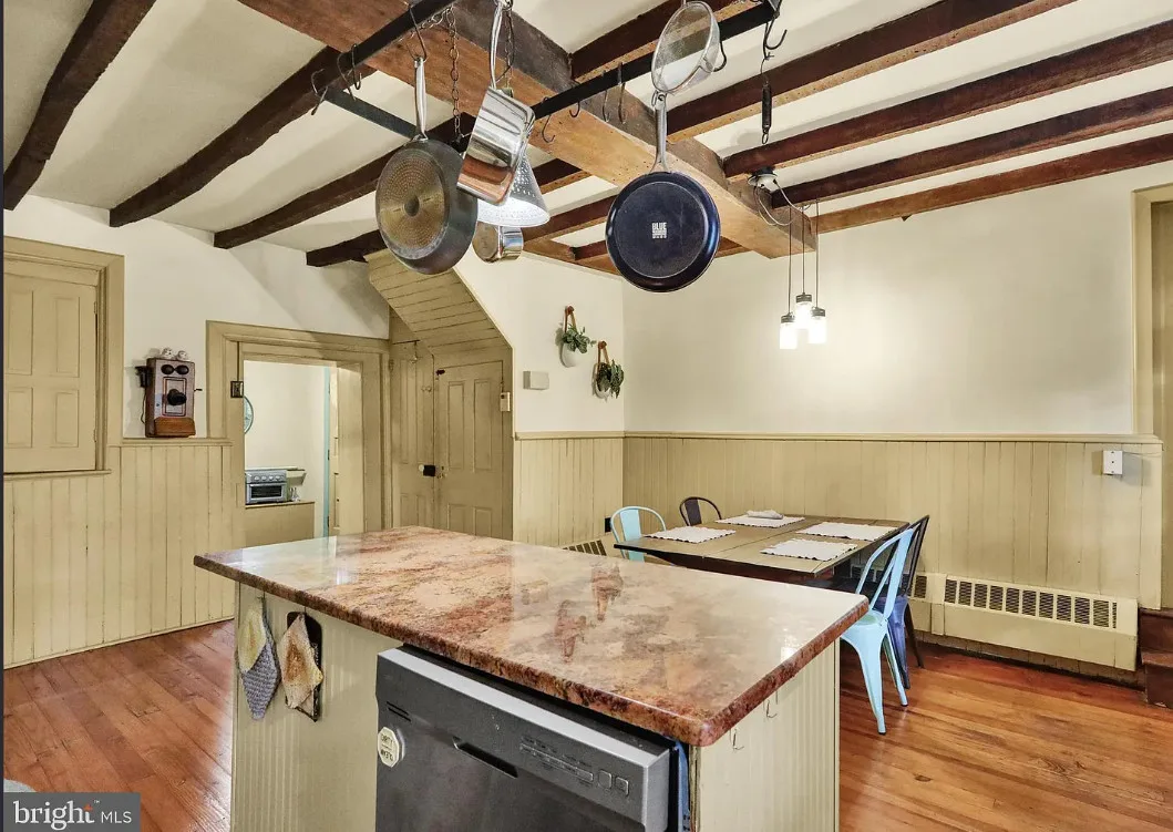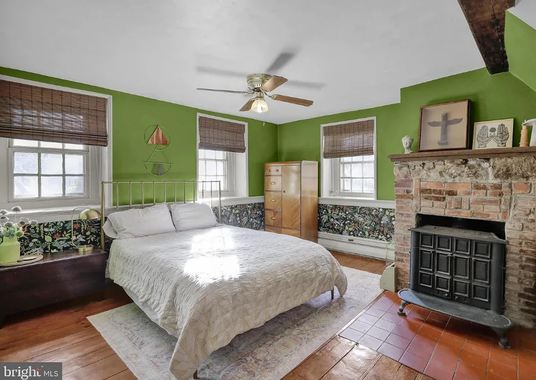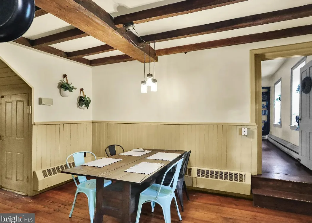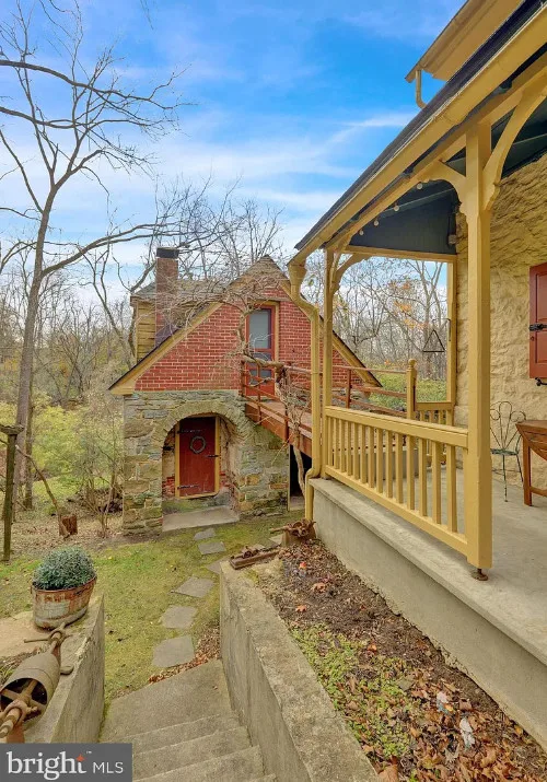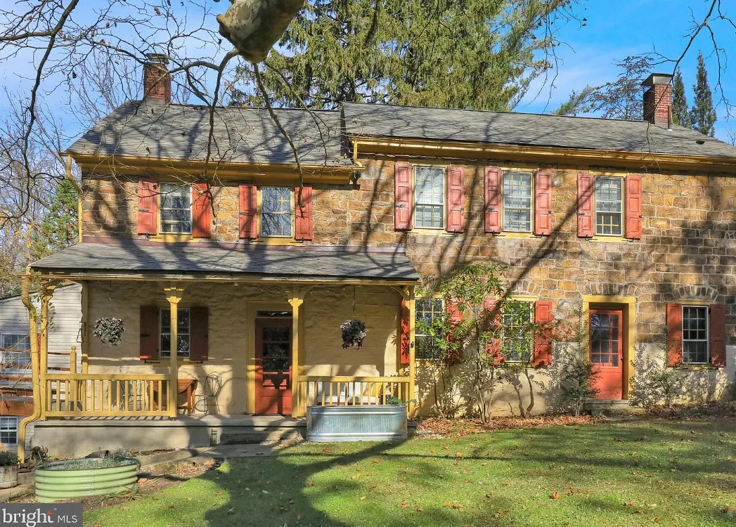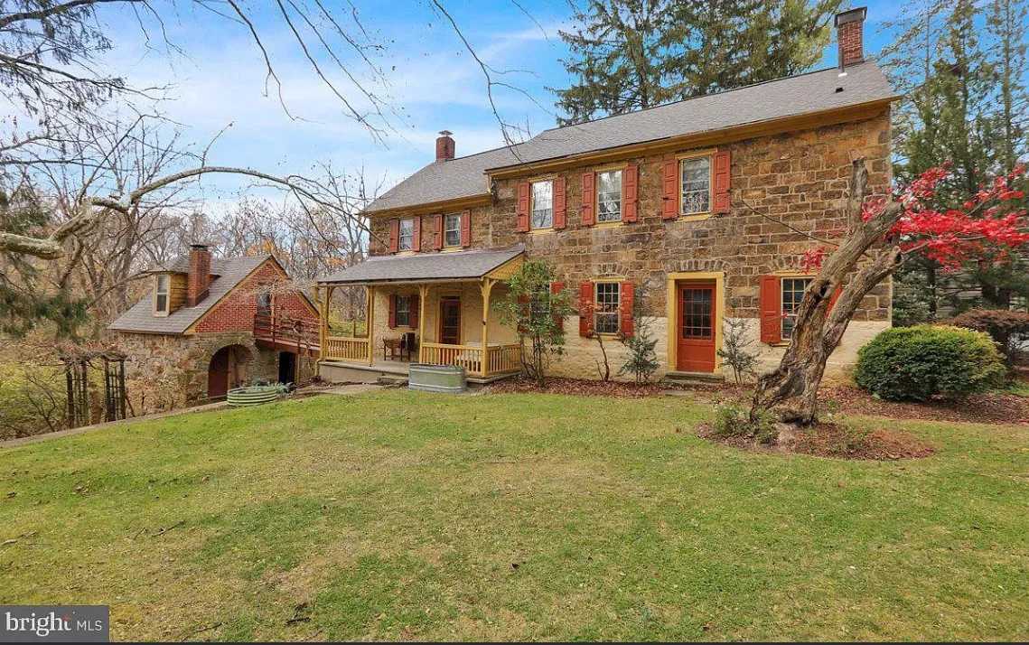 This is a pretty cool looking house! There is a guest cottage on the property. The house was built in 1812. It is located on .88 acre in Reading, Pennsylvania. The house features a covered porch, wood floors, exposed beams, huge fireplace, wainscoting, brick fireplace, french doors and built-in bookshelves. The old smokehouse has been converted into a guest house. There is a detached garage on the property. Three bedrooms, three bathrooms and 2,603 square feet. $484,900