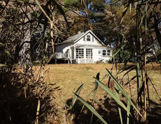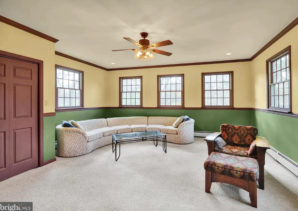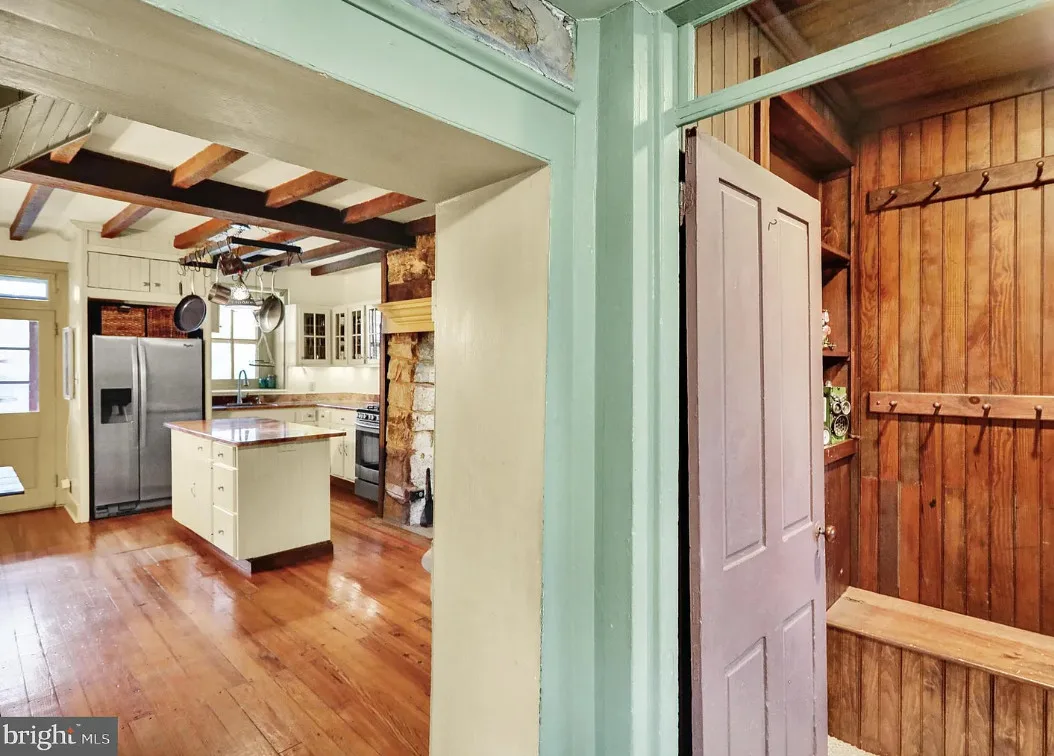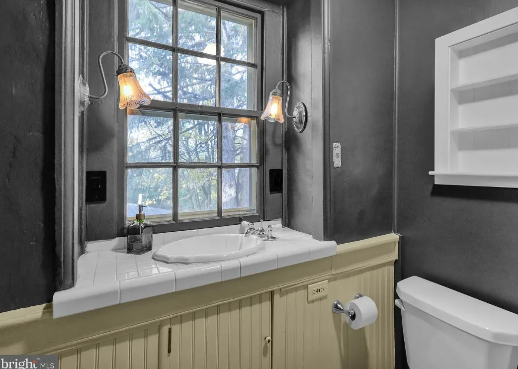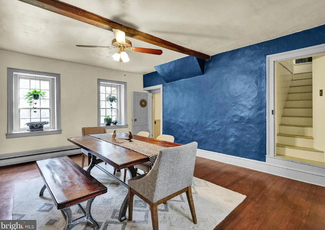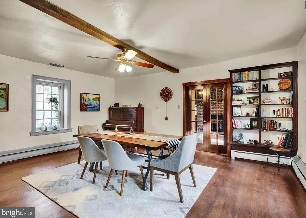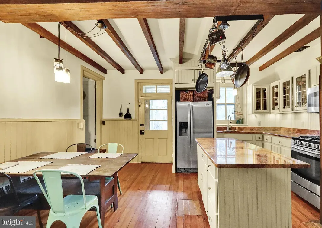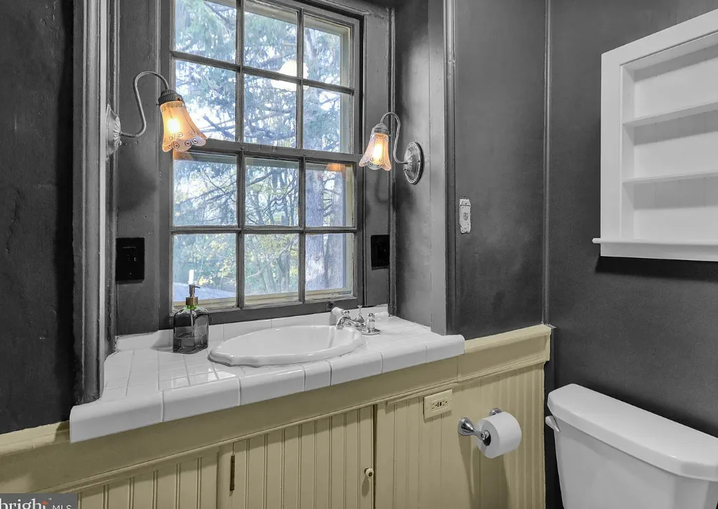 This is a pretty cool looking house! There is a guest cottage on the property. The house was built in 1812. It is located on .88 acre in Reading, Pennsylvania. The house features a covered porch, wood floors, exposed beams, huge fireplace, wainscoting, brick fireplace, french doors and built-in bookshelves. The old smokehouse has been converted into a guest house. There is a detached garage on the property. Three bedrooms, three bathrooms and 2,603 square feet. $484,900