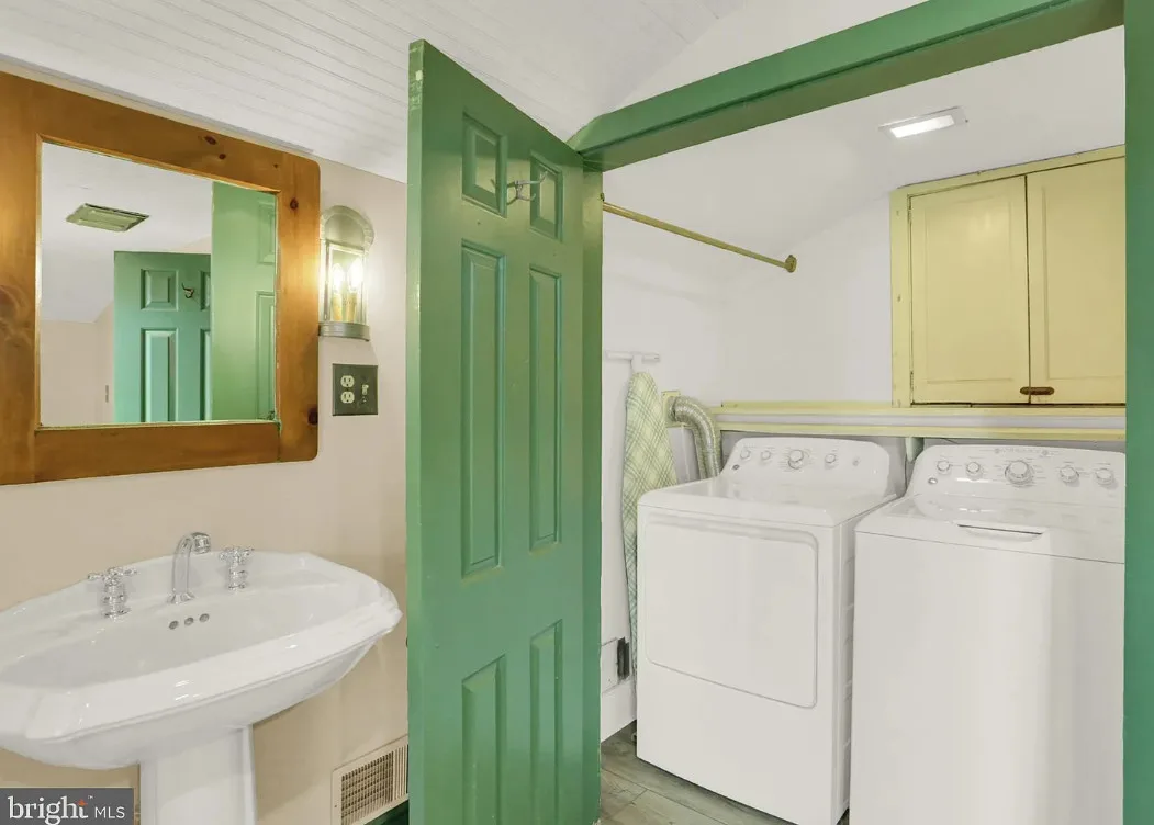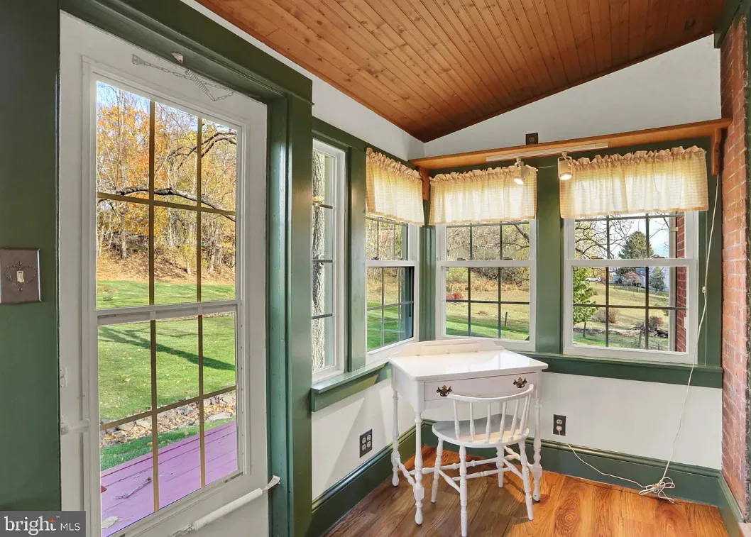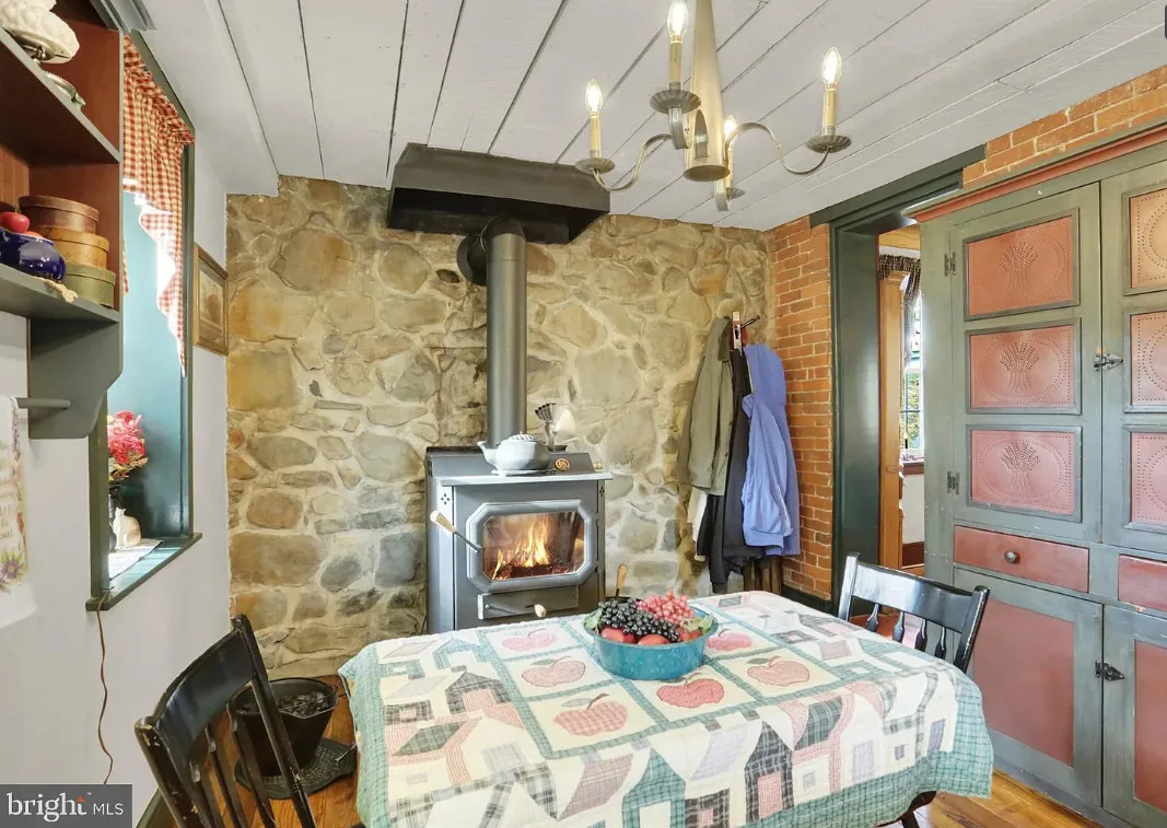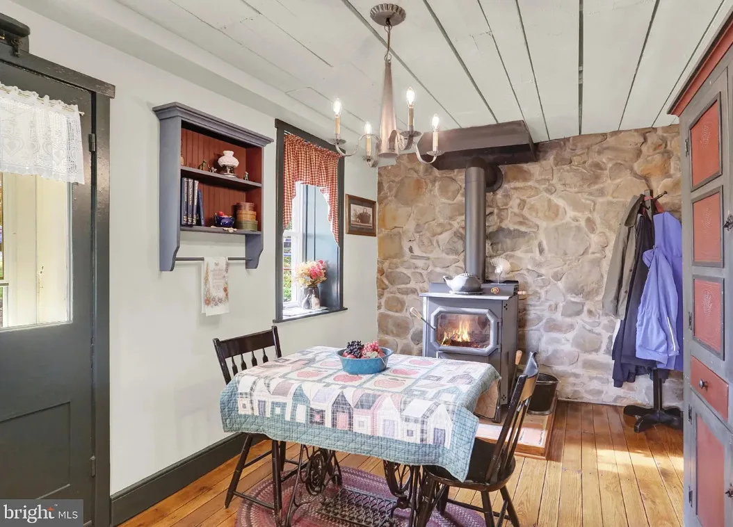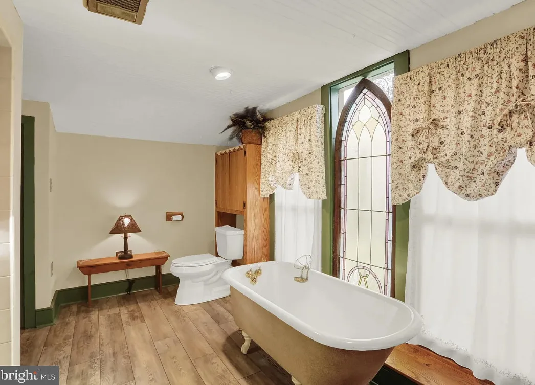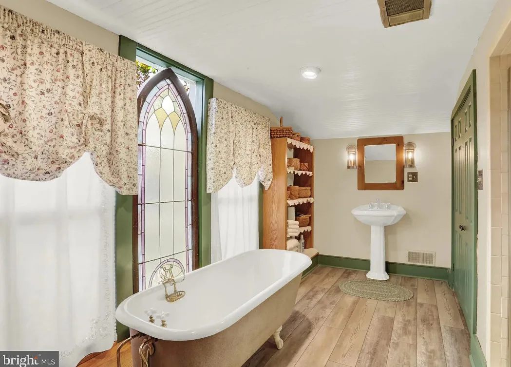 I love this house! Such a great interior! Love the stained glass in the bathroom! The house was built in 1900. It is located on 1.73 acres in Lewisberry, Pennsylvania. The house features a small covered front porch, updated kitchen, original wood floors, exposed beams, stone wall, stone fireplace, baseboards, sunroom, stained glass window and a claw foot tub. There are two detached storage sheds. Two bedrooms, one bathroom and 1,428 square feet. $275,000