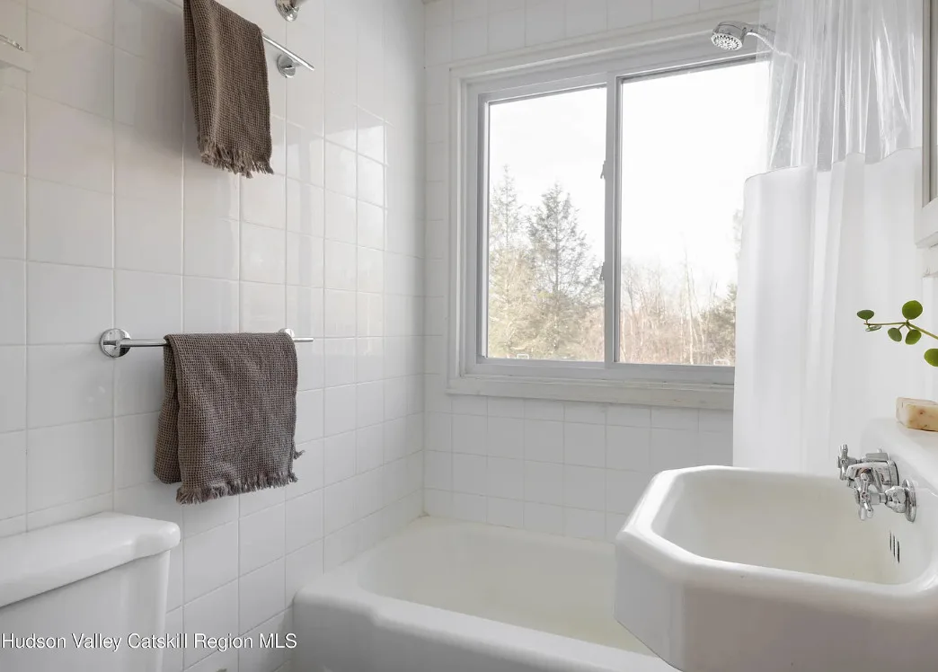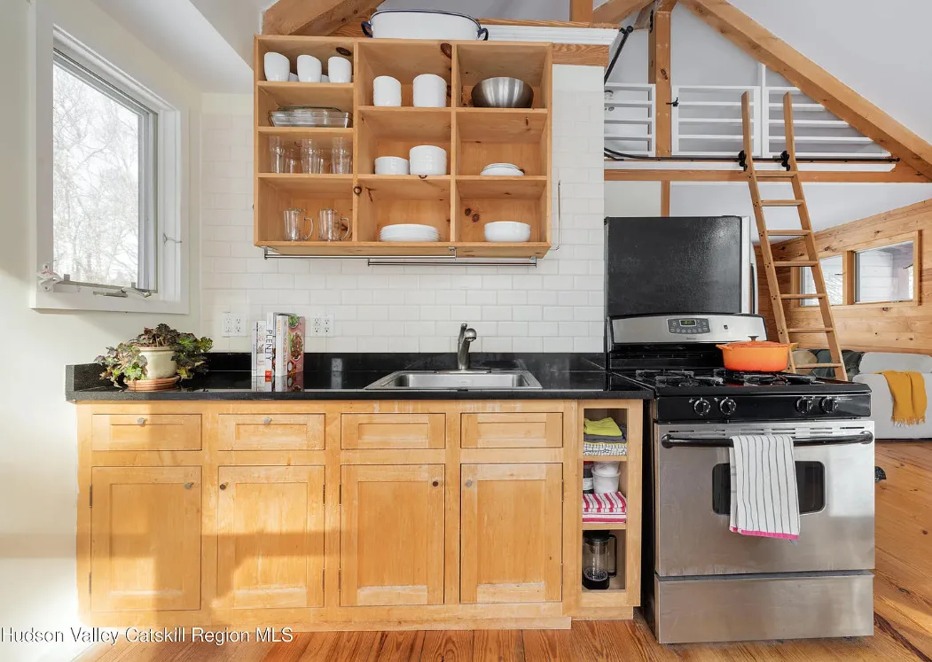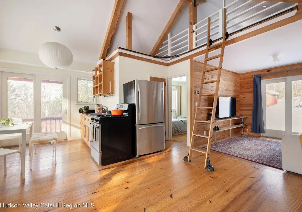 This house has a nice interior! Pretty setting too. The house was built in 1957. It is located on 3.2 acres in Grahamsville, New York. The house features a small covered porch, wood floors, vaulted ceiling, loft area and a nice bathroom sink. There is a detached two car garage and a detached storage shed. One bedroom, one bathroom and 528 square feet. $265,000