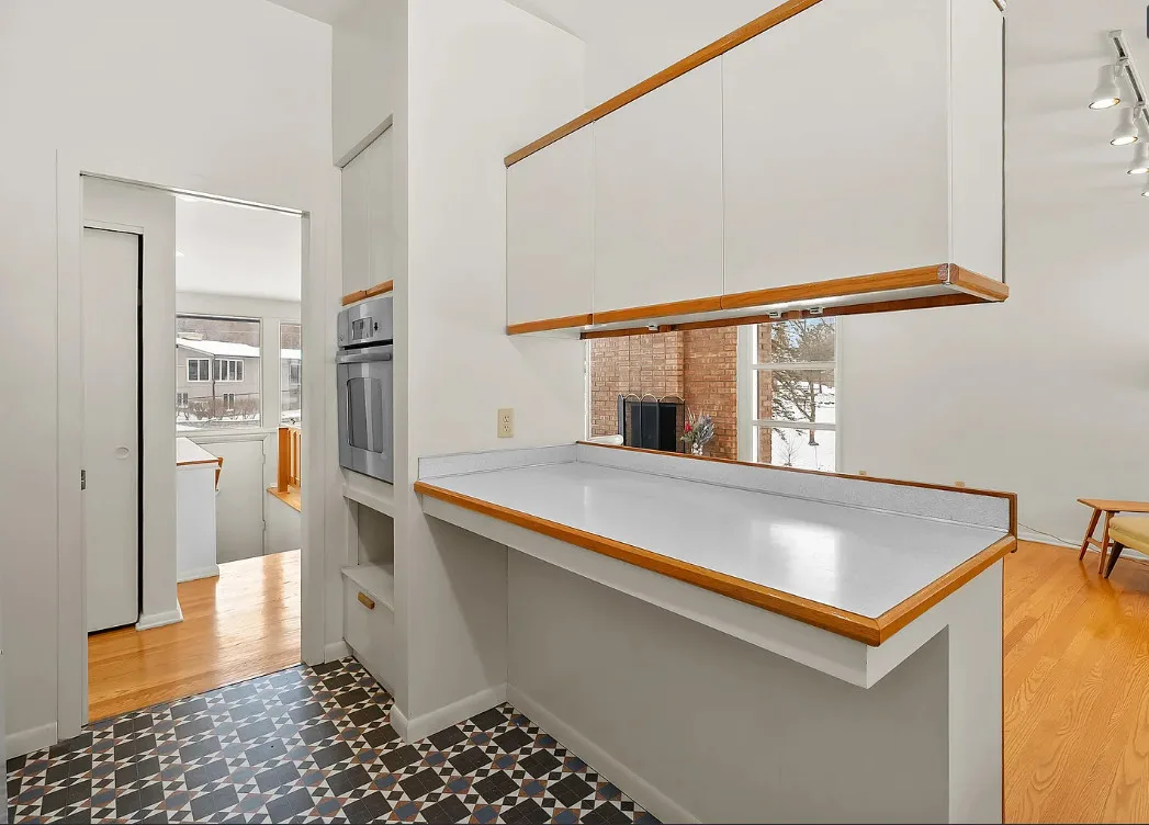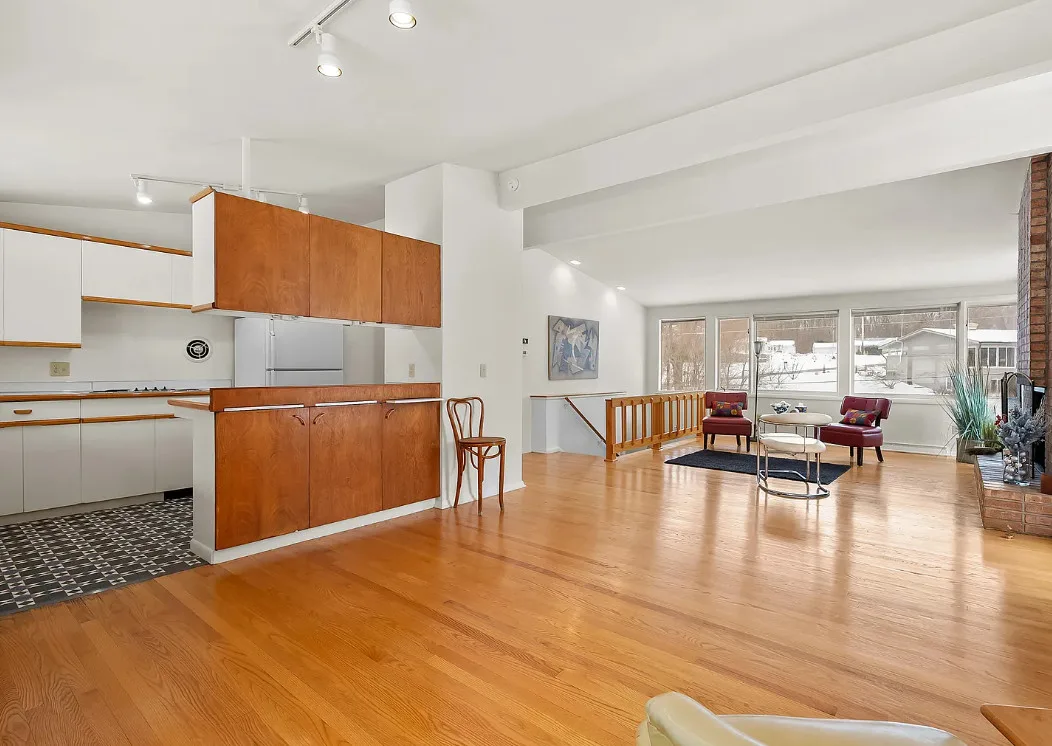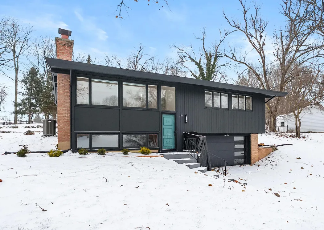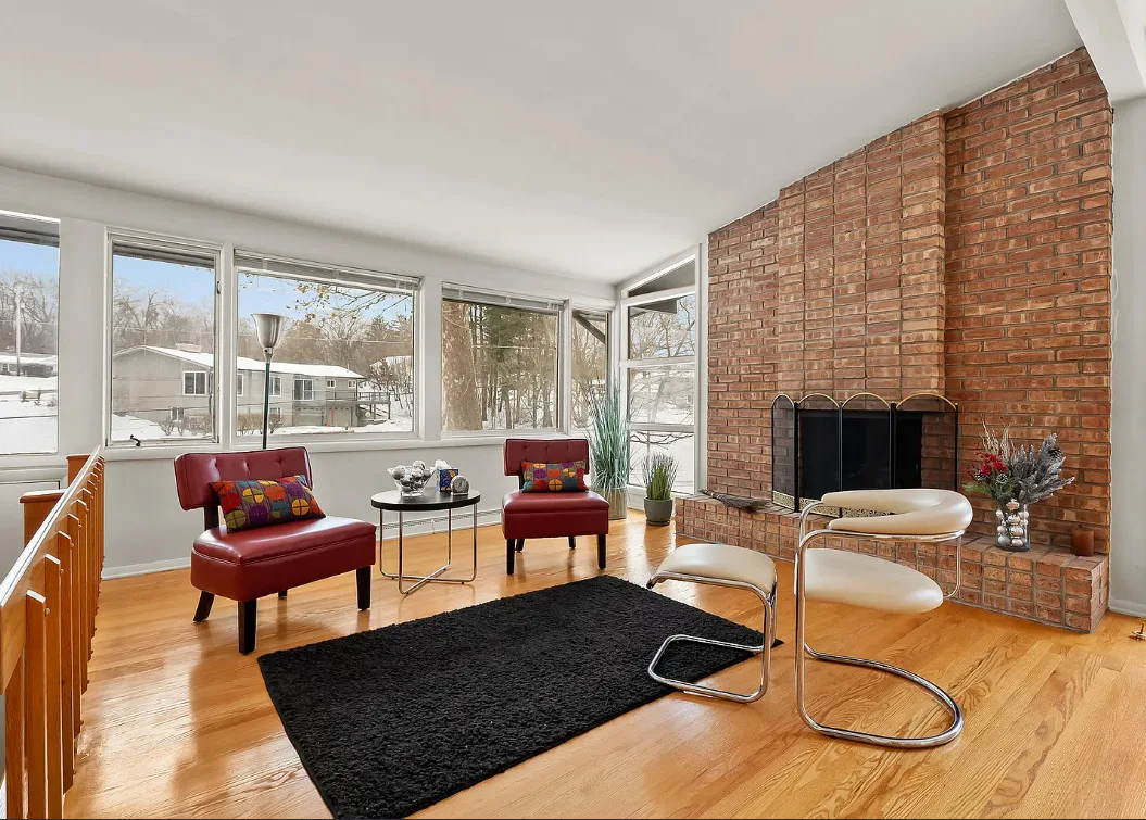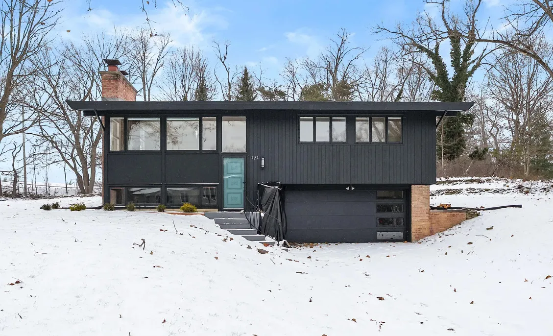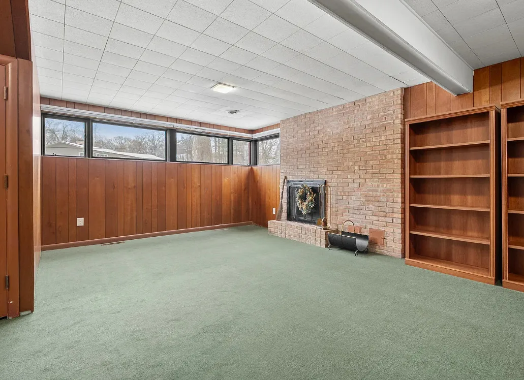 Love the mid-century look of the exterior! The interior could use some mid-century infused back in. The house was built in 1957. It is located on .53 acre in Parchment, Michigan. The house features an attached garage, wood floors, brick fireplace, built-in bookshelves and a basement. There is a large backyard. Three bedrooms, two bathrooms and 1,432 square feet. $259,700