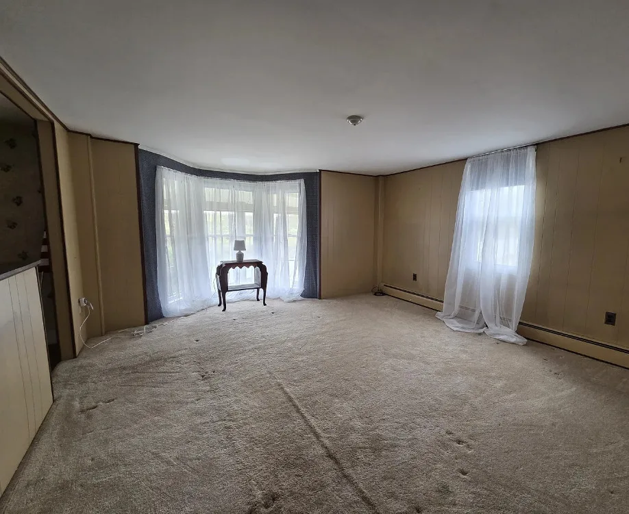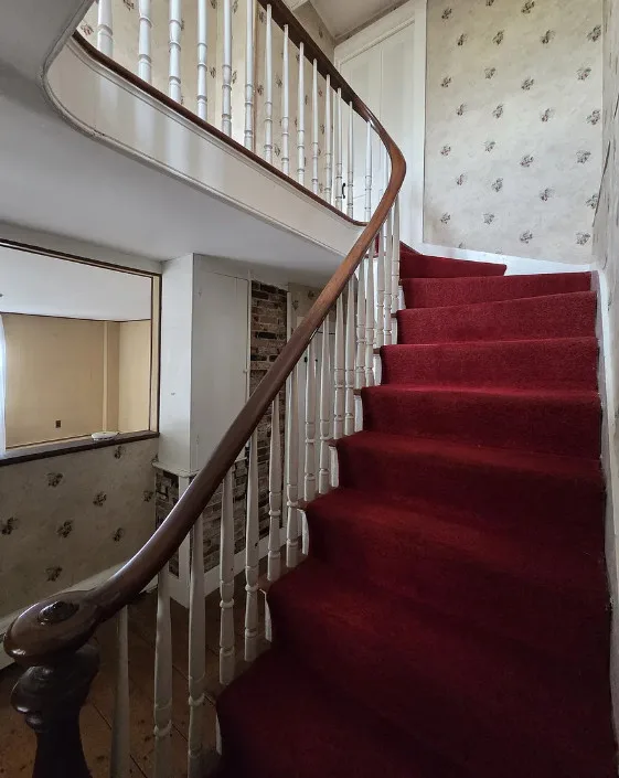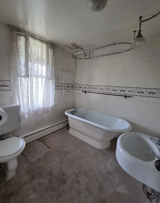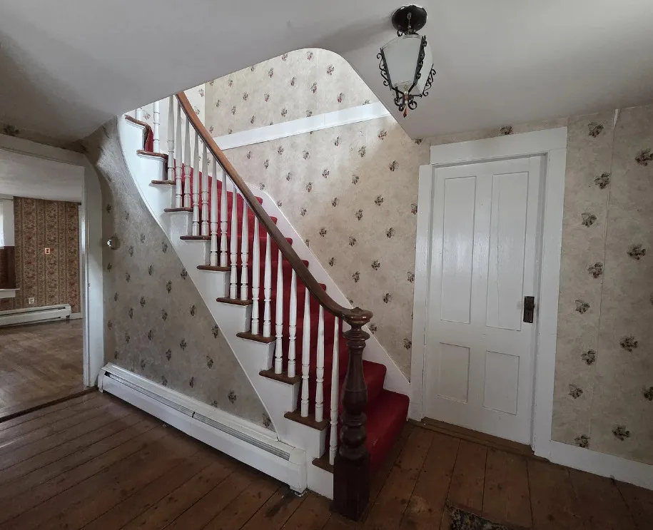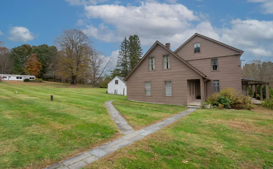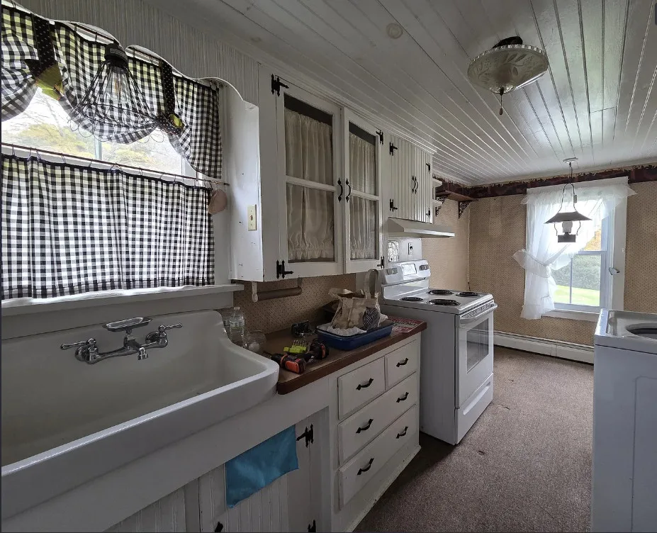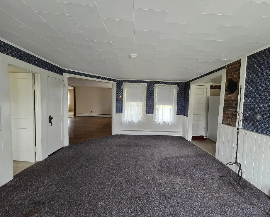 There are 50-60 mature blueberry bushes on this property! 200 year old apple trees also. The listing says this house has foundation issues. At first glance, I’m not seeing anything glaringly obvious. Going to guess there is a basement and that is where it’s most noticeable. The house was built in 1785. It is located on four acres in Windham, Connecticut. The house features two covered front porches, some wood floors and a nice staircase. Most likely there are wood floors underneath all of the carpeting. There are a few outbuildings on the property. Street view is really pretty! Six bedrooms, two bathrooms and 2,634 square feet. $179,900