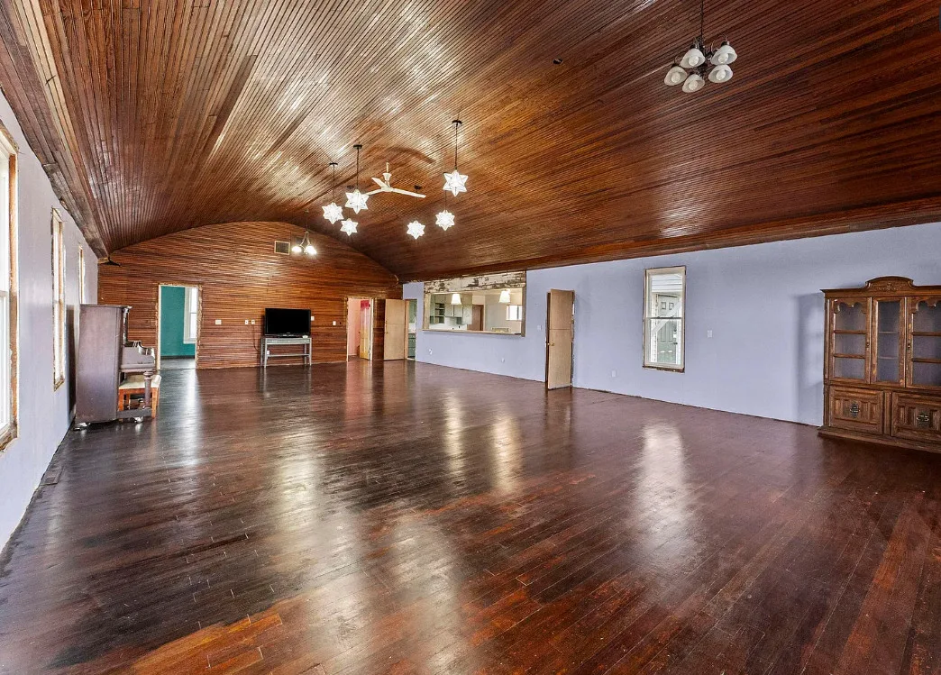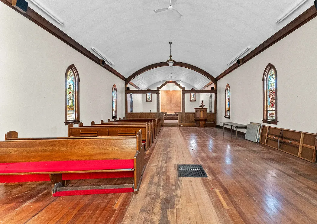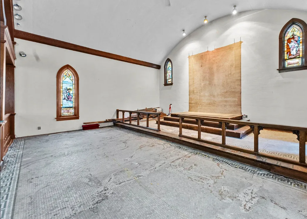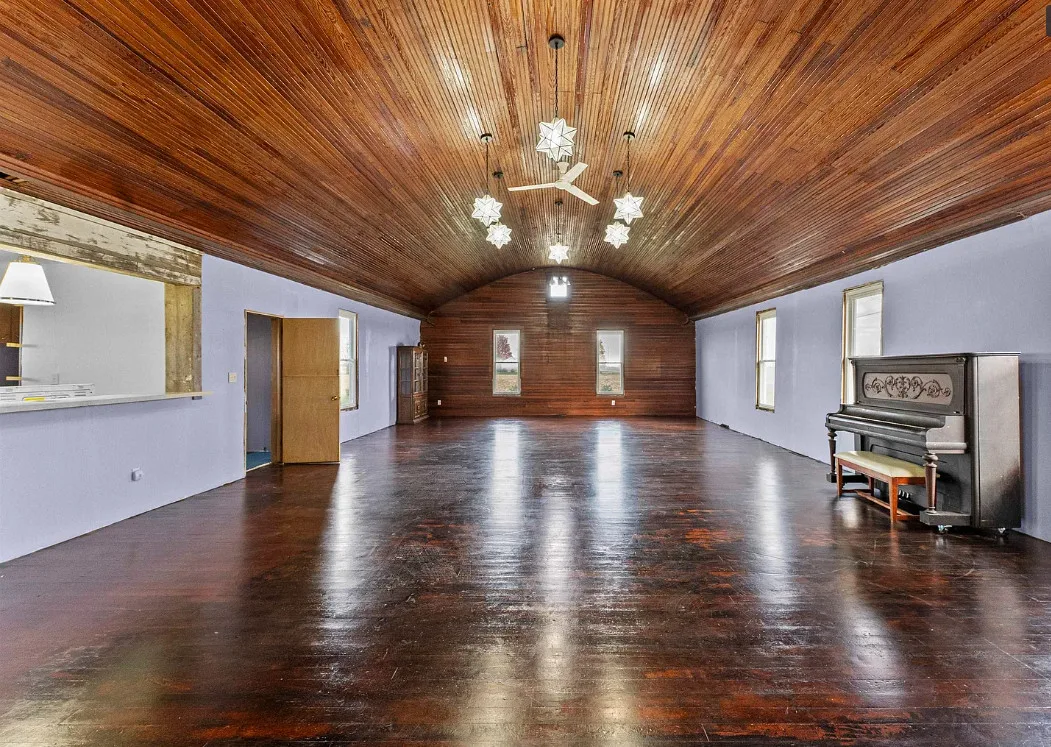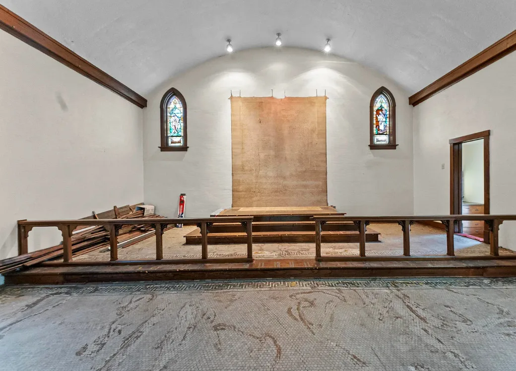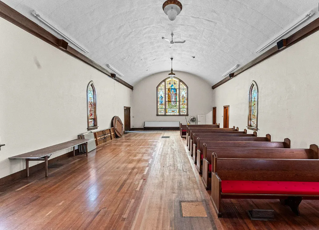 Unique looking former church! Originally the St. John’s church. It was built in 1919. It is located on 2.5 acres in Aledo, Illinois. The church is now zoned residential. There is a large room with vaulted ceiling, some wood floors and pretty stained glass. Love the room with all of the stained glass windows. 4,996 square feet. $125,000